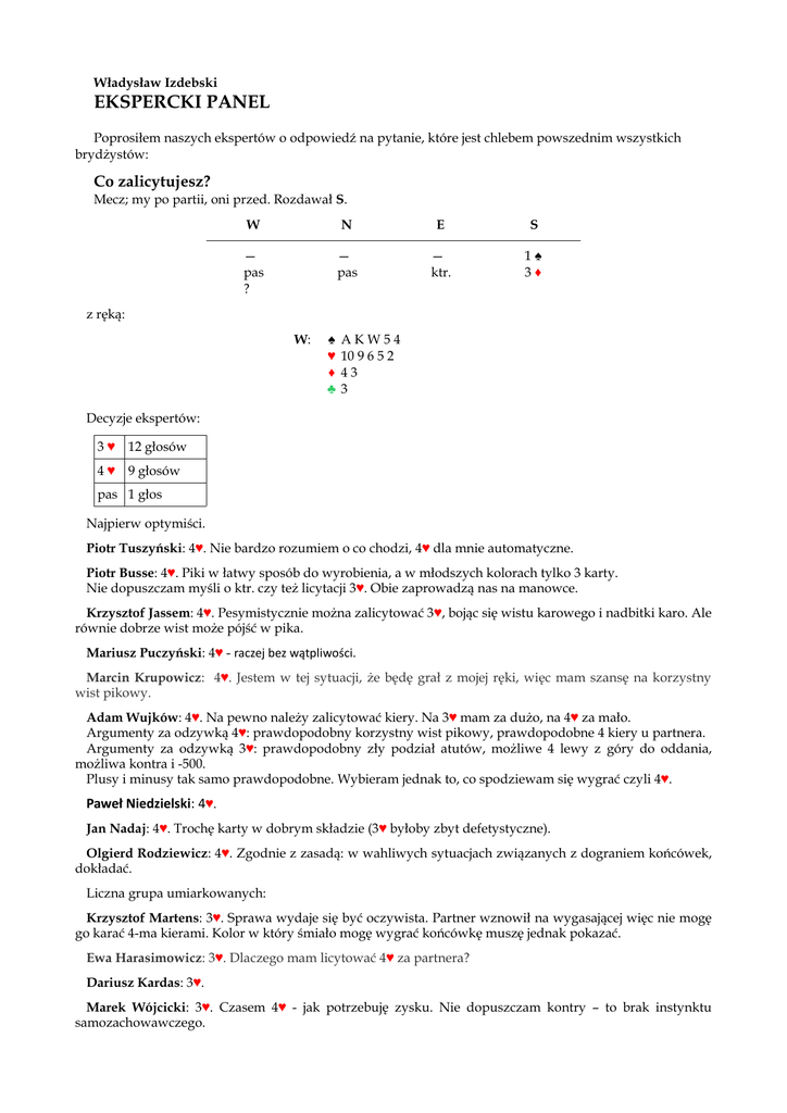 Władysław Izdebski EKSPERCKI PANEL Poprosiłem naszych ekspertów o odpowiedź na pytanie, które jest chlebem powszednim wszystkich brydżystów: Co zalicytujesz? Mecz; my po partii, oni przed. Rozdawał S. W N E S — pas ? — pas — ktr. 1♠ 3♦ z ręką: W: ♠ ♥ ♦ ♣ AKW54 10 9 6 5 2 43 3 Decyzje ekspertów: 3 ♥ 12 głosów 4 ♥ 9 głosów pas 1 głos Najpierw optymiści. Piotr Tuszyński: 4♥. Nie bardzo rozumiem o co chodzi, 4♥ dla mnie automatyczne. Piotr Busse: 4♥. Piki w łatwy sposób do wyrobienia, a w młodszych kolorach tylko 3 karty. Nie dopuszczam myśli o ktr. czy też licytacji 3♥. Obie zaprowadzą nas na manowce. Krzysztof Jassem: 4♥. Pesymistycznie można zalicytować 3♥, bojąc się wistu karowego i nadbitki karo. Ale równie dobrze wist może pójść w pika. Mariusz Puczyński: 4♥ - raczej bez wątpliwości. Marcin Krupowicz: 4♥. Jestem w tej sytuacji, że będę grał z mojej ręki, więc mam szansę na korzystny wist pikowy. Adam Wujków: 4♥. Na pewno należy zalicytować kiery. Na 3♥ mam za dużo, na 4♥ za mało. Argumenty za odzywką 4♥: prawdopodobny korzystny wist pikowy, prawdopodobne 4 kiery u partnera. Argumenty za odzywką 3♥: prawdopodobny zły podział atutów, możliwe 4 lewy z góry do oddania, możliwa kontra i -500. Plusy i minusy tak samo prawdopodobne. Wybieram jednak to, co spodziewam się wygrać czyli 4♥. Paweł Niedzielski: 4♥. Jan Nadaj: 4♥. Trochę karty w dobrym składzie (3♥ byłoby zbyt defetystyczne). Olgierd Rodziewicz: 4♥. Zgodnie z zasadą: w wahliwych sytuacjach związanych z dograniem końcówek, dokładać. Liczna grupa umiarkowanych: Krzysztof Martens: 3♥. Sprawa wydaje się być oczywista. Partner wznowił na wygasającej więc nie mogę go karać 4-ma kierami. Kolor w który śmiało mogę wygrać końcówkę muszę jednak pokazać. Ewa Harasimowicz: 3♥. Dlaczego mam licytować 4♥ za partnera? Dariusz Kardas: 3♥. Marek Wójcicki: 3♥. Czasem 4♥ - jak potrzebuję zysku. Nie dopuszczam kontry – to brak instynktu samozachowawczego. Dariusz Kowalski: 3♥. Lech Ohrysko: 3♥. Co innego? Dawno jakaś odzywka nie wydawała mi się tak oczywista. Mając odwrotnie w młodszych spróbowałbym chyba 4♥. Grzegorz Gardynik: 3♥. Michał Kwiecień: 3♥. Ja optuję za 3♥, co prawda miałem trapa pikowego, ale w tych założeniach i tak bym nie spasował na 1♠ z kontrą raczej. Kontra na 3♦ powinna mówić o ręce z którą spasowałbym na 1♠ z kontrą. Ryszard Kiełczewski: 3♥. Musi mieć partner siłę odzywki na kontrę reopen? - Nie musi. Zgrubne liczenie wykazuje, że mamy z RHO około 24 PC. Zatem dla reszty zostało 16 i ten z lewej ma nie więcej niż 6 PC. Nasze walory pikowe są przeinwestowaniem - wolałbym te topy mieć w jednym z młodszych kolorów. W tej sytuacji uważam, że 3♥ jest wystarczające, a pas jest lepszy do wszystkich pozostałych odzywek. Łukasz Sławiński: 3♥. Jeśli nawet z bilansu wychodzi 4♥, to i tak należy zalicytować niżej z uwagi na olbrzymią niemodelowość. Przecież takiej ręki partner nawet w przybliżeniu sobie nie wyobrazi, a wcale nie jest powiedziane że licytacja się zakończy na 4♥. Piotr Lutostański: 3 lub 4♥ - w zależności z kim gram. Problem źle postawiony, bo nie wyodrębnia tematu oceny karty od tematu ustaleń licytacyjnych - przeplatają się one zakłócając problem. Zasygnalizował to Martens pisząc między wierszami, że dla niego, taka kontra wznawiająca może być lekka. Znając styl większości z ekspertów wydaje mi się, że bardziej ich różni w tym rozdaniu właśnie ocena z czym się wznawia od oceny siły tej karty. Zatem mamy prosty wniosek, jakby ktoś miał przyjemność grać z którymś z panelistów, to właśnie dowiedział się z czym oni wznawiają, a więc z którym z nich należałoby powiedzieć 3, a z którym 4♥. Włodek Krysztofczyk: 3♥. Kontra wznawiającą partnera w niekorzystnych założeniach i to w meczu powinna być solidna. Do statystycznych 3 LH trzeba "coś" dołożyć. Choćby w postaci dobrego układu z 4-5 kierami. W tych warunkach zalicytowanie 3♥ ma właściwie pełny bilans nawet zważywszy spodziewane niekorzystne rozkłady. Z drugiej strony rozgrywkę przeprowadzimy prawie w widno lokalizując 11 kart w dwóch kolorach u otwierającego. Bezpośrednie "golnięcie" końcówki uważam za dopuszczalne ale niepotrzebne. To taka licytacja za "słabszego"partnera. Musimy też rozpatrzyć ewentualną kontrę. Może nie dla tej ręki bo mamy za duży układ ale... Na ich grę, w naszej ręce mamy 2 górne lewy i małe zadatki na trzecią. Wydaje się jednak, że po naszej kontrze partner wzruszy ramionami i spasuje. Z pikami AKW10x i nic z boku kontra też mi się nie podoba. Przy stoliku kontra oznacza trapping-pasa i generalnie dobrą kartę. Z grubsza w sile otwarcia..." Tak to widzę. Osamotniony pesymista: Bogusław Pazur: Pas. Kolory źle się dzielą... PODSUMOWANIE Nasi eksperci sprowadzili problem do zbilansowania ręki w kontekście gry w kiery. Jak widać rozbieżności są spore, przede wszystkim między Bogusiem Pazurem, a pozostałymi. Ale, by zrobić bilans, musimy wiedzieć jaka karta upoważnia do wznowienia. 1. Ile potrzeba na wznowienie licytacji? Piotr Lutostański uważa, że wiele zależy z kim gra. Niewątpliwie nieco zależy, są przecież w naszym żargonie określania: ścianiarz, lotnik. Pierwsi licytują bardzo solidnie, drudzy wprost przeciwnie. My jednak przyjmujemy zachowania standardowe, zalecane w książkach, a więc np. otwarcie obiecuje 13 pkt (PC + punkty za długość longerów). Podobnie na wznowieniu obowiązują pewne zasady tworzące klasyczną, zalecaną bazę (polecam znakomitą książkę M. Lawrence „Wznawianie licytacji”, 304 strony lektury). W N E 1♠ pas pas S ? Czego więc możemy spodziewać się w ręku partnera? S1: S2: S3: S4: ♠ 2 ♥ K 8 7 3 ♦ A 7 5 2 ♣ K 10 9 8 ♠ 3 2 ♥ A D 7 3 