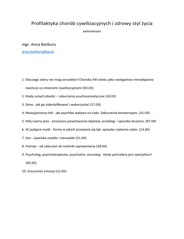 Profilaktyka chorób cywilizacyjnych i zdrowy styl życia seminarium mgr. Anna Baobura [email protected] 1. Dlaczego zebry nie mają wrzodów? Choroby XXI wieku jako następstwo nienadążania ddewolucji za zmianami cywilizacyjnymi (03.03) 2. Kiedy umysł szkodzi – zaburzenia psychosomatyczne (10.03) 3. Stres - jak go zidentyfikowad i wykorzystad (17.03) 4. Niewyjaśniony ból - jak psychika wpływa na ciało. Zaburzenia konwersyjne. (31.03) 5. Mój czarny pies - przyczyny powstawania depresji, przebieg i sposoby leczenia (07.04) 6. W pułapce myśli - formy w jakich przejawia się lęk, sposoby radzenia sobie (14.04) 7. Sen - zjawiska zwykłe i niezwykłe (21.04) 8. Pamięd - od zaburzeo do technik usprawniania (28.04) 9. Psycholog, psychoterapeuta, psychiatra, neurolog - kiedy potrzebny jest specjalista? dd(05.05) 10. Zrozumied emocje (12.05)