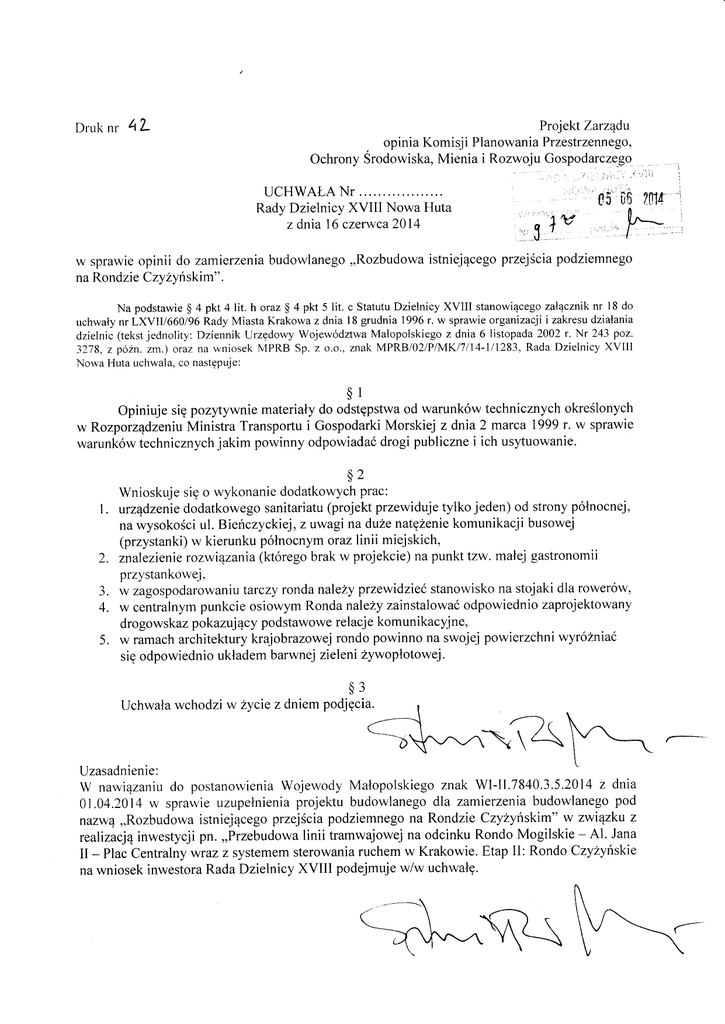 Druk nr 4 Ł Projekt Zarządu , opinia Komisji Planowania Przestrzennego, Ochrony Srodowiska, Mienia i Rozwoju Gospodarcze€o, |, :: UCHWAŁA Nr ... Rady Dzielnicy XVIII Nowa Huta z dnia 76 czerwcaż0|4 ,| il '65,65 Napodstawie§apkt4|it.horaz§4pkt5lit.cStatutuDzielnicyXVIIIstanowiącegozŃączniknrl8do uchwały nr LXVIIi660I96 Rady Miasta Krakowa z dnia 18 grudnia 1996 r. w sprawie organizacji i zakresu dzińania dzielnic (tekst.iednolity: Dziennik Urzędowy Wojewódawa Małopolskiego z dnia 6listopada 2002 r. Nr 243 poz. 3278, z poźn. zm.) oraz na wniosek MPRB Sp. z o.o., znak MPRB/}2IPl}dKl7l14-1l1283, Rada Dzielnicy XVIlI Nowa Huta uchwala. co następuje: §l Opiniuje się pozytywnie materiały do odstępstwa od warunków technicznych określonych w Rozporządzeniu Ministra Transportu i Gospodarki Morskiej z dnia2 marca 1999 r, w sprawie warunków technicznych jakim powinny odpowiadaó drogi publiczne i ich usytuowanie. §2 Wnioskuje się o wykonanie dodatkowych prac: jeden) od strony północnej, 1 . urządzenie dodatkowego sanitariatu (projekt przewiduje tylko na wysokościul. Bieńczyckiej, zuwagi na duze natęzenie komunikacji busowej (przystanki) w kierunku północnym oraz linii miejskich, ż. znalezięnię rozwiązania (którego brak w projekcie) na punkt tzw, małej gastronomii prZyStankowej, 3. w zagospodarowaniu tarczy ronda należy przewidzieć stanowisko na stojaki dla rowerów, 4. w centralnym punkcie osiowym Ronda należy zainstalować odpowiednio zaprojektowany dro go wska z p okazujący po d stawowe re l acj e ko mu n kacyj n e, 5. w ramach architektury krajobrazowej rondo powinno na swojej powierzchni wyrózniać się odpowiednio układem barwnej zieleni zywopłotowej. i Uzasadnienie: o"Or§"li_-_] z_) , \ -\[' '-S'-.,^x\Ą'§=. W nawiązaniu do postanowienia Wojewody Małopolskiego znak WI-II.7840.3.5,2014 z dnia 01.04.20l4 w sprawie uzupełnienia projektu budowlanego dla zamierzenia budowlanego pod nazwą,,Rozbudowa istniejącego przejścia podziemnego na Rondzie Czyżyńskim" w związku z realizacjąinwestycji pn. ,,Przebudowa linii tramwajowej na odcinku Rondo Mogilskie - A1. Jana _ Plac Centralny wraz z systemem sterowania ruchem w Krakowie. Etap ll: Rondo Czyżyńskie na wniosek inwestora Rada Dzielnicy XVIII podejmuje w/w uchwałę. II S\L\ ?ffit łź, , .h-_ w sprawie opinii do zamięrzenia budowlanego ,,Rozbudowa istniejącego przejścia podziemnego na Rondzie Czyzyńskim". Uchwała wchodzi w zycie z dniem ,,. ;,]l,_,.,:l,j,i]