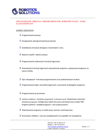 URUCHAMIANIE, OBSŁUGA I PROGRAMOWANIE ROBOTÓW FANUC - KURS ZAAWANSOWANY ZAKRES SZKOLENIA Programowanie pozycji. Korygowanie zaprogramowanej już pozycji. Dodatkowe instrukcje dostępne z komendami ruchu. Rejestry zwykłe i rejestry pozycji Programowanie wybranych instrukcji logicznych. Poprawianie instrukcji logicznych (sprawdzanie programu, zapisywanie programu na karcie FLASH). Opis dostępnych instrukcji programowania oraz podstawowych struktur. Programowanie pętli, warunków logicznych, sterowanie przebiegiem programu. Programowanie przyrostowe. Analiza struktury i działania programów wykonawczych. Wyjaśnienie schematu działania programu. Konfiguracja robota do pracy automatycznej w trybie PNS program główny i współpracujących z nim podprogramów. Wykonywanie programu w trybie pracy ręcznej i automatycznej. Komunikaty błędów i zalecane postępowanie w przypadku ich wystąpienia. Tel/ Fax +48 32 285 10 15 Mobile :+ 48 516 320 621 www.robotics-solutions.com.pl e-mail: [email protected] Strona 1 z 1