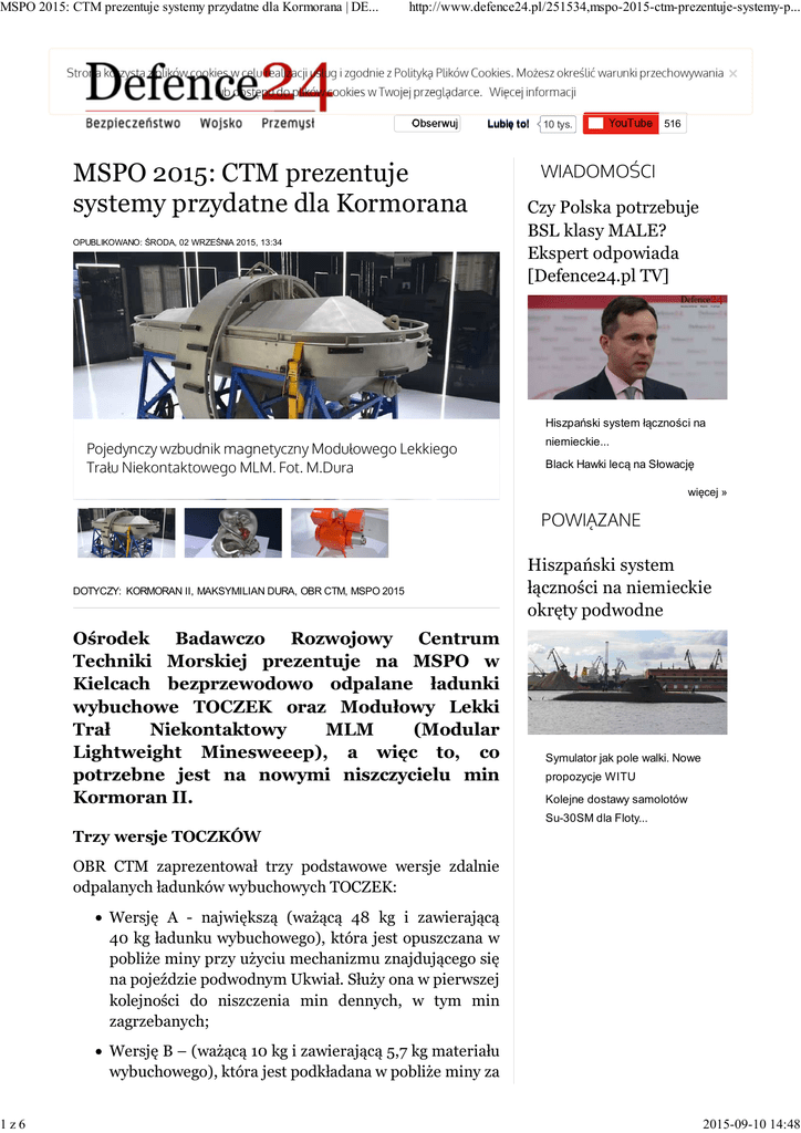 MSPO 2015: CTM prezentuje systemy przydatne dla Kormorana | DE... 1z6 http://www.defence24.pl/251534,mspo-2015-ctm-prezentuje-systemy-p... Obserwuj Lubię to! MSPO 2015: CTM prezentuje systemy przydatne dla Kormorana OPUBLIKOWANO: ŚRODA, 02 WRZEŚNIA 2015, 13:34 10 tys. 516 WIADOMOŚCI Czy Polska potrzebuje BSL klasy MALE? Ekspert odpowiada [Defence24.pl TV] Hiszpański system łączności na Pojedynczy wzbudnik magnetyczny Modułowego Lekkiego Trału Niekontaktowego MLM. Fot. M.Dura niemieckie... Black Hawki lecą na Słowację więcej » POWIĄZANE DOTYCZY: KORMORAN II, MAKSYMILIAN DURA, OBR CTM, MSPO 2015 Ośrodek Badawczo Rozwojowy Centrum Techniki Morskiej prezentuje na MSPO w Kielcach bezprzewodowo odpalane ładunki wybuchowe TOCZEK oraz Modułowy Lekki Trał Niekontaktowy MLM (Modular Lightweight Minesweeep), a więc to, co potrzebne jest na nowymi niszczycielu min Kormoran II. Hiszpański system łączności na niemieckie okręty podwodne Symulator jak pole walki. Nowe propozycje WITU Kolejne dostawy samolotów Su-30SM dla Floty... Trzy wersje TOCZKÓW OBR CTM zaprezentował trzy podstawowe wersje zdalnie odpalanych ładunków wybuchowych TOCZEK: Wersję A - największą (ważącą 48 kg i zawierającą 40 kg ładunku wybuchowego), która jest opuszczana w pobliże miny przy użyciu mechanizmu znajdującego się na pojeździe podwodnym Ukwiał. Służy ona w pierwszej kolejności do niszczenia min dennych, w tym min zagrzebanych; Wersję B – (ważącą 10 kg i zawierającą 5,7 kg materiału wybuchowego), która jest podkładana w pobliże miny za 2015-09-10 14:48 MSPO 2015: CTM prezentuje systemy przydatne dla Kormorana | DE... 2z6 http://www.defence24.pl/251534,mspo-2015-ctm-prezentuje-systemy-p... Tweets Defence24.pl Follow 14m @Defence24pl Hiszpański system łączności na niemieckie okręty podwodne | @Defence24pl defence24.pl/256910,hiszpan pic.twitter.com/dJBS3ohVvt Ładunek wybuchowy TOCZEK B. Fot. M.Dura Defence24.pl 16m @Defence24pl pomocą specjalnego ramienia pojazdu podwodnego Ukwiał. Ramię to ma konstrukcję pozwalającą na działanie z bezpiecznej odległości dla pojazdu; Wersję C - najmniejszą (ważącą 3 kg i zawierającą 0,56 kg ładunku wybuchowego), która jest przenoszona przez płetwonurków minerów i pojazd podwodny oraz służy przede wszystkim do przecinania minliny utrzymującej minę na kotwicy. Tweet to @Defence24pl Detonację wszystkich tych ładunków inicjuje się bezprzewodowo, wykorzystując do tego kodowane sygnały hydroakustyczne. Przy czym opracowany przez OBR CTM generator sygnału posiada specjalny nadajnik opuszczany do wody, który swoją mocą zapewnia działanie na zasięgu maksymalnym od 400 do 800 m i na głębokości do 160 m. Fragment miny zniszczonej przez ładunek wybuchowy TOCZEK B. Fot. M.Dura By uzmysłowić, jaka jest skuteczność tych ładunków, na 2015-09-10 14:48 MSPO 2015: CTM prezentuje systemy przydatne dla Kormorana | DE... 3z6 http://www.defence24.pl/251534,mspo-2015-ctm-prezentuje-systemy-p... MSPO 2015 zaprezentowano fragment miny zniszczonej przez ładunek wybuchowy TOCZEK B. Modułowy Lekki Trał Niekontaktowy MLM Drugim produktem przydatnym dla naszych okrętów przeciwminowych prezentowanym w Kielcach jest Modułowy Lekki Trał Niekontaktowy MLM. Jest to produkt znany nie tylko w Polsce (otrzymał on m.in. nagrodę „Bursztynowy medalion” i wyróżnienie ministra obrony narodowej na targach Balt Military Expo 2014 oraz nagrodę „Innowacyjna Gospodarka Morska” w kategorii „Innowacyjny produkt” przyznawaną przez Związek Pracodawców Forum Okrętowe w październiku 2014 r.) ale i w całej Europie. Był on m.in. testowany z powodzeniem na poligonie sił morskich Francji w okolicach Brestu. Pojedynczy wzbudnik magnetyczny Modułowego Lekkiego Trału Niekontaktowego MLM. Fot. M.Dura W Kielcach MLM był reprezentowany przez pojedynczy wzbudnik magnetyczny, który jest w stanie zasymulować pole magnetostatyczne, magnetyczne przemienne (w zakresie częstotliwości 50/60 Hz i częstotliwości harmonicznych do 250 Hz), elektryczne statyczne i elektryczne przemienne (1-5 Hz). Wzbudnik ten jest oczywiście tylko fragmentem większego systemu trałowego MLM, ponieważ by imitować „pełne” pola fizyczne jednostek pływających trzeba zastosować kilka takich modułów oraz wzbudnik akustyczny. Przykładowo, w czasie prób w Breście wykorzystywano system MLM w konfiguracji z trzema wzbudnikami magnetycznymi i z holowanym na końcu trałem akustycznym. Każdy z tych elementów może być oddzielnie sterowany według z góry założonego schematu lub adekwatnie do sytuacji. Sterowanie, kontrola pracy trału i zasilanie obywają się z wykorzystaniem kabloliny łączącej trał z holującą 2015-09-10 14:48 MSPO 2015: CTM prezentuje systemy przydatne dla Kormorana | DE... 4z6 http://www.defence24.pl/251534,mspo-2015-ctm-prezentuje-systemy-p... jednostką pływającą. Co ciekawe, we Francji do holowania MLM wykorzystano zdalnie sterowany bezzałogowy katamaran („Sterren Du”) zbudowany przez francuski koncern stoczniowy DCNS. DODAJ KOMENTARZ Treść komentarza Autor komentarza Przepisz kod z obrazka Napisz ANALIZY POLECAMY Wojna hybrydowa: atak bronią D na Europę? Ukraińskie silniki rakietowe dla NASA Osiągnięto porozumienie z Po wyborach rewizja programu wykonawcą gazoportu.... modernizacji.... Pół wieku śmigłowca AH-1 Cobra Kontrakt na pociski Nowy sposób pozyskania okrętów przeciwradiolokacyjne AARGM.... podwodnych?... Pół wieku śmigłowca AH-1 Cobra Czy Niemcy zmuszą Polskę do Rosjanie w Syrii. Czy wybudują przyjęcia 100... nową bazę... Raytheon o Wiśle: "Antena główna Forum Ekonomiczne: Ukraiński w technologii... przemysł i... MSPO 2015: Rosomak w dwóch Wielkie manewry morskie NATO na nowych odsłonach Bałtyku Nielegalni imigranci na Starym Cywilne samoloty mogą operować Kontynencie.... z lotnisk... Czy Amerykanie obniżą dla kobiet Brytyjskie wozy bojowe dla