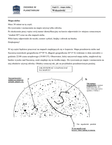 ZADANIA W PLANETARIUM Część II – mapa nieba STUDENT ID Wskazówki page no. Mapa nieba: Masz 30 minut na tę część. Do rysowania i zaznaczania na mapie używaj tylko ołówka. Po skończeniu pracy wpisz swój numer identyfikacyjny na karcie odpowiedzi (w miejscu oznaczonym “student ID”) oraz na obu mapach nieba. Włóż karty odpowiedzi do teczki; zostaw cyrkiel, linijkę i ołówek na biurku. Dziękujemy! W tej części będziesz pracować na mapach znajdujących się w kopercie. Mapa przedstawia niebo nad Suczawą (szerokość geograficzna 47º39' N, długość geograficzna 26º15' E) widziane w dniu zawodów o godzinie 22:00 czasu urzędowego (19:00 UT). Obserwator, który narysował mapę nieba, znajdował się bardzo wysoko nad Suczawą; zenit znajduje się na środku mapy. Do rysowania po mapie i zaznaczania na niej obiektów używaj ołówka. Obiekty oznaczaj tak, jak na przykładzie przedstawionym poniżej. JAK RYSOWAĆ I ZAZNACZAĆ NA MAPCE? Narysuj krzyżyk i podpisz go numerem gwiazdy, planety, etc. 5 B Tak zaznacz gwiazdozbiór i zamiast przykładowego ‚B’i wpisz skrót jego nazwy zgodnie z Tabelą 1. The equatorial parallel W ten sposób rysuj krzywe / linie i opisuj, co znaczą. ZADANIA W PLANETARIUM Część II – mapa nieba STUDENT ID Karta odpowiedzi page no. Proszę pisać tylko z tej strony kartki!!! Zadania Mapa przedstawia niebo nad Suczawą (szerokość geograficzna 47º39' N, długość geograficzna 26º15' E), widziane w dniu testu o godzinie 19:00 UT. Obserwator, który narysował mapę nieba, znajdował się bardzo wysoko nad Suczawą; zenit znajduje się na środku mapy. Zadania 1 – 4 rozwiązuj na jednej kopii mapy, zadania 5 – 8 – na drugim jej egzemplarzu. 1. (2p) Narysuj na mapie horyzont obserwatora znajdującego się na powierzchni Ziemi w Suczawie. 2. (8p) Narysuj na mapie liniami ciągłymi: równik niebieski, ekliptykę, równik galaktyczny oraz południk lokalny. 3. (9p) Zaznacz na mapie punkty kardynalne (literami: N – północ, E – wschód, S – południe, W – zachód). Zaznacz wszystkie planety Układu Słonecznego poza Uranem i Neptunem i opisz je cyframi 1, 2, ..., 6 zgodnie z rosnącą odległością od Słońca (pomiń cyfrę 3 – Ziemię). Zauważ, że planety nie zostały pokazane na mapie. 4. (4p) Zidentyfikuj i zaznacz na mapie 4 najjaśniejsze gwiazdy (w paśmie widzialnym) znajdujące się nad horyzontem. Opisz te gwiazdy cyframi od 1 do 4, gdzie ,,1” oznacza najjaśniejszą z nich, a ,,4” - najsłabszą. Uzupełnij poniższą tabelę nazwami gwiazd lub ich oznaczeniami z katalogu Bayera. Numer 1 Nazwa gwiazdy gwiazdy 2 Nazwa gwiazdy na 3 Nazwa gwiazdy mapie 4 Nazwa gwiazdy ZADANIA W PLANETARIUM Część II – mapa nieba STUDENT ID Karta odpowiedzi page no. Proszę pisać tylko z tej strony kartki!!! 5. (6p) Zaznacz na mapie przybliżony kształt dowolnych 15 gwiazdozbiorów, które znajdują się całkowicie powyżej horyzontu. Każdy z nich opisz skrótem (zgodnie z oznaczeniami Międzynarodowej Unii Astronomicznej IAU), korzystając z Tabeli 1. 6. (5p) Zaznacz na mapie położenia następujących obiektów: a. Obiektów z katalogu Messiera: M31, M27, M13; b. Cygni, Ursae Minoris. 7. (10p) Oszacuj czas gwiazdowy odpowiadający sytuacji przedstawionej na mapie. Wpisz odpowiedź w polu obok (w jednostkach czasowych). 8. (6p) Oszacuj współrzędne równikowe (rektascensję i deklinację) Altaira (α Aquilae). Wpisz odpowiedź w polu obok.