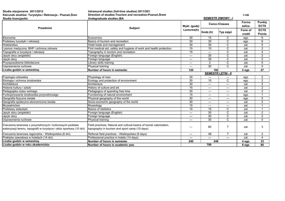 Studia stacjonarne 2011/2012 Kierunek studiów: Turystyka i Rekreacja - Poznań,Śrem Studia licencjackie Przedmiot Intramural studies (full-time studies) 2011/2012 Direction of studies:Tourism and recreation-Poznań,Śrem Undegraduate studies (BA Subject I rok SEMESTR ZIMOWY - I Wykł. (godz) Lectures(h) Ćwicz./Classes Godz.(h) Typ zajęć 15 30 30 15 — 30 30 2 30 C C C C C C C C C Forma zalicz. Punkty ECTS Form of credit egz. egz. zal. zal. zal. zal. zal. zal. zal. 2 egz. ECTS Points 6 6 5 2 4 2 2 0 0 27 egz. egz. zal. zal. zal. egz. egz. zal. zal. zal. zal. zal. zal. 2 2 2 2 2 1 5 2 1 1 2 2 0 Ekonomia Podstawy turystyki i rekreacji Hotelarstwo I pomoc medyczna, BHP i ochrona zdrowia Topografia w turystyce i rekreacji Język obcy (angielski) Język obcy Przysposobienie biblioteczne Usprawnienia ruchowe Liczba godzin w semestrze Economics Basics of tourism and recreation Hotel trade and management First medical aid, safety and hygiene of work and health protection Topography in tourism and recreation Foreign language (English) Foreign language Library skills training Physical training Number of hours in semester 30 30 30 15 15 — — — — 120 Fizjologia człowieka Ekologia i ochrona środowiska Architektura Historia kultury i sztuki Pedagogika czasu wolnego Funkcjonowanie środowiska przyrodniczego Geografia fizyczna świata Geografia społeczno-ekonomiczna świata Muzealnictwo Podstawy statystyki Język obcy (angielski) Język obcy Usprawnienia ruchowe Physology of man Ecology and protection of environment Archtecture History of culture and art. Pedagogics of spanding free time Functioning of natural environment Physical geography of thw world Socio-economic geography of the world Museology Basics of ststistics Foreign language (English) Foreign language Physical training 30 30 30 15 30 15 30 30 15 15 — — — Ćwiczenia terenowe z przyrodniczych i kulturowych podstaw waloryzacji terenu, topografii w turystyce i obóz sportowy (10 dni) Field practices: Natural and cultural basics of tourist valorization, topography in tourism and sport camp (10 days) — 80 T zal. 3 Ćwiczenia terenowe regionalne - Wielkopolska (6 dni) Praktyka zawodowa w hotelach (14 dni) Liczba godzin w semestrze Liczba godzin w roku akademickim Refional field practices - Wielkopolska (6 days) Professional practice in hotels (14 days) Number of hours in semester Number of hours in academic year — — 240 48 — T — zal. zal. 4 egz. 6 egz. 2 4 33 60 182 SEMESTR LETNI - II — — 15 C — — — — — — — — — — — — — — 15 C 30 C 30 C 30 C 248 790 Studia stacjonarne 2011/2012 Kierunek studiów: Turystyka i Rekreacja - Poznań,Śrem Studia licencjackie Przedmiot Intramural studies (full-time studies) 2011/2012 Direction of studies:Tourism and recreation-Poznań,Śrem Undegraduate studies (BA Subject II rok SEMESTR ZIMOWY - III Wykł. (godz) Lectures(h) Ćwicz./Classes Godz.(h) Zarządzanie przedsiębiorstwem turystycznym Finanse przedsiębiorstw Geografia fizyczna Polski Klimatologia regionalna i bioklimatologia człowieka Organizacja i prowadzenie wycieczek Podstawy i zastosowanie informatyki Podstawy rachunkowości Środowisko geologiczne Turystyczne walory wód Język obcy (angielski) Język obcy Usprawnienia ruchowe Liczba godzin w semestrze Tourist business management Finanaces of enterprices Physical geography of Poland Regional climatology and human bioclimatology Tour organization and guiding Basics and application of informatics Basics of accountancy Geologic environment Tourist values of water bodies Foreign language (English) Foreign language Physical training Number of hours in semester 30 30 30 30 30 — 15 15 30 — — — 210 Psychologia Ekonomika turystyki i rekreacji Obsługa w ruchu turystycznego Geografia społeczno-ekonomiczna Polski Turystyczne walory biosfery Turystyczne walory rzeźby powierzchni Ziemi Etyka i ochrona wartości intelektualnych Geografia polityczna Podstawy i zastosowanie informatyki Język obcy (angielski) Język obcy Usprawnienia ruchowe Ćwiczenia terenowe z pilotażu i przewodnictwa po ośrodkach, obiektach i trasach turystycznych (6 dni) Ćwiczenia terenowe regionalne - Pomorze Gdańskie (6 dni) Psychology Economics of tourism and recreation Service of tourist traffic Socio-economic geography of Poland Tourist values of biosphere Tourist value of Earth surface relief Ethics and protection of intelectual values Politic geography Basics and application of informatics Foreign language (English) Foreign language Physical training 30 15 30 30 15 30 15 15 — — — — Pilatage and guiding in tourist centers, objects and routes (6 days) — 48 Regional field practices - Pomerania (6 days) — Praktyka zawodowa w przedsiębiorstwach turystycznych (14 dni) Professional practice in tourist enterprices (14 days) — Liczba godzin w semestrze Liczba godzin w roku akademickim Number of hours in semester Number of hours in academic year Typ zajęć 30 — — — 30 30 15 — — 30 30 30 C — — — C C C — — C C C 195 SEMESTR LETNI - IV — — 30 C — — — — 30 C 30 C — — — — 30 C 30 C 30 C 30 C Forma zalicz. Form of credit zal. egz. egz. egz. egz. zal. zal. zal. zal. zal. zal. zal. 4 egz. Punkty ECTS ECTS Points 4 3 3 3 4 2 2 2 2 2 2 0 29 zal. zal. zal. egz. egz. egz. zal. zal. zal. zal. zal. zal. 2 3 2 2 3 2 1 2 2 2 2 0 T zal. 2 48 T zal. 2 — — zal. 4 3 egz. 7 egz. 31 60 180 306 891 Studia stacjonarne 2011/2012 Kierunek studiów: Turystyka i Rekreacja - Poznań,Śrem Studia licencjackie Przedmiot Intramural studies (full-time studies) 2011/2012 Direction of studies:Tourism and recreation-Poznań,Śrem Undegraduate studies (BA Subject III rok SEMESTR ZIMOWY - V Wykł. (godz) Lectures(h) Prawo w turystyce i rekreacji Krajoznawstwo i metodyka jego prezentacji Geografia turystyczna wybranych krajów I Geografia turystyczna wybranych krajów II Geografia turystyczna wybranych krajów III Filozofia Geografia regionalna świata Ag