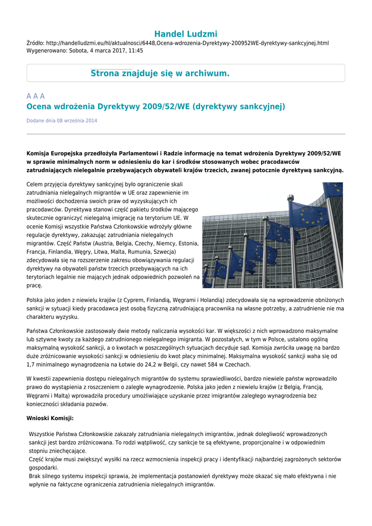 Handel Ludzmi Źródło: http://handelludzmi.eu/hl/aktualnosci/6448,Ocena-wdrozenia-Dyrektywy-200952WE-dyrektywy-sankcyjnej.html Wygenerowano: Sobota, 4 marca 2017, 11:45 Strona znajduje się w archiwum. AAA Ocena wdrożenia Dyrektywy 2009/52/WE (dyrektywy sankcyjnej) Dodane dnia 08 września 2014 Komisja Europejska przedłożyła Parlamentowi i Radzie informację na temat wdrożenia Dyrektywy 2009/52/WE w sprawie minimalnych norm w odniesieniu do kar i środków stosowanych wobec pracodawców zatrudniających nielegalnie przebywających obywateli krajów trzecich, zwanej potocznie dyrektywą sankcyjną. Celem przyjęcia dyrektywy sankcyjnej było ograniczenie skali zatrudniania nielegalnych migrantów w UE oraz zapewnienie im możliwości dochodzenia swoich praw od wyzyskujących ich pracodawców. Dyrektywa stanowi część pakietu środków mającego skutecznie ograniczyć nielegalną imigrację na terytorium UE. W ocenie Komisji wszystkie Państwa Członkowskie wdrożyły główne regulacje dyrektywy, zakazując zatrudniania nielegalnych migrantów. Część Państw (Austria, Belgia, Czechy, Niemcy, Estonia, Francja, Finlandia, Węgry, Litwa, Malta, Rumunia, Szwecja) zdecydowała się na rozszerzenie zakresu obowiązywania regulacji dyrektywy na obywateli państw trzecich przebywających na ich terytoriach legalnie nie mających jednak odpowiednich pozwoleń na pracę. Polska jako jeden z niewielu krajów (z Cyprem, Finlandią, Węgrami i Holandią) zdecydowała się na wprowadzenie obniżonych sankcji w sytuacji kiedy pracodawca jest osobą fizyczną zatrudniającą pracownika na własne potrzeby, a zatrudnienie nie ma charakteru wyzysku. Państwa Członkowskie zastosowały dwie metody naliczania wysokości kar. W większości z nich wprowadzono maksymalne lub sztywne kwoty za każdego zatrudnionego nielegalnego imigranta. W pozostałych, w tym w Polsce, ustalono ogólną maksymalną wysokość sankcji, a o kwotach w poszczególnych sytuacjach decyduje sąd. Komisja zwróciła uwagę na bardzo duże zróżnicowanie wysokości sankcji w odniesieniu do kwot płacy minimalnej. Maksymalna wysokość sankcji waha się od 1,7 minimalnego wynagrodzenia na Łotwie do 24,2 w Belgii, czy nawet 584 w Czechach. W kwestii zapewnienia dostępu nielegalnych migrantów do systemu sprawiedliwości, bardzo niewiele państw wprowadziło prawo do wystąpienia z roszczeniem o zaległe wynagrodzenie. Polska jako jeden z niewielu krajów (z Belgią, Francją, Węgrami i Maltą) wprowadziła procedury umożliwiające uzyskanie przez imigrantów zaległego wynagrodzenia bez konieczności składania pozwów. Wnioski Komisji: Wszystkie Państwa Członkowskie zakazały zatrudniania nielegalnych imigrantów, jednak dolegliwość wprowadzonych sankcji jest bardzo zróżnicowana. To rodzi wątpliwość, czy sankcje te są efektywne, proporcjonalne i w odpowiednim stopniu zniechęcające. Część krajów musi zwiększyć wysiłki na rzecz wzmocnienia inspekcji pracy i identyfikacji najbardziej zagrożonych sektorów gospodarki. Brak silnego systemu inspekcji sprawia, że implementacja postanowień dyrektywy może okazać się mało efektywna i nie wpłynie na faktyczne ograniczenia zatrudnienia nielegalnych imigrantów. Zdjęcie: CC-BY 2.0 / Wikimedia Commons / Sébastien Bertrand Tagi: podziel się treścią: wersja pdf drukuj