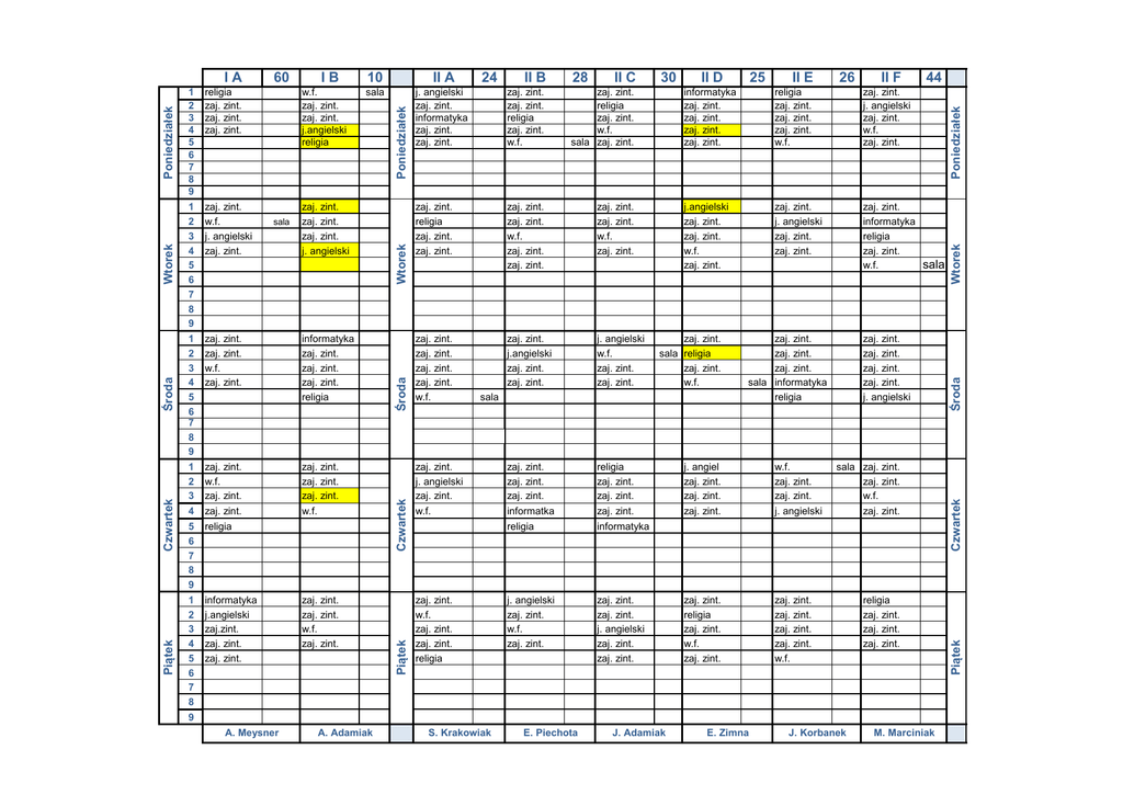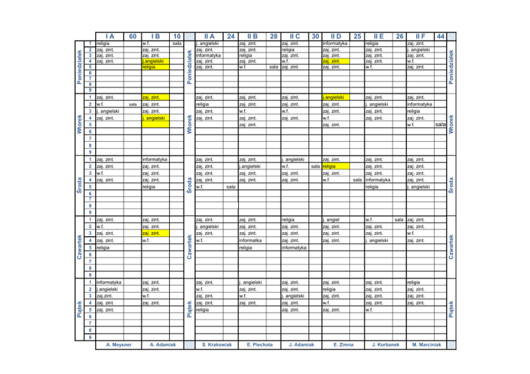 1 2 3 4 5 6 7 8 informatyka j.angielski zaj.zint. zaj. zint. zaj. zint. zaj. zint. zaj. zint. w.f. zaj. zint. zaj. zint. zaj. zint. zaj. zint. zaj. zint. w.f. zaj. zint. j.angielski zaj. zint. zaj. zint. j. angielski w.f. zaj. zint. zaj. zint. zaj. zint. j. angielski zaj. zint. zaj. zint. zaj. zint. zaj. zint. religia zaj. zint. zaj. zint. j. angiel zaj. zint. zaj. zint. w.f. zaj. zint. zaj. zint. w.f. informatka zaj. zint. zaj. zint. j. angielski zaj. zint. religia informatyka j. angielski zaj. zint. w.f. zaj. zint. zaj. zint. zaj. zint. j. angielski zaj. zint. zaj. zint. zaj. zint. religia zaj. zint. w.f. zaj. zint. zaj. zint. zaj. zint. zaj. zint. zaj. zint. w.f. religia zaj. zint. zaj. zint. zaj. zint. zaj. zint. zaj. zint. w.f. zaj. zint. 30 II D II E 26 II F 44 religia zaj. zint. zaj. zint. zaj. zint. w.f. zaj. zint. j. angielski zaj. zint. w.f. zaj. zint. j.angielski zaj. zint. zaj. zint. w.f. zaj. zint. zaj. zint. j. angielski zaj. zint. zaj. zint. zaj. zint. informatyka religia zaj. zint. w.f. sala zaj. zint. sala religia zaj. zint. w.f. sala zaj. zint. w.f. zaj. zint. zaj. zint. religia 25 informatyka zaj. zint. zaj. zint. zaj. zint. zaj. zint. zaj. zint. zaj. zint. zaj. zint. sala informatyka religia zaj. zint. zaj. zint. zaj. zint. zaj. zint. j. angielski sala zaj. zint. zaj. zint. w.f. 9 A. Meysner A. Adamiak S. Krakowiak E. Piechota J. Adamiak E. Zimna J. Korbanek M. Marciniak Poniedziałek w.f. religia II C Wtorek zaj. zint. 5 6 7 8 9 28 Środa 4 zaj. zint. zaj. zint. w.f. zaj. zint. zaj. zint. informatyka zaj. zint. zaj. zint. zaj. zint. religia II B Czwartek zaj. zint. zaj. zint. zaj. zint. zaj. zint. religia zaj. zint. zaj. zint. zaj. zint. zaj. zint. zaj. zint. j. angielski 24 Piątek zaj. zint. w.f. zaj. zint. zaj. zint. religia zaj. zint. w.f. sala zaj. zint. Poniedziałek 1 2 3 zaj. zint. zaj. zint. religia zaj. zint. w.f. Wtorek zaj. zint. zaj. zint. w.f. zaj. zint. II A j. angielski zaj. zint. informatyka zaj. zint. zaj. zint. Środa 1 2 3 4 5 6 7 8 9 sala 10 sala Czwartek zaj. zint. w.f. j. angielski zaj. zint. Piątek w.f. zaj. zint. zaj. zint. j.angielski religia Piątek 1 2 3 4 5 6 7 8 9 Czwartek Poniedziałek IB Wtorek 60 religia zaj. zint. zaj. zint. zaj. zint. Środa IA 1 2 3 4 5 6 7 8 9