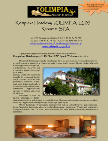 Przy grupach powyżej 30 osób możliwość negocjacji cen! Kompleks Hotelowy „OLIMPIA LUX” Resort & SPA 43-370 Szczyrk ul. Skośna 9 tel. +48 33 8178 150 tel./fax. +48 33 8178 141 GSM +48 608 658 048 [email protected], [email protected] www.olimpia.szczyrk.pl Z przyjemnością przedstawiamy Państwu ofertę naszego obiektu – Kompleksu Hotelowego „OLIMPIA LUX” Spa & Wellness w Szczyrku. Doskonała lokalizacja ośrodka oddalonego 20 m od całorocznego wyciągu krzesełkowego na Skrzyczne w sąsiedztwie z lasem sprawia, iż nasz obiekt stanowi idealne miejsce dla ludzi poszukujących ciszy i spokoju, a jednocześnie chcących być w centrum atrakcji turystycznych miasta Szczyrk. Oferujemy doskonałe warunki do organizacji konferencji, szkoleń, spotkań integracyjnych, wczasów rodzinnych oraz indywidualnych, a przede wszystkim aktywnemu, rodzinnemu wypoczynkowi zarówno w okresie zimowym jak i letnim. Położenie z dala od zgiełku ulicznego, w bezpośredniej styczności z malowniczą przyrodą Beskidu Śląskiego daje idealne warunki do zrelaksowania się i wypoczęcia od uciążliwego, miejskiego trybu życia. Obiekt dysponuje 105 miejscami noclegowymi. Pokoje są komfortowo i gustownie urządzone. Wszystkie dysponują własnym węzłem higieniczno- sanitarnym. W pokojach są telefony, dostęp do Internetu 24h, TV SAT, aneks kuchenny, sejf oraz balkony od strony południowej i zachodniej. Dysponujemy dużą salą jadalną, w której serwowane są domowe i regionalne potrawy, śniadania w formie bufetu, obiadokolacje, bankiety. Posiadamy także kameralną sale kominkową. Na życzenie gości świadczymy usługę room-service. Do dyspozycji oddajemy również nowocześnie wyposażoną salę konferencyjną, mogącą pomieścić do 150 osób. Jeżeli zaistnieje taka konieczność możemy przeprowadzić w naszym obiekcie jednocześnie 3 konferencje (spotkania grupowe). Baza rekreacyjna to jeden z najważniejszych atutów naszego Resortu Olimpia. Gościom oferujemy nowoczesny basen kryty - ozonowany ze sztuczną falą, hydromasaż z biczami szkockimi SPA Columba, saunę suchą, parową i infrared. Dysponujemy również bilardem, tenisem stołowym oraz siłownią - fitness. Latem nasi goście mogą korzystać z kortów tenisowych i boiska sportowego. Oprócz tego do dyspozycji wczasowiczów pozostawiamy: letni taras z leżakami, grill, plac zabaw dla dzieci z huśtawkami, przechowalnie sprzętu sportowego i duży, monitorowany parking (bezpłatny dla gości). Po szkoleniach gwarantujemy chwile relaksu i ukojenia w naszym Centrum Spa & Wellness. W ofercie znajdują się rytuały zabiegowe na twarz oraz całe ciało. Propozycje uzupełnia bogata oferta masaży z różnych zakątków świata. Osobiście polecamy niezwykle odprężający i relaksujący masaż gorącymi kamieniami wulkanicznymi Dla grup zorganizowanych oferujemy atrakcyjne pakiety SPA (skrócone - 25 minutowe wersje zabiegów). Dodatkowo prezes lub osoba decyzyjna w grupie otrzymuje za darmo zabieg firmowy w naszym Centrum. Naszą ofertę jesteśmy w stanie poszerzyć o dodatkowe usługi fakultatywne realizowane za pośrednictwem podwykonawców. Istnieje możliwość organizacji wycieczek pieszych, rowerowych, autokarowych, z przewodnikiem górskim ( przykładowo: zamek w Pszczynie, browar w Żywcu, baseny termalne na Słowacji, paintball, quady, skutery śnieżne, kapele góralskie, biesiady przy ognisku z pieczeniem prosiaka/barana, kulig zielony/biały z napadem Zbójników itp.). Cena noclegu ze śniadaniem (bufet) w zależności od okresu waha się między 105 a 130 PLN/osoba. Dzieci do 3 lat gratis. Honorujemy zniżki do 14 roku życia. Więcej informacji o Kompleksie Hotelowy możecie Państwo znaleźć na naszej stronie internetowej: www.olimpia.szczyrk.pl Naszym gościom gwarantujemy niecodzienne wrażenia. Chwile spędzone z nami, są chwilami niezapomnianymi do końca życia. Z wyrazami szacunku Jan Danel