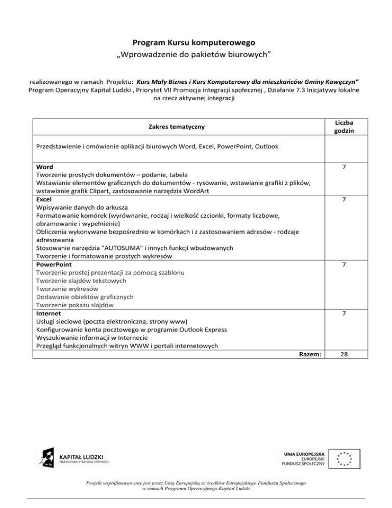 Program Kursu komputerowego „Wprowadzenie do pakietów biurowych” realizowanego w ramach Projektu: Kurs Mały Biznes i Kurs Komputerowy dla mieszkańców Gminy Kawęczyn” Program Operacyjny Kapitał Ludzki , Priorytet VII Promocja integracji społecznej , Działanie 7.3 Inicjatywy lokalne na rzecz aktywnej integracji Zakres tematyczny Liczba godzin Przedstawienie i omówienie aplikacji biurowych Word, Excel, PowerPoint, Outlook Word Tworzenie prostych dokumentów – podanie, tabela Wstawianie elementów graficznych do dokumentów - rysowanie, wstawianie grafiki z plików, wstawianie grafik Clipart, zastosowanie narzędzia WordArt Excel Wpisywanie danych do arkusza Formatowanie komórek (wyrównanie, rodzaj i wielkość czcionki, formaty liczbowe, obramowanie i wypełnienie) Obliczenia wykonywane bezpośrednio w komórkach i z zastosowaniem adresów - rodzaje adresowania Stosowanie narzędzia "AUTOSUMA" i innych funkcji wbudowanych Tworzenie i formatowanie prostych wykresów PowerPoint Tworzenie prostej prezentacji za pomocą szablonu Tworzenie slajdów tekstowych Tworzenie wykresów Dodawanie obiektów graficznych Tworzenie pokazu slajdów Internet Usługi sieciowe (poczta elektroniczna, strony www) Konfigurowanie konta pocztowego w programie Outlook Express Wyszukiwanie informacji w Internecie Przegląd funkcjonalnych witryn WWW i portali internetowych Razem: Projekt współfinansowany jest przez Unię Europejską ze środków Europejskiego Funduszu Społecznego w ramach Programu Operacyjnego Kapitał Ludzki 7 7 7 7 28