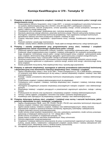 Komisja Kwalifikacyjna nr 378 - Tematyka ‘D’ I. Przepisy w zakresie przyłączenia urządzeń i instalacji do sieci, dostarczania paliw i energii oraz dysponowania mocą. 1. 2. 3. 4. 5. 6. 7. 8. 9. II. Rozporządzenie Ministra Gospodarki z dnia 4 maja 2007 r. w sprawie szczegółowych warunków funkcjonowania systemu elektroenergetycznego (Dz.U.93.623 z dnia 29 maja 2007 z późniejszymi zmianami). Grupy przyłączeniowe, warunki przyłączenia, umowa sprzedaŜy energii, umowa przesyłowa; obowiązki dostawcy i odbiorcy energii elektrycznej. Prowadzenie ruchu sieciowego i eksploatacja sieci, instrukcja eksploatacji u odbiorcy energii. Standardy jakościowe obsługi odbiorców, parametry techniczne energii. Warunki wstrzymania dostawy energii. Wymagania i zawartość dokumentacji technicznej (projektowej). Tryb uzgadniania rozwiązań technicznych. Sprawdzanie realizacji warunków przyłączania urządzeń i instalacji do sieci. Przepisy dotyczące poboru, regulowania i dysponowania mocą i energią. Kształtowanie dobowego poboru mocy. Pewność zasilania i zasady jego rezerwowania. Rodzaje i zasady doboru układów pomiarowych. Taryfy opłat za energię elektryczną i usługi dystrybucyjne. Przepisy i zasady postępowania przy programowaniu pracy sieci, instalacji i urządzeń z uwzględnieniem zasad racjonalnego uŜytkowania paliw i energii. 1. 2. 3. 4. 5. 6. Znajomość ogólnych zasad wytwarzania, przesyłu, rozdziału i racjonalnego uŜytkowania paliw i energii. Znajomość zasad programowania pracy urządzeń i instalacji zmierzających do uzyskania wyrównanego przebiegu obciąŜenia i minimalizacji zuŜycia paliw i energii (harmonogram pracy urządzeń, wykorzystania wydajności urządzeń, eliminowania biegu jałowego agregatów, ograniczenia pracy urządzeń energochłonnych). BieŜąca kontrola poboru mocy i zuŜycia paliw i energii w procesach produkcyjnych. Okresowa analiza energochłonności. Normowanie zuŜycia energii elektrycznej, wskaźniki zuŜycia energii. Zasady stosowania ograniczeń w uŜytkowaniu i poborze energii, analiza strat energii i ekonomicznego obciąŜenia urządzeń. Zasady gospodarki mocą bierną. Rola współczynnika mocy i sposoby jego poprawiania. III. Przepisy w zakresie eksploatacji, wymagania w zakresie prowadzenia dokumentacji technicznej i eksploatacyjnej oraz stosowania instrukcji eksploatacji sieci, instalacji i urządzeń. 1. 2. 3. 4. 5. 6. 7. 8. 9. Ogólna charakterystyka ustawy z dnia 10.04.1997 r. Prawo Energetyczne (t.j. Dz.U.2006.89.625 z późniejszymi zmianami) oraz aktów wykonawczych do tej ustawy z zakresu eksploatacji urządzeń, instalacji i sieci elektroenergetycznych. Rodzaje i zasady prowadzenia dokumentacji techniczno–eksploatacyjnej urządzeń i instalacji elektroenergetycznych. Przyjmowanie urządzeń i instalacji elektroenergetycznych do eksploatacji. Prowadzenie ruchu urządzeń i instalacji. Instrukcje eksploatacji sieci, urządzeń i instalacji, instrukcje obsługi i stanowiskowe. Wymagania szczegółowych przepisów eksploatacji poszczególnych rodzajów urządzeń i sieci elektroenergetycznych. Eksploatacja instalacji i urządzeń pracujących w przestrzeniach zagroŜonych wybuchem, rodzaje i zakresy kontroli. Przekazywanie do remontu oraz wycofywanie z eksploatacji urządzeń i instalacji elektroenergetycznych. Terminy i zakres oględzin, przeglądów i remontów oraz badań i pomiarów eksploatacyjnych. Kwalifikacje osób zajmujących się eksploatacją urządzeń, instalacji i sieci elektroenergetycznych. IV. Przepisy dotyczące budowy sieci, urządzeń i instalacji oraz normy i warunki techniczne, jakim powinny odpowiadać te sieci, instalacje i urządzenia. 1. Ogólna charakterystyka PBUE, norm PN, PN-EN, PN-IEC, PN-HD oraz warunków technicznych dotyczących budowy urządzeń, instalacji i sieci elektroenergetycznych. 2. Ogólne zasady budowy i działania urządzeń, instalacji i sieci elektroenergetycznych. Układy sieciowe. 3. WyposaŜenie urządzeń w aparaturę kontrolno–pomiarową, regulacyjną, automatykę i zabezpieczenia. 4. Przepisy dotyczące ochrony przeciwporaŜeniowej. 5. Środki ochrony przed dotykiem bezpośrednim oraz przy uszkodzeniu (pośrednim), środki ochrony przeciwporaŜeniowej w instalacjach elektrycznych do 1 kV. Układy SELV i PELV. 6. Środki ochrony od poraŜeń w urządzeniach powyŜej 1 kV. 7. Zasady doboru urządzeń do warunków środowiskowych. Klasy ochronności. 8. Ochrona odgromowa i przeciwprzepięciowa. 9. Urządzenia i instalacje elektryczne przeznaczone do pracy w przestrzeniach zagroŜonych wybuchem. Rodzaje budowy, zasady doboru, instalowania i zabezpieczeń urządzeń; zasady doboru i nastawy zabezpieczeń silników elektrycznych, interpretacja czasu tE silników budowy wzmocnionej. 10. Umiejętność posługiwania się dokumentacją techniczną. V. Przepisy w zakresie bezpieczeństwa i higieny pracy oraz bezpieczeństwa poŜarowego z uwzględnieniem udzielania pierwszej pomocy oraz wymagań ochrony środowiska. 1. Rozporządzenie Ministra Gospodarki z dnia 17 września 1999 r. w sprawie bezpieczeństwa i higieny pracy przy urządzeniach i instalacjach energetycznych (Dz.U.99.80.912). 2. Obowiązki osób dozoru w zakresie bezpieczeństwa i higieny pracy, bezpieczeństwa poŜarowego i ochrony środowiska. 3. Ogólne i szczególne zagroŜenia związane z eksploatacją urządzeń, instalacji i sieci elektroenergetycznych. 4. Organizacja prac przy urządzeniach elektrycznych. Rodzaje poleceń. Osoby funkcyjne występujące w organizacji pracy przy urządzeniach i sieciach elektroenergetycznych. Zasady przygotowania miejsca pracy i dopuszczenia do pracy. 5. Klasyfikacja, terminy badań, zasady przechowywania i uŜytkowania sprzętu ochronnego. 6. Wpływ urządzeń, sieci i instalacji elektroenergetycznych na moŜliwość powstania poŜaru. Sprzęt i urządzenia przeciwpoŜarowe stosowane do likwidacji poŜarów przy urządzeniach elektroenergetycznych. 7. Wpływ urz