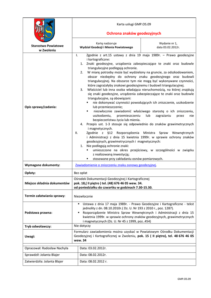 Karta usługi GMP.OS.09 Ochrona znaków geodezyjnych Kartę nadzoruje Wydział Geodezji i Mienia Powiatowego Starostwo Powiatowe w Zwoleniu I. 1. 2. 3. Opis sprawy/zadania: 4. II. 1. Wymagane dokumenty: Zgodnie z art.15 ustawy z dnia 19 maja 1989r. – Prawo geodezyjne i kartograficzne: Znaki geodezyjne, urządzenia zabezpieczające te znaki oraz budowle triangulacyjne podlegają ochronie. W miarę potrzeby może być wydzielony na gruncie, za odszkodowaniem, obszar niezbędny do ochrony znaku geodezyjnego oraz budowli triangulacyjnej. Na obszarze tym nie mogą być wykonywane czynności, które zagrażałyby znakowi geodezyjnemu i budowli triangulacyjnej. Właściciel lub inna osoba władająca nieruchomością, na której znajdują się znaki geodezyjne, urządzenia zabezpieczające te znaki oraz budowle triangulacyjne, są obowiązani: nie dokonywać czynności powodujących ich zniszczenie, uszkodzenie lub przemieszczenie; niezwłocznie zawiadomić właściwego starostę o ich zniszczeniu, uszkodzeniu, przemieszczeniu lub zagrażaniu przez nie bezpieczeństwu życia lub mienia. Przepis ust. 1-3 stosuje się odpowiednio do znaków grawimetrycznych i magnetycznych. Zgodnie z §12 Rozporządzenia Ministra Spraw Wewnętrznych i Administracji z dnia 15 kwietnia 1999r. w sprawie ochrony znaków geodezyjnych, grawimetrycznych i magnetycznych: Nie podlegają ochronie znaki: umieszczone na okres przejściowy, w szczególności w związku z realizowaną inwestycją; stosowane przy zakładaniu osnów pomiarowych. Zawiadomienie o zniszczeniu znaku osnowy geodezyjnej. Opłaty: Bez opłat Miejsce składnia dokumentów Ośrodek Dokumentacji Geodezyjnej i Kartograficznej pok. 18,( II piętro ) tel. (48) 676 46 05 wew. 34. od poniedziałku do czwartku w godzinach 7.30-15.30. Termin załatwiania sprawy: Niezwłocznie Podstawa prawna: Tryb odwoławczy: Uwagi: Wydanie nr 1, data 03.02.2012r. Ustawa z dnia 17 maja 1989r. - Prawo Geodezyjne i Kartograficzne - tekst jednolity z dn. 08.10.2010r.( Dz. U. Nr 193 z 2010 r., poz. 1287). Rozporządzenie Ministra Spraw Wewnętrznych i Administracji z dnia 15 kwietnia 1999r. w sprawie ochrony znaków geodezyjnych, grawimetrycznych i magnetycznych (Dz. U. Nr 45 z 1999, poz..454) Nie dotyczy Formularz zawiadomienia można uzyskać w Powiatowym Ośrodku Dokumentacji Geodezyjnej i Kartograficznej w Zwoleniu, pok. 15 ( II piętro), tel. 48 676 46 05 wew. 34 Opracował: Radosław Nachyła Data: 03.02.2012r. Sprawdził: Jolanta Blajer Data: 08.02.2012r. Zatwierdziła: Jolanta Blajer Data: 08.02.2012 r. GMP.OS.09