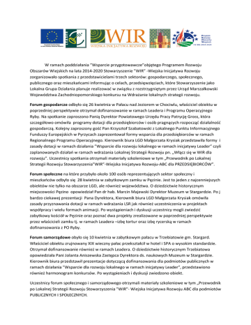 W ramach poddziałania ”Wsparcie przygotowawcze”objętego Programem Rozwoju Obszarów Wiejskich na lata 2014-2020 Stowarzyszenie ”WIR” -Wiejska Inicjatywa Rozwoju zorganizowało spotkania z przedstawicielami trzech sektorów: gospodarczego, społecznego, publicznego oraz mieszkańcami informując o celach, przedsięwzięciach, które Stowarzyszenie jako Lokalna Grupa Działania planuje realizować w związku z rozstrzygniętym przez Urząd Marszałkowski Województwa Zachodniopomorskiego konkursu na Wdrażanie lokalnych strategii rozwoju. Forum gospodarcze odbyło się 26 kwietnia w Pałacu nad Jeziorem w Chociwlu, właściciel obiektu w poprzedniej perspektywie otrzymał dofinansowanie w ramach Leadera i Programu Operacyjnego Ryby. Na spotkanie zaproszono Panią Dyrektor Powiatowego Urzędu Pracy Patrycję Gross, która szczegółowo omówiła programy dotacji dla przedsiębiorców i osób pragnących rozpocząć działalność gospodarczą. Kolejny zaproszony gość Pan Krzysztof Szabatowski z Lokalnego Punktu Informacyjnego Funduszy Europejskich w Pyrzycach zaprezentował formy wsparcia dla przedsiębiorców w ramach Regionalnego Programu Operacyjnego. Kierownik biura LGD Małgorzata Krysiak przedstawiła formy i zasady dotacji w ramach działania ”Wsparcie dla rozwoju lokalnego w ramach inicjatywy Leader” czyli zaplanowanych działań w ramach wdrażania Lokalnej Strategii Rozwoju pn. „Włącz się w WIR dla rozwoju”. Uczestnicy spotkania otrzymali materiały szkoleniowe w tym „Przewodnik po Lokalnej Strategii Rozwoju Stowarzyszenia”WIR”-Wiejska Inicjatywa Rozwoju-ABC dla PRZEDSIĘBIORCÓW”. Forum społeczne na które przybyło około 100 osób reprezentujących sektor społeczny i mieszkańców odbyło się 28 kwietnia w zabytkowym zamku w Pęzinie. Jest to jeden z najcenniejszych obiektów nie tylko na obszarze LGD, ale również województwa. O dziedzictwie historycznym miejscowości Pęzino opowiedział Pan dr hab. Marcin Majewski Dyrektor Muzeum w Stargardzie. Po j bardzo ciekawej prezentacji Pana Dyrektora, Kierownik biura LGD Małgorzata Krysiak omówiła zasady przyznawania dotacji w ramach wdrażania LSR jak również uczestniczenia w projektach współpracy i wielu formach animacji. Po wystąpieniach i dyskusji uczestnicy mogli zwiedzić zabytkowy kościół w Pęzinie oraz poznać dwa projekty zrealizowane w poprzedniej perspektywie przez właścicieli zamku tj. w ramach Leadera –izbę tortur oraz izbę rycerską w ramach dofinansowania z PO Ryby. Forum samorządowe obyło się 10 kwietnia w zabytkowym pałacu w Trzebiatowie gm. Stargard. Właściciel obiektu zrujnowany XIX wieczny pałac przekształcił w hotel i SPA o wysokim standardzie. Otrzymał dofinansowanie również w ramach Leadera. O dziedzictwie historycznym Trzebiatowa opowiedziała Pani Jolanta Aniszewska Zastępca Dyrektora ds. naukowych Muzeum w Stargardzie. Kierownik biura przedstawił prezentacje dotyczącą dofinansowania dla podmiotów publicznych w ramach działania ”Wsparcie dla rozwoju lokalnego w ramach inicjatywy Leader”, przedstawiono również harmonogram konkursów. Po wystąpieniach i dyskusji zwiedzono obiekt. Uczestnicy forum społecznego i samorządowego otrzymali materiały szkoleniowe w tym „Przewodnik po Lokalnej Strategii Rozwoju Stowarzyszenia ”WIR”- Wiejska Inicjatywa Rozwoju ABC dla podmiotów PUBLICZNYCH I SPOŁECZNYCH.