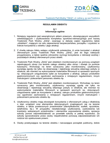 REGULAMIN OBIEKTU §1 Informacje ogólne 1. Niniejszy regulamin jest wewnętrznym aktem prawnym, obowiązującym wszystkich odwiedzających i uŜytkowników kompleksu sportowo-rekreacyjnego pod nazwą Trzebnicki Park Wodny „Zdrój”, zwanego w dalszej części regulaminu takŜe „obiektem”, mającym na celu zapewnienie bezpieczeństwa, porządku i czystości w trakcie korzystania z obiektu i jego atrakcji. 2. Z chwilą zakupu biletu wstępu uŜytkownik potwierdza, iŜ umie korzystać z atrakcji oferowanych przez Trzebnicki Park Wodny „Zdrój”, jest do tego naleŜycie przygotowany, a takŜe spełnia zdrowotne wymogi korzystania z rekreacji wodnej i pozostałych atrakcji oferowanych przez obiekt. 3. Trzebnicki Park Wodny „Zdrój” jest obiektem monitorowanym za pomocą urządzeń rejestrujących obraz (na terenie całego obiektu) albo obraz i dźwięk (w punkcie kasowym). Wchodząc na teren oznaczony jako monitorowany, uŜytkownicy wyraŜają zgodę nie tylko na obserwację i rejestrację wizualną własnego pobytu w obiekcie, ale równieŜ na wykorzystanie materiałów filmowych w sprawach spornych np. dotyczących uregulowania opłat za korzystanie z atrakcji, zakupu produktów gastronomicznych czy zgodności zachowania z niniejszym regulaminem, innym instrukcjami i poleceniami personelu obiektu itp. 4. Trzebnicki Park Wodny „Zdrój” jest obiektem monitorowanym. Wchodząc na teren oznaczony jako monitorowany, uŜytkownicy wyraŜają zgodę nie tylko na obserwację i rejestrację wizualną własnego pobytu w obiekcie, ale równieŜ na wykorzystanie materiałów filmowych w sprawach spornych np. dotyczących uregulowania opłat za korzystanie z atrakcji, zakupu produktów gastronomicznych czy zgodności zachowania z niniejszym regulaminem, innymi instrukcjami i poleceniami personelu obiektu itp. 5. UŜytkownicy obiektu mają obowiązek korzystania z oferowanych usług z dbałością o stan urządzeń oraz elementów dekoracyjnych znajdujących się na terenie obiektu, a takŜe powierzonych przedmiotów (identyfikatorów, szafek, ręczników, szlafroków, itp.). W przypadku niewłaściwego uŜytkowania, uszkodzenia lub kradzieŜy wskazanych przedmiotów i elementów wyposaŜenia obiektu, sprawca szkody ponosi odpowiedzialność za powstałe szkody w pełnej wysokości. Za szkody spowodowane przez osoby niepełnoletnie ponoszą odpowiedzialność ich rodzice lub opiekunowie prawni. 6. Osoby przebywające na terenie obiektu i naruszające porządek publiczny, dobre obyczaje lub stwarzające zagroŜenie dla siebie lub innych, a takŜe nie stosujące się do postanowień niniejszego regulaminu, zarządzeń i instrukcji obowiązujących w obiekcie oraz poleceń obsługi obiektu mogą zostać usunięte z obiektu bez prawa zwrotu kosztów zakupu biletu wstępu, niezaleŜnie od podjęcia innych działań przewidzianych prawem. 7. Korzystanie z przebieralni obiektu oraz szafek ubraniowych jest obowiązkowe. Ze względu na monitoring pomieszczeń przebieralni, naleŜy przebierać się w kabinach do tego przeznaczonych. 8. Administracja Trzebnickiego Parku Wodnego "Zdrój" zaleca nie wnoszenie na teren obiektu znacznej ilości gotówki, więcej niŜ jednej karty płatniczej, biŜuterii lub innych wartościowych przedmiotów. UŜytkownicy obiektu mają obowiązek, na czas korzystania z obiektu, przechowywania w szafkach depozytowych zlokalizowanych przy punkcie kasowym wniesionych ze sobą pieniędzy, kart płatniczych, biŜuterii lub innych wartościowych przedmiotów. Nie przyjmuje się do przechowania w szafkach depozytowych znacznej ilości gotówki, duŜej ilości biŜuterii, urządzeń takich jak laptop, palmtop, notebook, konsola do gier, odtwarzacz plików audio i video, aparat fotograficznych oraz kamera video. 9. Przed opuszczeniem obiektu, uŜytkownicy są zobowiązani do pozostawienia otwartych szafek ubraniowych, z których korzystali. 10. Przedmioty znalezione na terenie Trzebnickiego Parku Wodnego „Zdrój” naleŜy przekazać obsłudze obiektu. Na Ŝądanie znalazcy, kierownik zmiany kasjerskiej moŜe wydać potwierdzenie przekazania znalezionego mienia. Trzebnicki Park Wodny „Zdrój” zadysponuje znalezionymi przedmiotami zgodnie z właściwymi przepisami prawa. 11. Ze względów bezpieczeństwa nie naleŜy pozostawiać toreb, plecaków, a takŜe innych przedmiotów, których zawartości i właściwości nie moŜna naocznie rozpoznać poza miejscami do tego wyznaczonymi (szafkami ubraniowymi, półkami itp.). W przypadku zaistnienia takiej konieczności, personel obiektu lub wezwane słuŜby mają prawo przeprowadzić sprawdzenie zawartości i właściwości pozostawionych przedmiotów pod kątem ewentualnego zagroŜenia dla bezpieczeństwa innych uŜytkowników i samego obiektu. 12. Pracownikom obiektu względem uŜytkowników przysługuje tzw. prawo gospodarza obiektu. Zarząd Trzebnickiego Parku Wodnego „Zdrój” jest uprawniony do wydania trwałego lub tymczasowego zakazu korzystania z usług obiektu osobom, które notorycznie postępują wbrew postanowieniom regulaminu, zarządzeniom oraz instrukcjom obowiązującym w obiekcie lub w sposób raŜący łamią zasady współŜycia społecznego. 13. Kierownictwo Trzebnickiego Parku Wodnego „Zdrój” moŜe ograniczyć całkowicie lub częściowo moŜliwość korzystania z obiektu ze względów bezpieczeństwa, technicznych, w przypadku przepełnienia kompleksu lub w razie innej pilnej potrzeby czy nadzwyczajnej sytuacji. 14. NiezaleŜnie od przestrzegania zasad niniejszego regulaminu oraz dyspozycji, nakazów i zakazów umieszczonych na tablicach wewnątrz obiektu oraz w zarządzeniach i instrukcjach obowiązujących w obiekcie uŜytkownicy są obowiązani bezwzględnie podporządkować się poleceniom obsługi obiektu, w szczególności poleceniom słuŜb ratowniczych. 15. Na terenie obiektu obowiązuje bezwzględny zakaz przebywania w miejscach wyłączonych z ogólnego dostępu. 16. Zabrania się prowadze