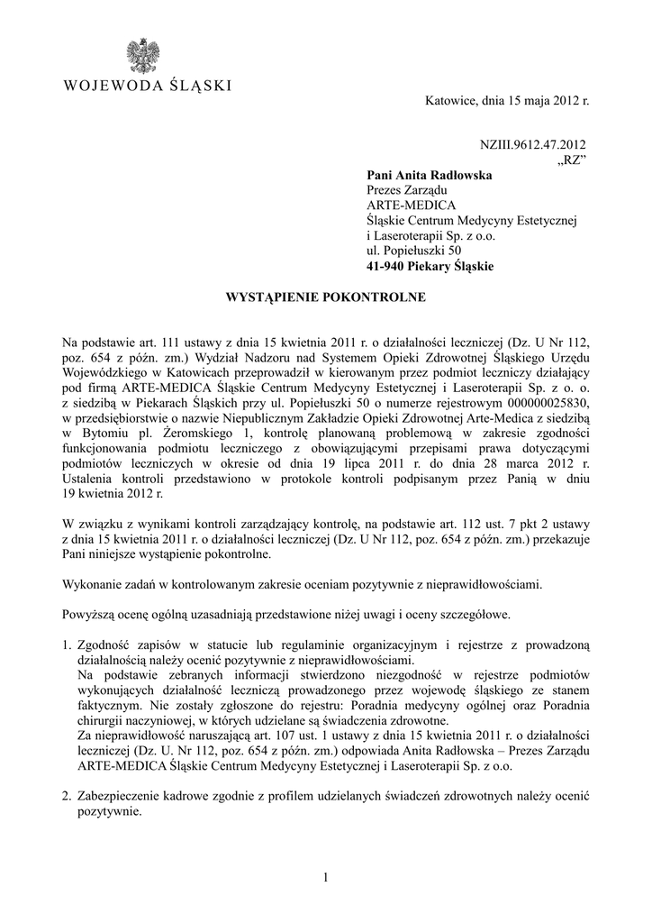 WO J E WO D A Ś LĄ S KI Katowice, dnia 15 maja 2012 r. NZIII.9612.47.2012 „RZ” Pani Anita Radłowska Prezes Zarządu ARTE-MEDICA Śląskie Centrum Medycyny Estetycznej i Laseroterapii Sp. z o.o. ul. Popiełuszki 50 41-940 Piekary Śląskie WYSTĄPIENIE POKONTROLNE Na podstawie art. 111 ustawy z dnia 15 kwietnia 2011 r. o działalności leczniczej (Dz. U Nr 112, poz. 654 z późn. zm.) Wydział Nadzoru nad Systemem Opieki Zdrowotnej Śląskiego Urzędu Wojewódzkiego w Katowicach przeprowadził w kierowanym przez podmiot leczniczy działający pod firmą ARTE-MEDICA Śląskie Centrum Medycyny Estetycznej i Laseroterapii Sp. z o. o. z siedzibą w Piekarach Śląskich przy ul. Popiełuszki 50 o numerze rejestrowym 000000025830, w przedsiębiorstwie o nazwie Niepublicznym Zakładzie Opieki Zdrowotnej Arte-Medica z siedzibą w Bytomiu pl. śeromskiego 1, kontrolę planowaną problemową w zakresie zgodności funkcjonowania podmiotu leczniczego z obowiązującymi przepisami prawa dotyczącymi podmiotów leczniczych w okresie od dnia 19 lipca 2011 r. do dnia 28 marca 2012 r. Ustalenia kontroli przedstawiono w protokole kontroli podpisanym przez Panią w dniu 19 kwietnia 2012 r. W związku z wynikami kontroli zarządzający kontrolę, na podstawie art. 112 ust. 7 pkt 2 ustawy z dnia 15 kwietnia 2011 r. o działalności leczniczej (Dz. U Nr 112, poz. 654 z późn. zm.) przekazuje Pani niniejsze wystąpienie pokontrolne. Wykonanie zadań w kontrolowanym zakresie oceniam pozytywnie z nieprawidłowościami. PowyŜszą ocenę ogólną uzasadniają przedstawione niŜej uwagi i oceny szczegółowe. 1. Zgodność zapisów w statucie lub regulaminie organizacyjnym i rejestrze z prowadzoną działalnością naleŜy ocenić pozytywnie z nieprawidłowościami. Na podstawie zebranych informacji stwierdzono niezgodność w rejestrze podmiotów wykonujących działalność leczniczą prowadzonego przez wojewodę śląskiego ze stanem faktycznym. Nie zostały zgłoszone do rejestru: Poradnia medycyny ogólnej oraz Poradnia chirurgii naczyniowej, w których udzielane są świadczenia zdrowotne. Za nieprawidłowość naruszającą art. 107 ust. 1 ustawy z dnia 15 kwietnia 2011 r. o działalności leczniczej (Dz. U. Nr 112, poz. 654 z późn. zm.) odpowiada Anita Radłowska – Prezes Zarządu ARTE-MEDICA Śląskie Centrum Medycyny Estetycznej i Laseroterapii Sp. z o.o. 2. Zabezpieczenie kadrowe zgodnie z profilem udzielanych świadczeń zdrowotnych naleŜy ocenić pozytywnie. 1 3. Spełnianie przez wyroby medyczne wykorzystywane w procesie udzielania świadczeń zdrowotnych wymagań określonych w odrębnych przepisach. Zgodnie z przyjętym protokołem ustnych wyjaśnień (akta kontroli znak: NZIII.9612.47.2012 z dnia 28 marca 2012 r. str. 90) podmiot nie posiada sprzętu medycznego. 4. Spełnianie warunku zawarcia umowy odpowiedzialności cywilnej naleŜy ocenić negatywnie. Przedstawiona w trakcie czynności kontrolnych polisa uniwersalna seria UN NR 0132204 nie została uznana przez organ kontrolujący za spełniającą wymagania stawiane w art. 17 ust. 1 pkt 4 ppkt a) w zakresie wskazanym w art. 25 ust. 1 pkt 1) ustawy z dnia 15 kwietnia 2011 r. o działalności leczniczej (Dz. U. Nr 112, poz. 654 z późn. zm.). Za powyŜszą nieprawidłowość odpowiedzialna jest Pani Anita Radłowska – Prezes Zarządu Arte-Medica Śląskie Centrum Medycyny Estetycznej i Laseroterapii Sp. z o. o. 5. Dokumentację organizacyjną podmiotu leczniczego naleŜy ocenić pozytywnie z nieprawidłowościami. W regulaminie organizacyjnym nie wskazano: firmy podmiotu wymaganej na podstawie art. 24 ust. 1 pkt 1) ustawy z dnia 15 kwietnia 2011 r. o działalności leczniczej (Dz. U. Nr 112, poz. 654 z późn. zm.), wysokości opłaty za udostępnianie dokumentacji medycznej wymaganej na podstawie art. 24 ust. 1 pkt 9) ustawy z dnia 15 kwietnia 2011 r. o działalności leczniczej (Dz. U. Nr 112, poz. 654 z późn. zm.), wysokości opłat za udzielane świadczenia zdrowotne inne niŜ finansowane ze środków publicznych wymaganej na podstawie art. 24 ust. 1 pkt 12) ustawy z dnia 15 kwietnia 2011 r. o działalności leczniczej (Dz. U. Nr 112, poz. 654 z późn. zm.). Ponadto w treści regulaminu uŜyto nieobowiązującej nomenklatury „zakład”, która winna być zastąpiona pojęciem „podmiot wykonujący działalność leczniczą”. Przedstawiony w trakcie czynności kontrolnych statut sporządzono na podstawie nieobowiązującej ustawy z dnia 30 sierpnia 1991 r. o zakładach opieki zdrowotnej (tj. Dz.U. z 2007r. Nr 14, poz. 89 z późn. zm.). Nie został zaktualizowany o zapisy zawarte w ustawie z dnia 15 kwietnia 2011 r. o działalności leczniczej (Dz. U. Nr 112, poz. 654 z późn. zm.) oraz zawiera strukturę organizacyjną niezgodną z zapisami w rejestrze podmiotów wykonujących działalność leczniczą prowadzoną przez wojewodę śląskiego i stanem faktycznym. Za powyŜsze nieprawidłowości odpowiedzialna jest Pani Anita Radłowska – Prezes Zarządu Arte-Medica Śląskie Centrum Medycyny Estetycznej i Laseroterapii Sp. z o. o. Umowy na świadczenie usług zdrowotnych zawarte pomiędzy Ewą Zmarzlik – pełnomocnikiem Arte-Medica Śląskie Centrum Medycyny Estetycznej i Laseroterapii Sp. z o. o. a Pawłem Radłowskim oraz Anitą Radłowską zawierają błędy formalne dot. zakresu udzielanych świadczeń zdrowotnych, miejsca udzielania świadczeń zdrowotnych oraz posiadanych kwalifikacji do udzielania świadczeń przez Zleceniobiorcę. Strona internetowa kontrolowanego podmiotu http://felicita.nazwa.pl/avitamed2/index.php zawierała w swojej treści nieaktualne dane, dotyczące m.in. miejsc udzielania świadczeń zdrowotnych oraz zakresu udzielanych świadczeń zdrowotnych. Obecnie strona internetowa kontrolowanego podmiotu została zaktualizowana o dane zgodne ze stanem faktycznym. 6. Pomieszczenia podmiotu, w których są udzielane świadczenia zdrowotne naleŜy ocenić pozytywnie. 2 Mając na uwadze powyŜsz