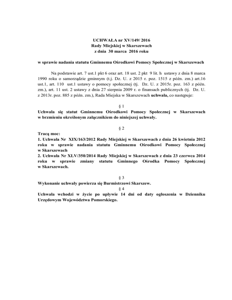 UCHWAŁA nr XV/149/ 2016 Rady Miejskiej w Skarszewach z dnia 30 marca 2016 roku w sprawie nadania statutu Gminnemu Ośrodkowi Pomocy Społecznej w Skarszewach Na podstawie art. 7 ust.1 pkt 6 oraz art. 18 ust. 2 pkt 9 lit. h ustawy z dnia 8 marca 1990 roku o samorządzie gminnym (t.j. Dz. U. z 2015 r. poz. 1515 z późn. zm.) art.16 ust.1, art. 110 ust.1 ustawy o pomocy społecznej (tj. Dz. U. z 2015r. poz. 163 z późn. zm.), art. 11 ust. 2 ustawy z dnia 27 sierpnia 2009 r. o finansach publicznych (tj. Dz. U. z 2013r. poz. 885 z późn. zm.), Rada Miejska w Skarszewach uchwala, co następuje: §1 Uchwala się statut Gminnemu Ośrodkowi Pomocy Społecznej w Skarszewach w brzmieniu określonym załącznikiem do niniejszej uchwały. §2 Tracą moc: 1. Uchwała Nr XIX/163/2012 Rady Miejskiej w Skarszewach z dnia 26 kwietnia 2012 roku w sprawie nadania statutu Gminnemu Ośrodkowi Pomocy Społecznej w Skarszewach 2. Uchwała Nr XLV/350/2014 Rady Miejskiej w Skarszewach z dnia 23 czerwca 2014 roku w sprawie zmiany statutu Gminnego Ośrodka Pomocy Społecznej w Skarszewach. §3 Wykonanie uchwały powierza się Burmistrzowi Skarszew. §4 Uchwała wchodzi w życie po upływie 14 dni od daty ogłoszenia w Dzienniku Urzędowym Województwa Pomorskiego. Uzasadnienie W związku z nałożeniem na gminę nowych zadań związanych m.in. z ustawą o pomocy państwa w wychowaniu dzieci zachodzi konieczność aktualizacji Statutu GOPS. Statut z 2012 r. posiada już uchwalone przez Radę Miejską zmiany. Dodatkowo podstawy prawne, na których opierał się dotychczasowy statut zostały zastąpione w znacznej mierze tekstami jednolitymi ustaw. W związku z tym, iż zakres zmian jest znaczący proponuje się nową treść Statutu Gminnego Ośrodka Pomocy Społecznej w Skarszewach, aby wprowadzenie kolejnych zmian nie spowodowało nieczytelności dokumentu. Załącznik nr 1 do Uchwały Nr XV/149/16 Rady Miejskiej w Skarszewach z dnia 30 marca 2016 r. STATUT GMINNEGO OŚRODKA POMOCY SPOŁECZNEJ W SKARSZEWACH I. Postanowienia ogólne. §1 Gminny Ośrodek Pomocy Społecznej w Skarszewach zwany dalej „Ośrodkiem” działa na podstawie: 1. ustawy z dnia 8 marca 1990 r. o samorządzie gminnym (j.t. Dz. U. z 2015 r. poz. 1515 z późn. zm.), 2. ustawy z dnia 21 listopada 2008 r. o pracownikach samorządowych (t.j. Dz. U. z 2014 r. poz. 1202 z późn. zm.), 3. ustawy z dnia 12 marca 2004 r. o pomocy społecznej ( j.t. Dz. U. z 2015 r. nr 163 poz. 1362 z późn. zm.), 4. ustawy z dnia 28 listopada 2003 r. o świadczeniach rodzinnych (j.t. Dz. U. z 2015 r. poz. 114 z późn. zm.), 5. ustawy z dnia 04 kwietnia 2014 r. o ustaleniu i wypłacie zasiłków dla opiekunów (Dz. U. 2014 r., poz. 567 z późn. zm.), 6. ustawy z dnia 5 grudnia 2014 r. o Karcie Dużej Rodziny (Dz. U. z 2014 r. poz. 1863 z późn. zm.), 7. ustawy z dnia 7 września 2007 r. o pomocy osobom uprawnionym do alimentów (t.j. Dz. U. z 2016 poz. 169), 8. ustawy z dnia 29 lipca 2005 r. o przeciwdziałaniu przemocy w rodzinie (Dz. U. z 2015 r. poz. 1390 z późn. zm.), 9. ustawy z dnia 9 czerwca 2011 r. o wspieraniu rodziny i systemie pieczy zastępczej (t.j. Dz. U. z 2015, poz. 332 z późn. zm.), 10. ustawy z dnia 11 lutego 2016 r. o pomocy państwa w wychowaniu dzieci (Dz.U. z 2016 r., poz.195), 11. ustawy z 19 sierpnia 1994 r. o ochronie zdrowia psychicznego (j.t. Dz. U. z 2011r. nr 231 poz. 1375 z późn. zm. ), 12. ustawy z dnia 27 sierpnia 2004 r. o świadczeniach opieki zdrowotnej finansowanych ze środków publicznych (j.t. Dz. U. z 2015 r. poz. 581 z późn. zm. ) 13. ustawy z dnia 29 sierpnia 1997 r. o ochronie danych osobowych (j.t. Dz. U. z 2015 r. poz. 2135 z późn. zm.), 14. ustawy z dnia 13 października 1998 r. o systemie ubezpieczeń społecznych (j.t. Dz. U. z 2015 r. poz. 121 z późn. zm.), 15. ustawy z dnia 14 czerwca 1960 r. Kodeks postępowania administracyjnego (j.t. Dz. U. z 2016 r. poz. 23), 16. ustawy z dnia 29 września 1994 r. o rachunkowości (j.t. Dz. U. z 2013 r. nr 152, poz. 330 z późn. zm.), 17. ustawy z dnia 27 sierpnia 2009 r. o finansach publicznych (Dz. U. z 2013 r., poz. 885 z późn. zm ), 18. ustawy z dnia 24 stycznia 1991 r. o kombatantach oraz niektórych osobach będących ofiarami represji wojennych i okresu powojennego (t.j. Dz.U. 2014 r., poz. 1206 z późn. zm.), 19. uchwały Nr VIII/56/03 Rady Miejskiej w Skarszewach z dnia 30 kwietnia 2003 r. w sprawie utworzenia jednostki budżetowej o nazwie „Gminny Ośrodek Pomocy Społecznej w Skarszewach” , 20. innych przepisów prawnych dotyczących „Ośrodka” i jednostek budżetowych, 21. niniejszego statutu zatwierdzonego przez Radę Miejską w Skarszewach. §2 „Ośrodek” jest jednostką organizacyjną Gminy Skarszewy. §3 1. 2. 3. 4. Siedziba „Ośrodka” znajduje się w Skarszewach przy ul. Szkolnej 9. Terenem działania „Ośrodka” jest gmina Skarszewy. Obszar działania dzieli się na rejony. Podziału obszaru działania na rejony dokonuje Dyrektor „Ośrodka” uwzględniając lokalne uwarunkowania i potrzeby z zapewnieniem należytej dostępności świadczeń. §4 1. Ogólny nadzór nad działalnością „Ośrodka” oraz nad realizacją zadań własnych gminy sprawuje Burmistrz Skarszew. 2. Nadzór merytoryczny nad działalnością „Ośrodka” sprawuje Wojewoda Pomorski za pośrednictwem Wydziału Polityki Społecznej Pomorskiego Urzędu Wojewódzkiego w Gdańsku. II. Cele i zadania Ośrodka. §5 Celem działalności „Ośrodka” jest: 1. umożliwienie osobom i rodzinom przezwyciężenie trudnych sytuacji życiowych, których nie są one w stanie pokonać, wykorzystując własne uprawnienia, zasoby i możliwości, 2. wsparcie osób i rodzin w wysiłkach zmierzających do zaspakajanie niezbędnych potrzeb i umożliwienie im życia w warunkach odpowiadających godności człowieka, 3. przeciwdziałanie wykluczeniu społecznemu przez podejmowanie działań zmierzających do życiowego usamodzielnienia osób i rodzin oraz ich integrac