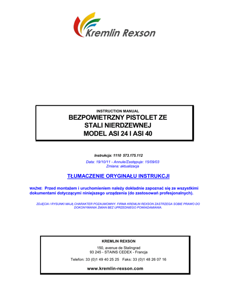 INSTRUCTION MANUAL BEZPOWIETRZNY PISTOLET ZE STALI NIERDZEWNEJ MODEL ASI 24 I ASI 40 Instrukcja: 1110 573.175.112 Data: 19/10/11 - Annule/Zastępuje: 15/09/03 Zmiana: aktualizacja TŁUMACZENIE ORYGINAŁU INSTRUKCJI Przed montażem i uruchomieniem należy dokładnie zapoznać się ze wszystkimi dokumentami dotyczącymi niniejszego urządzenia (do zastosowań profesjonalnych). WAŻNE: ZDJĘCIA I RYSUNKI MAJĄ CHARAKTER POZAUMOWNY. FIRMA KREMLIN REXSON ZASTRZEGA SOBIE PRAWO DO DOKONYWANIA ZMIAN BEZ UPRZEDNIEGO POWIADAMIANIA. KREMLIN REXSON 150, avenue de Stalingrad 93 245 - STAINS CEDEX - Francja Telefon: 33 (0)1 49 40 25 25 Faks: 33 (0)1 48 26 07 16 www.kremlin-rexson.com INSTRUKCJA OBSŁUGI BEZPOWIETRZNY PISTOLET MODEL ASI 24 - ASI 40 Szanowni Klienci, Chcielibyśmy podziękować za zakup naszego bezpowietrznego pistoletu natryskowego. Stali się Państwo właścicielami najbardziej niezawodnego pistoletu natryskowego dostępnego obecnie na rynku. W celu zagwarantowania pełnej satysfakcji z dokonanej inwestycji, firma KREMLIN REXSON dołożyła szczególnych starań podczas całego procesu projektowego oraz procesu produkcyjnego. Dla osiągnięcia najlepszych wyników, oraz zapewnienia wydajnej i bezpiecznej pracy z wykorzystaniem pistoletu natryskowego, zalecamy zapoznanie się z niniejszą instrukcją obsługi i serwisu urządzenia. Nieprzestrzeganie instrukcji i środków ostrożności opisanych w niniejszej instrukcji może skrócić trwałość użytkową urządzenia, doprowadzić do kłopotów związanych z jego użytkowaniem oraz wytworzenia niebezpiecznych warunków. 1. UWAGI DOTYCZĄCE BEZPIECZEŃSTWA OSTRZEŻENIE: Nieprawidłowe korzystanie z urządzeń i dodatków może doprowadzić do ich uszkodzenia powodując poważne obrażenia ciała, zagrożenie pożarowe lub wybuchowe oraz do skrócenia trwałości użytkowej urządzeń. W związku z powyższym należy zapoznać się i przestrzegać przedstawionych instrukcji bezpieczeństwa. Pracownicy zajmujący się obsługą i serwisowaniem sprzętu muszą zapoznać się ze wszystkimi wymaganiami dotyczącymi bezpieczeństwa przedstawionymi w niniejszej instrukcji. Kierownik warsztatu musi dopilnować, aby pracownicy w pełni zapoznali się i przestrzegali uwag dotyczących bezpieczeństwa. Przed korzystaniem z urządzeń należy przeczytać wszystkie instrukcje obsługi oraz znaczniki urządzeń. Należy zapoznać się i przestrzegać miejscowych instrukcji dotyczących bezpieczeństwa. WYMAGANIA DOTYCZĄCE INSTALACJI Uziemienie urządzeń Korzystanie z urządzeń tylko w odpowiednio wentylowanych pomieszczeniach dla zwiększenia ochrony zdrowia. Nieprawidłowe korzystanie z urządzeń natryskowych i dodatków może doprowadzić do ich uszkodzenia powodując poważne obrażenia ciała, zagrożenie pożarowe lub wybuchowe. Palenie w obszarze natryskowym jest zabronione. W obszarze natryskowym nie należy nigdy przechowywać farb i rozpuszczalników. Zawsze należy zamykać pojemniki i puszki. Obszar natryskowy należy zawsze utrzymywać w czystości bez żadnych pozostałości (rozpuszczalników, ścierek, itp.). Należy zapoznać się z instrukcjami technicznymi producenta farb i rozpuszczalników. Natrysk w przypadku niektórych materiałów może doprowadzić do powstania niebezpiecznych warunków pracy. Operator dla zabezpieczenia powinien mieć maskę oddechową, krem do rąk i okulary. (Więcej informacji znajduje się w rozdziale „Wyposażenie bezpieczeństwa pracy” podręcznika KREMLIN). KREMLIN Strona 1 Instrukcja: 573.060.212 WYMAGANIA SPRZĘTOWE Ciśnienie robocze urządzeń jest bardzo wysokie. Należy w związku z tym podjąć pewne kroki mające na celu niedopuszczenie do wypadków lub powstania niebezpiecznych warunków pracy. Nigdy nie należy przekraczać czasu użytkowania przewidzianego dla podzespołów urządzenia. PRZEWODY Nigdy nie należy korzystać z przewodów, których maksymalna odporność na rozerwanie jest niższa, niż czterokrotność ciśnienia serwisowego pompy (patrz: karta techniczna). Należy dopilnować, aby przewody nie były pozaginane, nieszczelne i nierozwinięte. Należy dopilnować, aby przewody były w dobrym stanie i nie wykazywały oznak zużycia. W celu podłączenia pompy do pistoletu natryskowego należy używać tylko statycznego przewodu powietrznego. Wszystkie łączniki muszą być szczelne i w dobrym stanie. POMPA Urządzenie należy uziemić (należy w tym celu skorzystać z połączenia dostarczonego wraz z pompą). Nie należy korzystać z jakichkolwiek produktów lub rozpuszczalników niekompatybilnych z podzespołami pompy. W celu wydłużenia okresu użytkowania urządzenia, do natrysku materiału należy korzystać z odpowiedniego rozpuszczalnika. W szczególnych przypadkach prosimy o kontakt z naszą firmą lub dostawcą materiałów w celu modyfikacji składu materiałów lub zalecenia innego rozpuszczalnika do czyszczenia. PISTOLET Nigdy nie należy przecierać końcówki przy pomocy palców. Nigdy nie należy kierować pistoletu w kierunku osób lub jakiejkolwiek części ciała. Przed przeprowadzaniem jakichkolwiek działań serwisowych pistoletu należy obniżyć ciśnienie, w tym także w przewodach. WYMAGANIA DOTYCZĄCE KONSERWACJI Urządzeń nigdy nie należy modyfikować. Codziennie należy je sprawdzać i utrzymywać w dobrym stanie, a zużyte części wymieniać tylko na części KREMLIN. Przed czyszczeniem lub wyjmowaniem podzespołów urządzenia konieczne jest: - zatrzymanie pompy poprzez odcięcie dopływu sprężonego powietrza, - otwarcie zaworu spłukującego pompy, - obniżenie ciśnienia w przewodach doprowadzających materiał poprzez otwarcie przepływu cieczy w pistolecie. 2. BEZPOWIETRZNY NATRYSK BEZPOWIETRZNY natrysk przy wysokim ciśnieniu bez powietrza gwarantuje: - zastosowanie materiałów o wysokiej lepkości, - bardzo precyzyjna szerokość nadmuchu dla wybranego kąta końcówki, - wysoka gęstość warstwy (50 to 100 µ) i pozwala na