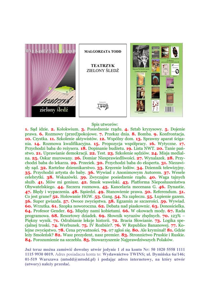 MAŁGORZATA TODD TEATRZYK ZIELONY ŚLEDŹ Spis utworów: 1. Sąd idzie. 2. Kolokwium. 3. Posiedzenie rządu. 4. Sztab kryzysowy. 5. Dojenie prawa. 6. Rozmowy (przed)pokojowe. 7. Przekaz dnia. 8. Bomba. 9. Konfrontacja. 10. Czystka. 11. Szkolenie aktywistów. 12. Wspólny dom. 13. Sprawny aparat ścigania. 14. Rozmowa kwalifikacyjna. 15. Propozycja współpracy. 16. Wytyczne. 17. Przychodzi baba do reżysera. 18. Dopinanie budżetu. 19. Lista NWT. 20. Tanie państwo. 21. Uprawianie demokracji. 22. Test. 23. Szkolenie sędziów. 24. Misja medialna. 25. Oskar murowany. 26. Domiar Niesprawiedliwości. 27. Wynalazek. 28. Przychodzi baba do lekarza. 29. Przeciek. 30. Przychodzi baba do eksperta. 31. Niezawisły sąd. 32. Rzetelne dziennikarstwo. 33. Kręcenie lodów. 34. Dziennik telewizyjny. 35. Przychodzi artysta do baby. 36. Wywiad z Anonimowym Autorem. 37. Wesele celebrytki. 38. Wskazówki. 39. Zwyczajne posiedzenie rządu. 40. Waga tajnych służb. 41. Mów mi geniusz. 42. Smok wawelski. 43. Platforma Nieposłuszeństwa Obywatelskiego. 44. Szczera rozmowa. 45. Kancelaria mecenasa G. 46. Dynastie. 47. Błędy i wypaczenia. 48. Sąsiedzi. 49. Stanowienie prawa. 50. Referendum. 51. Co jest grane? 52. Holowanie HGW. 53. Gang. 54. Na zapleczu. 55. Łupienie gazem. 56. Super gwiazda. 57. Owoce zwycięstwa. 58. Egzamin ze szczerości. 59. Wywiad. 60. Wrzutka. 61. Szopka noworoczna. 62. Debata nad piaskownic. 63. Donosicielka. 64. Profesor Gender. 65. Między nami kobietami. 66. W okowach mody. 67. Rada programowa. 68. Resortowy dziadek. 69. Słownik wyrazów zbędnych. 70. 123% – Piękny wynik. 71. Odrabianie lekcje historii. 72. Bracia Słowianie. 73. Logika specjalnej troski. 74. Werbunek. 75. IV Rozbiór?. 76. W Republice Bananowej. 77. Kolejne zwycięstwo. 78. Cena prywatności. 79. 07 zgłoś się. 80. Ale kryminał! 81. Gdzie leży Smoleńsk? 82. Wasz prezydent, nasz premier. 83. Stronnictwo Pruskie i Ruskie. 84. Porozumienie na szczeblu. 85. Stowarzyszenie Najprawdziwszych Polaków. Już teraz można zamówić dowolny utwór jedynie 1 zł na konto Nr: 50 1020 5558 1111 1115 9930 0019. Adres posiadacza konta to: Wydawnictwo TWINS; ul. Dymińska 6a/146; 01-519 Warszawa ([email protected]) i podając adres internetowy, na który utwór (utwory) należy przesłać.