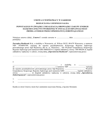 UMOWA O WSPÓŁPRACY W ZAKRESIE ROZLICZANIA UJEMNEGO SALDA POWSTAŁEGO W ZWIĄZKU Z REALIZACJĄ OBOWIĄZKU ZAKUPU ENERGII ELEKTRYCZNEJ WYTWORZONEJ W INSTALACJI ODNAWIALNEGO ŹRÓDŁA ENERGII PRZEZ SPRZEDAWCĘ ZOBOWIĄZANEGO Niniejsza umowa (dalej „Umowa”) została zawarta w ......................., dnia ................................... r. pomiędzy: Zarządcą Rozliczeń S.A. z siedzibą w Warszawie, ul. Wilcza 50/52, 00-679 Warszawa, o numerze NIP: 7010095709, wpisaną do rejestru przedsiębiorców Krajowego Rejestru Sądowego prowadzonego przez Sąd Rejonowy dla m. st. Warszawy , XII Wydział Gospodarczy Krajowego Rejestru Sądowego pod numerem KRS 0000292313, kapitał zakładowy równy: 500 000,00 zł, kapitał zakładowy wpłacony w całości, zwaną dalej „Operatorem Rozliczeń”, reprezentowaną przez: ……………………………………………. a ............................................................................................. z siedzibą w ..........................., ul. .................................., ....-......... ..........................., o numerze NIP: ................................, wpisaną do rejestru przedsiębiorców prowadzonego przez Sąd Rejonowy ................................., ...... Wydział Gospodarczy Krajowego Rejestru Sądowego pod numerem KRS ........................, kapitał zakładowy równy: ........................ zł, [kapitał zakładowy wpłacony w całości], zwaną dalej „Sprzedawcą Zobowiązanym”, reprezentowaną przez: 1. ................................................................................................ 2. ................................................................................................ Każda ze stron Umowy może być zamiennie nazywana Stroną, a łącznie Stronami. PREAMBUŁA Zważywszy, że: A. Sprzedawca Zobowiązany, zgodnie z art. 92 ust. 1 ustawy z dnia 20 lutego 2015 r. o odnawialnych źródłach energii (Dz.U. z 2015 r., poz. 478, ze zm.), zwaną dalej „Ustawą o OZE” jest zobowiązany do zakupu energii elektrycznej wytworzonej w instalacjach odnawialnego(ych) źródła(eł) energii przyłączonych do sieci operatorów systemów dystrybucyjnych, każdej o łącznej mocy zainstalowanej elektrycznej mniejszej niż 500 kW, od wytwórców tej energii, którzy wygrali aukcję, po stałej cenie ustalonej w aukcji oraz w ilości określonej przez danego wytwórcę w złożonej przez niego ofercie, o której mowa w art. 79 Ustawy o OZE B. Operator Rozliczeń, zgodnie z art. 93 ust. 9 Ustawy o OZE jest zobowiązany na zasadach określonych w Ustawie o OZE pokrywać Sprzedawcy Zobowiązanemu ujemne Salda; Strony, celem realizacji powyższych obowiązków, postanowiły zawrzeć poniższą Umowę. §1 Postanowienia wstępne 1. Strony przyjmują, że podstawę do ustalenia i realizacji warunków Umowy stanowi Ustawa o OZE, wraz z aktami wykonawczymi wydanymi na podstawie delegacji zawartych w tej ustawie. 2. Strony oświadczają, że znana jest im treść oraz zobowiązują się do przestrzegania przepisów wynikających z aktów, o których mowa w ust. 1. §2 Definicje 1. W Umowie poniższe terminy będą miały następujące znaczenie: a) Giełda Towarowa - podmiot prowadzący giełdę towarową w rozumieniu ustawy z dnia 26 października 2000 r. o giełdach towarowych (Dz. U. z 2014 r. poz. 197, ze zm.). b) Obowiązek Zakupu Energii z OZE - obowiązek Sprzedawcy Zobowiązanego do zakupu energii elektrycznej wytworzonej w instalacjach odnawialnego źródła energii, przyłączonych do sieci dystrybucyjnej każdej o łącznej mocy zainstalowanej elektrycznej mniejszej niż 500 kW, od wytwórcy tej energii, który wygrał aukcję, po stałej cenie ustalonej w aukcji, wynikający z Ustawy o OZE. c) Okres Obowiązku – dla każdej instalacji odnawialnego źródła oddzielnie, okres, ustalony w przepisach wydanych na podstawie z art. 77 ust 1 Ustawy o OZE d) Okres Rozliczeniowy - miesiąc kalendarzowy. e) Saldo - w danym Okresie Rozliczeniowym, dla danej instalacji odnawialnego źródła energii objętej Obowiązkiem Zakupu Energii z OZE, różnica między: (i) wartością energii elektrycznej wytworzonej w instalacji odnawialnego źródła energii i sprzedanej w danym Okresie Rozliczeniowym, rozumianą jako suma iloczynów w ujęciu dobowym: a. ilości energii elektrycznej objętej Obowiązkiem Zakupu Energii z OZE, wyrażonej w MWh, wytworzonej i sprzedanej oraz b. średniej dziennej ceny energii elektrycznej, stanowiącej średnią arytmetyczną obliczoną ze średnich ważonych wolumenem transakcji sesyjnych giełdowych cen energii elektrycznej we wszystkich godzinach dnia dostawy tej energii, zawartych na rynku, na którym są zawierane transakcje sesyjne giełdowe z dostawą energii elektrycznej w dniu następnym i dwa dni po dniu 2 zawarcia transakcji sesyjnych giełdowych, niezawierającej kwot podatku od towarów i usług, wyrażonej w złotych z dokładnością do jednego grosza za 1 MWh, obliczanej i publikowanej przez Giełdę Towarową; a (ii) wartością zakupu tej energii elektrycznej przez Sprzedawcę Zobowiązanego wynikającą z realizacji Obowiązku Zakupu Energii z OZE, rozumianą jako iloczyn ilości energii elektrycznej wyrażonej w MWh z dokładnością do 1 kWh, objętej Obowiązkiem Zakupu Energii z OZE wytworzonej i sprzedanej w danym Okresie Rozliczeniowym oraz ceny określonej przez wytwórcę w wygranej aukcji niezawierającej kwot podatku od towarów i usług, wyrażonej w złotych z dokładnością do jednego grosza za 1 MWh, z uwzględnieniem korekt kwot wynikających ze sprawozdań za poprzednie miesiące. 2. f) Sprawozdanie – sprawozdanie miesięczne, o którym mowa w art. 93 ust. 1 pkt 4 Ustawy o OZE. g) Wniosek - wniosek o pokrycie ujemnego Salda danej instalacji, o którym mowa w art. 93 ust. 1 pkt 4 Ustawy o OZE. Wszystkie określenia i pojęcia użyte w Umowie, o ile nie zostały inaczej zdefiniowane w Umowie, posiadają znaczenie 