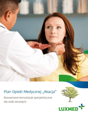 Grupa LUX MED już ponad 20 lat świadczy usługi medyczne na najwyższym poziomie. Jako lider prywatnych usług medycznych na rynku zapewniamy Naszym Pacjentom kompleksową opiekę ambulatoryjną, diagnostyczną, rehabilitacyjną oraz z zakresu chirurgii jednego dnia. Dla osób dorosłych, które korzystają z usług zaufanego lekarza pierwszego kontaktu we własnym zakresie, ale które potrzebują szybko skorzystać z konsultacji u lekarzy specjalistów, przygotowaliśmy specjalny Plan Opieki Medycznej AKACJA. Plan Opieki Medycznej AKACJA skierowany jest do osób od ukończenia 18 do ukończenia 65 roku życia. Umożliwia dostęp do lekarzy specjalistów w ponad 70 placówkach własnych Grupy LUX MED (LUX MED i Medycyna Rodzinna) wymienionych na stronie www.luxmed.pl oraz, w zależności od dostępności usług, w ogólnopolskiej sieci ponad 500 placówek współpracujących wymienionych na stronie www.luxmed.pl/placowkiwspolpracujace_wspolplacenie Plan realizowany w systemie „niskie opłaty, małe dopłaty” zakłada bardzo niską opłatę roczną i system niskich dopłat do wizyt u specjalistów oraz wybranych badań diagnostycznych dopiero w momencie faktycznego skorzystania z usługi. Odpowiadamy na Twoje najważniejsze potrzeby medyczne i oferujemy: nielimitowany dostęp bez skierowania do lekarzy 16 specjalizacji (z dopłatą 15 złotych do konsultacji), nielimitowany dostęp do podstawowych badań diagnostycznych (z dopłatą do badań w wysokości 15 złotych), 24 godzinny dostęp do Telefonicznej Informacji Medycznej. RTG i EKG Dbamy o Twoją wygodę oraz oszczędzamy Twój czas i pieniądze oferując: elektroniczne zawarcie umowy, wraz z dokonaniem płatności przez wygodny system płatności internetowych PayU S.A. co umożliwia aktywację Planu dowolnego dnia roboczego, w pełni zintegrowany system informatyczny, dzięki któremu każdy lekarz w dowolnej placówce własnej ma elektroniczny dostęp do historii medycznej Pacjenta oraz wyników jego badań, dzięki systemowi współpłacenia Pacjent oszczędza pieniądze płacąc niewielki abonament i dopłacając niskie kwoty dopiero w momencie faktycznego skorzystania z usługi, 10% zniżki na usługi świadczone w placówkach własnych Grupy LUX MED nieobjęte planem, jednorazowa płatność za cały rok. SPOSÓB PŁATNOŚCI* OPŁATA ROCZNA Płatność jednorazowa 450 zł * Umowa zawierana jest na okres 12 miesięcy Jeżeli jesteś zainteresowany ofertą: skorzystaj z modułu e-oferty na stronie www.luxmed.pl skontaktuj się z naszym Doradcą: od poniedziałku do piątku w godzinach 8-18 pod numerem telefonu 22 339 37 33 napisz do nas na adres e-mail: [email protected] Zakres Planu Opieki Medycznej „Akacja” ZAKRES OPIEKI MEDYCZNEJ Dostęp do placówek własnych Grupy LUX MED (LUX MED i Medycyna Rodzinna) ✔ Dostęp do ogólnopolskiej dedykowanej sieci placówek współpracujących z zakresem usług placówek opisanym na Portalu Pacjenta ✔ Ogólnopolska rezerwacja terminów wizyt i badań (telefoniczna 22 33 22 888 lub poprzez system e-rezerwacji) ✔ SMS-owe przypomnienie o umówionych Grupy LUX MED ( z opcją odwołania wizyty) ✔ wizytach w placówkach własnych Portal Pacjenta* ✔ 24h Telefoniczna Informacja Medyczna ✔ Konsultacje specjalistyczne w cenie 15 zł za konsultację ✔ Konsultacyjne zabiegi ambulatoryjne ✔ Podstawowe badania diagnostyczne: badania laboratoryjne badania rentgenowskie w cenie 15 zł za badanie badania elektrokardiograficzne w cenie 15 zł za badanie inne badania diagnostyczne ✔ 10% rabatu na pozostałe usługi ambulatoryjne świadczone w placówkach własnych Grupy LUX MED ✔ 10% rabatu na procedury medyczne oferowane w Szpitalu LUX MED ✔ * Portal Pacjenta - dostęp do zintegrowanej platformy informatycznej (zarządzanie własną kartoteką Pacjenta, umawianie i odwoływanie wizyt, dostęp do wyników badań, komunikacja z lekarzem, możliwość zakupu dodatkowych ofert indywidualnych Grupy LUX MED wraz z pełną obsługą płatności, i in.). Szczegółowe definicje usług 24h Telefoniczna Informacja Medyczna W ramach 24h Telefonicznej Informacji Medycznej nasi Pacjenci dzwoniący z problemem zdrowotnym na infolinię Grupy LUX MED pod numerem 22 33 22 888 mogą uzyskać pomoc przez całą dobę. Zespół TIM tworzą doświadczeni lekarze, pielęgniarki i ratownicy medyczni, którzy zbierają od dzwoniącego informacje i starają się doradzić, jakie działania należy w danej sytuacji podjąć. Zespół TIM posiada także informacje o dyżurach aptek i szpitali. Konsultacje specjalistyczne w cenie 15 zł za konsultację W ramach Planu, Pacjent ma nielimitowany dostęp do konsultacji lekarzy w sytuacjach chorobowych, zaostrzenia się chorób przewlekłych, pomocy w nagłych zachorowaniach oraz poradnictwa ogólnomedycznego. Konsultacje specjalistyczne obejmują: wywiad, poradę lekarza wraz z czynnościami podstawowymi niezbędnymi do postawienia diagnozy, podjęcia właściwej decyzji terapeutycznej oraz monitorowania leczenia. Opłata za realizowaną konsultację lekarza objętą zakresem Planu, wynosi 15 zł. LUX MED w okresie trwania Planu gwarantuje Pacjentom dostęp do lekarzy bez skierowania, przyjmujących w zakresie niżej wymienionych specjalizacji: alergologii, chirurgii naczyniowej, dermatologii, diabetologii, endokrynologii, gastroenterologii, ginekologii, hematologii, kardiologii, laryngologii, nefrologii, neurologii, okulistyki, pulmonologii, reumatologii, urologii. Uwaga: Konsultacje Profesorskie (to znaczy konsultacje dr hab., docentów, profesorów zwyczajnych i nadzwyczajnych), konsultacje lekarzy dyżurnych oraz konsultacje u lekarzy w zakresie pozostałych specjalizacji są w pełni odpłatne. Konsultacyjne zabiegi ambulatoryjne Usługi w formie zabiegów, które mogą być wykonywane przez lekarza lub pielęgniarkę podczas właściwej dla zabiegu konsultacji lekarskiej lub po konsultacji lekarskiej w warunkach ambulatoryjnych. Zakres konsultacyjnych 
