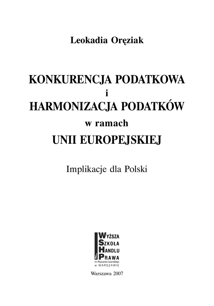 Leokadia Oręziak KONKURENCJA PODATKOWA i HARMONIZACJA PODATKÓW w ramach UNII EUROPEJSKIEJ Implikacje dla Polski Warszawa 2007 SPIS TREŚCI Wstęp . . . . . . . . . . . . . . . . . . . . . . . . . . . . . . . . . . . . . . . . . . . . . . . . . . . . . . . . . . . ROZDZIAŁ I. PODATKI JAKO CZYNNIK WPŁYWAJĄCY NA MIĘDZYNARODOWĄ POZYCJĘ GOSPODARKI 1. Podatki w gospodarce . . . . . . . . . . . . . . . . . . . . . . . . . . . . . . . . . . . . . . . . . . . 1.1. Główne dylematy związane z kształtowaniem podatków . . . . . . . . . . 1.2. Zjawisko unikania podatków oraz uchylania się od opodatkowania 1.3. Szara strefa w gospodarce jako jeden z efektów zjawiska uchylania się od podatków . . . . . . . . . . . . . . . . . . . . . . . . . . . . . . . . . . . . . . . . . . . . 1.4. Reformy podatkowe – sens i istota . . . . . . . . . . . . . . . . . . . . . . . . . . . . 1.5. Planowanie podatkowe jako metoda ograniczania obciążeń podatkowych przez przedsiębiorstwa . . . . . . . . . . . . . . . . . . . . . . . . . . . 2. Globalizacja gospodarki światowej – zjawisko kluczowe dla polityki podatkowej . . . . . . . . . . . . . . . . . . . . . . . . . . . . . . . . . . . . . . . . . . . . . . . . . . . . 3. Podatki w handlu międzynarodowym. . . . . . . . . . . . . . . . . . . . . . . . . . . . . . . 4. Podatki jako czynnik wpływający na kształtowanie się bezpośrednich inwestycji zagranicznych (BIZ) . . . . . . . . . . . . . . . . . . . . . . . . . . . . . . . . . . . 4.1. BIZ – istota i formy . . . . . . . . . . . . . . . . . . . . . . . . . . . . . . . . . . . . . . . . . 4.2. Strumienie i kierunki BIZ. . . . . . . . . . . . . . . . . . . . . . . . . . . . . . . . . . . . 4.3. Miejsce podatków wśród czynników lokalizacji BIZ . . . . . . . . . . . . . . 4.4. Ceny transferowe jako instrument ograniczania obciążeń podatkowych przez podmioty dokonujące BIZ . . . . . . . . . . . . . . . . . . 4.5. Przesuwanie zobowiązań jako sposób zmniejszania obciążeń podatkowych . . . . . . . . . . . . . . . . . . . . . . . . . . . . . . . . . . . . . . . . . . . . . . . 5. Podatki a międzynarodowa konkurencyjność gospodarki . . . . . . . . . . . . . 5.1. Pojęcie międzynarodowej konkurencyjności gospodarki . . . . . . . . . . 5.2. Pozycja konkurencyjna krajów Unii Europejskiejw świetle rankingu World Economic Forum . . . . . . . . . . . . . . . . . . . . . . . . . . . . . . . . . . . . . 6. Warunki do prowadzenia działalności gospodarczej jako czynnik wpływający na międzynarodową konkurencyjność gospodarki – ocena Banku Światowego . . . . . . . . . . . . . . . . . . . . . . . . . . . . . . . . . . . . . . . . . . . . . . 6.1. Główne obszary oceny . . . . . . . . . . . . . . . . . . . . . . . . . . . . . . . . . . . . . . . 6.2. Kraje UE w rankingu Banku Światowego według kryterium dotyczącego obciążeń podatkowych . . . . . . . . . . . . . . . . . . . . . . . . . . . . 9 13 13 19 21 28 30 34 36 38 38 42 44 51 54 56 56 58 63 63 70 6 SPIS TREŚCI 6.3. Konkurencyjność gospodarki a poziom opodatkowania . . . . . . . . . . . 7. Czynniki ogólne i podatkowe rozwoju bezpośrednich inwestycji zagranicznych w obrębie rozszerzonej UE . . . . . . . . . . . . . . . . . . . . . . . . . . 8. Konkurencja podatkowa w skali międzynarodowej . . . . . . . . . . . . . . . . . . . 8.1. Konkurencja podatkowa jako jeden z efektów procesu globalizacji . 8.2. Raje podatkowe . . . . . . . . . . . . . . . . . . . . . . . . . . . . . . . . . . . . . . . . . . . . 8.3. Działania OECD wobec tzw. szkodliwej konkurencji podatkowej . . ROZDZIAŁ II. HARMONIZACJA PODATKÓW JAKO ELEMENT PROCESU INTEGRACJI W RAMACH UNII EUROPEJSKIEJ ORAZ KONKURENCJA PODATKOWA 1. Jednolity rynek towarów, usług, kapitału i osób. . . . . . . . . . . . . . . . . . . . . . 2. Integracja walutowa i jej implikacje dla polityki budżetowej i podatkowej 2.1. Strefa euro jako efekt integracji walutowej . . . . . . . . . . . . . . . . . . . . . 2.2. Polityka budżetowa w krajach strefy euro i pozostałych krajach UE 2.2.1. Podłoże stosowania ograniczeń w odniesieniu do polityki budżetowej krajów Unii. . . . . . . . . . . . . . . . . . . . . . . . . . . . . . . . 2.2.2. Zasady dyscyplinowania polityki budżetowej krajów UE wynikające z Traktatu ustanawiającego Wspólnotę Europejską (TWE ) oraz Paktu Stabilności i Wzrostu. . . . . . . . . . . . . . . . . . 2.2.2.1. Zapobieganie nadmiernym deficytom budżetowym. . . 2.2.2.2. Ograniczanie nadmiernych deficytów budżetowych. . . 2.2.2.3. Stosowanie Paktu Stabilności i Wzrostu w praktyce . . 2.2.2.4. Krytyka Paktu i jego reforma w 2005 r. . . . . . . . . . . . . 3. Harmonizacja podatków w UE – istota i geneza zjawiska . . . . . . . . . . . . . 3.1. Ramy prawne i instytucjonalne podejmowania decyzji w sprawie podatków . . . . . . . . . . . . . . . . . . . . . . . . . . . . . . . . . . . . . . . . . . . . . . . . . . 3.2. Istota i podłoże harmonizacji podatków . . . . . . . . . . . . . . . . . . . . . . . . 4. Harmonizacja podatków pośrednich . . . . . . . . . . . . . . . . . . . . . . . . . . . . . . . 4.1. Istota harmonizacji podatków pośrednich. . . . . . . . . . . . . . . . . . . . . . . 4.2. Podatek od wartości dodanej – VAT . . . . . . . . . . . . . . . . . . . . . . . . . . . 4.2.1. Aspekty ogólne procesu harmonizacyjnego . . . . . . . . . . . . . . . . 4.2.2. Stawki podatku jako przedmiot harmonizacji i obszar konkurencji podatkowej . . . . . . . . . . . . . . . . . . . . . . . . . . . . . . . . 4.2.2.1. Ogólne zasady określania stawek VAT . . . . . . . . . . . . . 4.2.2.2. Problemy z harmonizacją stawek na przykładzie opodatkowania usług pracochłonnych . . . . . . . . . . . . . . 4.2.2.3. Opodatkowania usług pracochłonnych jako obszar konkurencji podatkowej . . . . . . . . . . . . . . . . . . . . . . . . . 4.3. VAT w transgranicznym świadczeniu usług. . . . . . . . . . . . . . . . . . . . . . 4.4. Kierunki zmian w sy