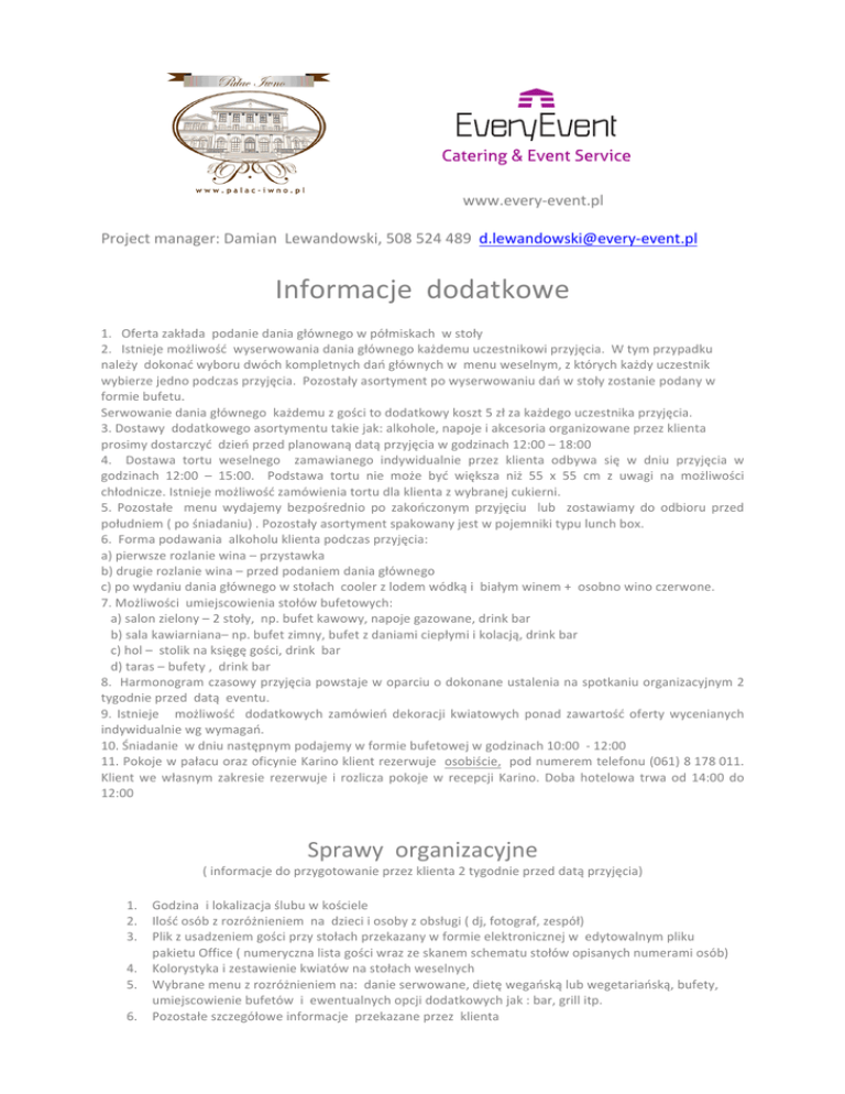 www.every-‐event.pl Project manager: Damian Lewandowski, 508 524 489 d.lewandowski@every-‐event.pl Informacje dodatkowe 1. Oferta zakłada podanie dania głównego w półmiskach w stoły 2. Istnieje możliwość wyserwowania dania głównego każdemu uczestnikowi przyjęcia. W tym przypadku należy dokonać wyboru dwóch kompletnych dań głównych w menu weselnym, z których każdy uczestnik wybierze jedno podczas przyjęcia. Pozostały asortyment po wyserwowaniu dań w stoły zostanie podany w formie bufetu. Serwowanie dania głównego każdemu z gości to dodatkowy koszt 5 zł za każdego uczestnika przyjęcia. 3. Dostawy dodatkowego asortymentu takie jak: alkohole, napoje i akcesoria organizowane przez klienta prosimy dostarczyć dzień przed planowaną datą przyjęcia w godzinach 12:00 – 18:00 4. Dostawa tortu weselnego zamawianego indywidualnie przez klienta odbywa się w dniu przyjęcia w godzinach 12:00 – 15:00. Podstawa tortu nie może być większa niż 55 x 55 cm z uwagi na możliwości chłodnicze. Istnieje możliwość zamówienia tortu dla klienta z wybranej cukierni. 5. Pozostałe menu wydajemy bezpośrednio po zakończonym przyjęciu lub zostawiamy do odbioru przed południem ( po śniadaniu) . Pozostały asortyment spakowany jest w pojemniki typu lunch box. 6. Forma podawania alkoholu klienta podczas przyjęcia: a) pierwsze rozlanie wina – przystawka b) drugie rozlanie wina – przed podaniem dania głównego c) po wydaniu dania głównego w stołach cooler z lodem wódką i białym winem + osobno wino czerwone. 7. Możliwości umiejscowienia stołów bufetowych: a) salon zielony – 2 stoły, np. bufet kawowy, napoje gazowane, drink bar b) sala kawiarniana– np. bufet zimny, bufet z daniami ciepłymi i kolacją, drink bar c) hol – stolik na księgę gości, drink bar d) taras – bufety , drink bar 8. Harmonogram czasowy przyjęcia powstaje w oparciu o dokonane ustalenia na spotkaniu organizacyjnym 2 tygodnie przed datą eventu. 9. Istnieje możliwość dodatkowych zamówień dekoracji kwiatowych ponad zawartość oferty wycenianych indywidualnie wg wymagań. 10. Śniadanie w dniu następnym podajemy w formie bufetowej w godzinach 10:00 -‐ 12:00 11. Pokoje w pałacu oraz oficynie Karino klient rezerwuje osobiście, pod numerem telefonu (061) 8 178 011. Klient we własnym zakresie rezerwuje i rozlicza pokoje w recepcji Karino. Doba hotelowa trwa od 14:00 do 12:00 Sprawy organizacyjne ( informacje do przygotowanie przez klienta 2 tygodnie przed datą przyjęcia) 1. 2. 3. 4. 5. 6. Godzina i lokalizacja ślubu w kościele Ilość osób z rozróżnieniem na dzieci i osoby z obsługi ( dj, fotograf, zespół) Plik z usadzeniem gości przy stołach przekazany w formie elektronicznej w edytowalnym pliku pakietu Office ( numeryczna lista gości wraz ze skanem schematu stołów opisanych numerami osób) Kolorystyka i zestawienie kwiatów na stołach weselnych Wybrane menu z rozróżnieniem na: danie serwowane, dietę wegańską lub wegetariańską, bufety, umiejscowienie bufetów i ewentualnych opcji dodatkowych jak : bar, grill itp. Pozostałe szczegółowe informacje przekazane przez klienta Schemat pomieszczeń 1. Wariant ze stołami okrągłymi – max. 102 osoby 2. Wariant ze stołami prostymi – max. 88 -‐ 92 osób 1 -‐ 7 możliwe ustawienie bufetów ( bufet kawowy, bufet zimny, słodki, napoje gazowane, drink bar ) Polecamy 1. 2. 3. 4. 5. 6. 7. 8. 9. 10. www.covergarden.pl – zespół muzyczny www.goscie.info -‐ zespół muzyczny www.funtasticevents.pl -‐ Dj / wodzirej Jędrzej Świerczyński – DJ / wodzirej 602 185 860 Maciej Libera – DJ/ wodzirej www.maciej-‐gierszewski.pl -‐ fotografia ślubna 504 61 36 95 www.oscar-‐studio.pl -‐ filmowy reportaż ślubny Kwartet smyczkowy -‐ www.koncertowo.poznan.pl Pianista -‐ Tadeusz Konieczny 660 552 955 Harfista – Michał Zator 609 749 939