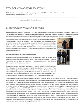 STOŁECZNY MAGAZYN POLICYJNY Źródło: http://magazyn.policja.waw.pl/mag/z-zycia-garnizonu/45805,Chronia-KSP-w-dzien-i-w-nocy.html Wygenerowano: Sobota, 4 marca 2017, 11:37 Strona znajduje się w archiwum. CHRONIĄ KSP W DZIEŃ I W NOCY Na czym polega ochrona obiektów KSP? Jaki dokument reguluje sprawy związane z funkcją ochronną? Czy zajdą jakieś poważne zmiany w dotychczasowym systemie ochrony obiektów? O tym wszystkim mówi Zastępca Naczelnika Wydziału Ochrony Placówek Dyplomatycznych, podinsp. Piotr Olek. Zgodnie z Decyzją Nr 264/2013 Komendanta Stołecznego Policji z dnia 15 maja 2013 roku zmieniającą Decyzję Nr 224/2011 z dnia 6 lipca 2011 roku w sprawie ochrony obiektów Komendy Stołecznej Policji Naczelnik Wydziału Ochrony Placówek Dyplomatycznych Komendy Stołecznej Policji przejął nadzór nad realizacją zadań w zakresie ochrony obiektów KSP. Wydział został niegdyś utworzony do ochrony przedstawicielstw innych państw, z biegiem czasu przejmował zadania ochrony niektórych obiektów KSP. DECYZJA KOMENDANTA STOŁECZNEGO POLICJI Rozkazem Organizacyjnym Nr 10/WA/13 z dnia 24 czerwca 2013 r. w sprawie zmian organizacyjnych Komendant Stołeczny Policji wyłączył szereg stanowisk z Wydziału Prewencji oraz z Wydziału Wywiadowczo – Patrolowego, tworząc w WOPD Sekcję Ochronną z ponad dwudziestoma etatami. Z wyjątkiem komend rejonowych i powiatowych, obecnie jest dziewiętnaście obiektów KSP podlegających ochronie. Każdy z nich posiada swój własny plan ochrony. - Plany ochrony poszczególnych obiektów sporządzają i na bieżąco aktualizują kierownicy jednostek/komórek organizacyjnych KSP odpowiedzialni za ich ochronę (np. plan ochrony KSP sporządza odpowiedzialny za ochronę obiektu - Naczelnik WOPD, plan z KP Metro sporządza Komendant tego komisariatu, itd.) – mówi podinsp. Piotr Olek. Obiekty Komendy Stołecznej Policji podlegają ochronie fizycznej. Biorą w niej udział policjanci i pracownicy Policji wykorzystując w tym celu techniczne środki ochrony i zastosowanego elektronicznego systemu zabezpieczeń. Celem takiej ochrony jest m.in.: zapewnienie bezpieczeństwa obiektów i osób przebywających w tych obiektach, zapewnienie ochrony przed dostępem osób nieupoważnionych, ochrona informacji niejawnych. - Zmiana komórki organizacyjnej odpowiedzialnej za ochronę obiektu KSP pociągnęła za sobą przede wszystkim zmiany personalne. Od 1 lipca 2013 r. odpowiedzialnym za ochronę KSP jest Naczelnik WOPD KSP, który wcześniej do ochrony tego obiektu całodobowo w dwunastogodzinnym systemie zmianowym kierował policjantów. Obecnie przejął również stanowiska wraz z zajmującymi je osobami, co oznacza odpowiedzialność za: plan ochrony obiektu i jego bieżącą aktualizację, prawidłowe funkcjonowanie ruchu osobowego, samochodowego i materiałowego w KSP, funkcjonowanie odpowiedzialnego za służbę ochrony obiektu, która również wydaje i przyjmuje na przechowanie klucze od wszystkich pomieszczeń w KSP, klucze i karty pracy sprzętu transportowego będącego w dyspozycji wydziałów funkcjonujących w obiekcie oraz broni policjantów tych wydziałów. Naczelnik WOPD KSP odpowiada także za właściwe funkcjonowanie punktu obsługi interesanta, jego obsadę personalną i realizację zadań na możliwie najwyższym poziomie – dodaje podinsp. Piotr Olek. Z kolei całość przedsięwzięć związanych z obiegiem dokumentacji związanej z ochroną obiektów KSP (plany ochrony), właściwym funkcjonowaniem i planowaniem służby i pracy osób chroniących KSP koordynuje Zastępca Naczelnika wraz z Kierownikiem Sekcji Ochronnej WOPD KSP. PARKOWANIE POJAZDÓW NA PARKINGU WEWNĘTRZNYM KSP Z chwilą przejęcia odpowiedzialności za ochronę obiektu KSP liczba pojazdów uprawnionych do wjazdu i parkowania zmniejszyła się do niezbędnego minimum. Redukcja ta w dużej mierze była podyktowana brakiem miejsc dla pojazdów służbowych oraz brakiem przestrzeni na manewrowanie nimi. - Z ogólnej liczby 180 zezwoleń na wjazd i parkowanie, zezwolenia mają jedynie kierownicy lub zastępcy jednostek/komórek organizacyjnych KSP, którzy pojazdami wjeżdżają tylko przy okazji odpraw służbowych - mówi podinsp. Piotr Olek. W taki oto sposób skutecznie został zlikwidowany problem braku miejsc parkingowych dla pojazdów służbowych. W sytuacjach wyjątkowych, bo i takie się zdarzają, parkować mogą goście Komendanta Stołecznego Policji i Zastępców, zewnętrzni uczestnicy spotkań, odpraw oraz uroczystości mających miejsce w KSP. PRZYGOTOWANIE DO PEŁNIENIA SŁUŻBY OCHRONY OBIEKTU Przed przystąpieniem do służby odpowiedzialny za obiekt przeprowadza odprawę służbową, informuje o ewentualnych planowanych wydarzeniach, np. uroczystym ślubowaniu policjantów, naradzie rocznej z udziałem gości zewnętrznych. Sprawdza wyposażenie do służby, ogólny wygląd zewnętrzny, stan psychofizyczny. Przydziela posterunki pełnienia służby i dba, by wypełniany był plan ochrony obiektu: patrol parkingu wewnętrznego, patrol terenu wokół obiektu KSP po zewnętrznej jego stronie, kontrola zabezpieczenia pomieszczeń służbowych po zakończonej służbie/pracy, rotacyjna wymiana na posterunkach celem umożliwienia skorzystania z przerwy. - Oczywiście, mając na uwadze niekorzystne warunki atmosferyczne, dyżurny ochrony obiektu tak dyslokuje policjantów, by mieli częstszą możliwość pełnienia służby wewnątrz obiektu. Policjant, który pełni służbę ochrony obiektu musi przede wszystkim stosować się do planu ochrony obiektu jednocześnie wykonując swoje czynności, tak jak inni policjanci, w możliwie najlepszy sposób. W przypadku zauważenia zdarzenia czy zachowania będącego w zainteresowaniu Policji, informacja jest natychmiast przekazywana do dyżurnego obiektu w celu uruchomienia dalszych procedur tj. poinformowania policjantów z KRP I, którzy następnie podejmują dalsze czynności służbowe. - W