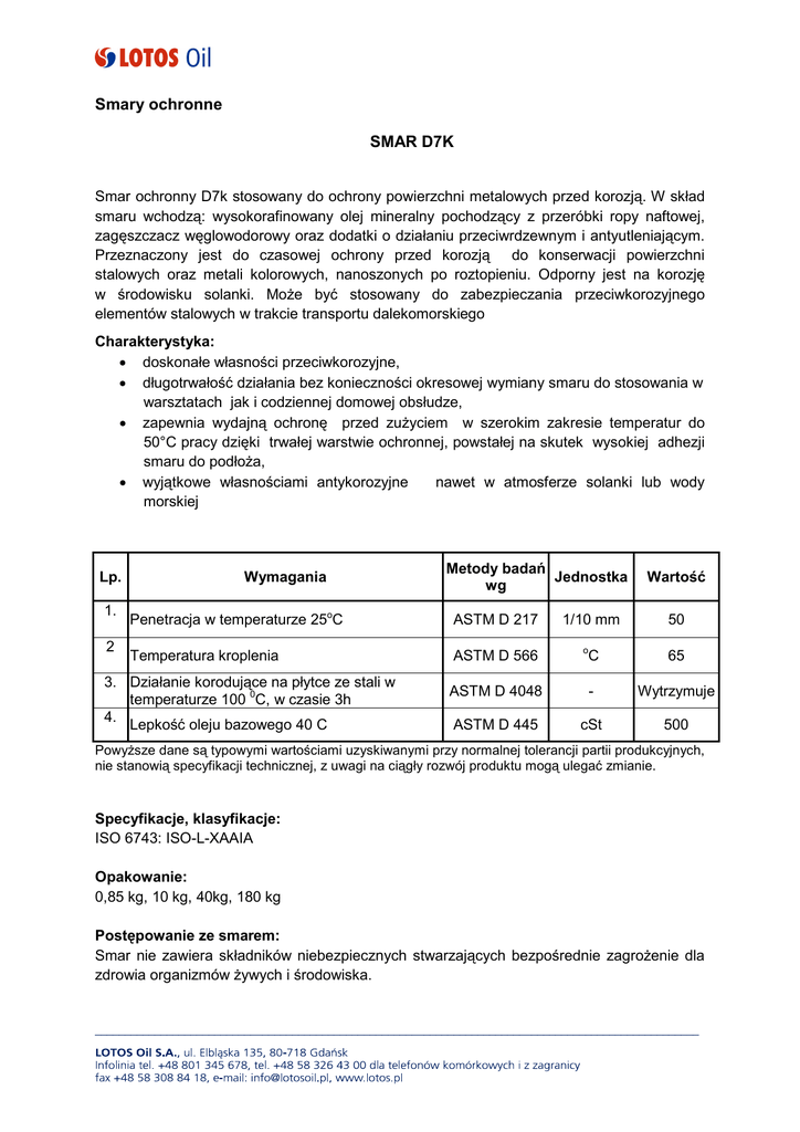 Smary ochronne SMAR D7K Smar ochronny D7k stosowany do ochrony powierzchni metalowych przed korozją. W skład smaru wchodzą: wysokorafinowany olej mineralny pochodzący z przeróbki ropy naftowej, zagęszczacz węglowodorowy oraz dodatki o działaniu przeciwrdzewnym i antyutleniającym. Przeznaczony jest do czasowej ochrony przed korozją do konserwacji powierzchni stalowych oraz metali kolorowych, nanoszonych po roztopieniu. Odporny jest na korozję w środowisku solanki. Może być stosowany do zabezpieczania przeciwkorozyjnego elementów stalowych w trakcie transportu dalekomorskiego Charakterystyka: • doskonałe własności przeciwkorozyjne, • długotrwałość działania bez konieczności okresowej wymiany smaru do stosowania w warsztatach jak i codziennej domowej obsłudze, • zapewnia wydajną ochronę przed zużyciem w szerokim zakresie temperatur do 50°C pracy dzięki trwałej warstwie ochronnej, powstałej na skutek wysokiej adhezji smaru do podłoża, • wyjątkowe własnościami antykorozyjne nawet w atmosferze solanki lub wody morskiej Lp. 1. 2 Wymagania Metody badań Jednostka wg Penetracja w temperaturze 25oC ASTM D 217 Temperatura kroplenia ASTM D 566 3. Działanie korodujące na płytce ze stali w temperaturze 100 0C, w czasie 3h 4. Lepkość oleju bazowego 40 C 1/10 mm o Wartość 50 C 65 ASTM D 4048 - Wytrzymuje ASTM D 445 cSt 500 Powyższe dane są typowymi wartościami uzyskiwanymi przy normalnej tolerancji partii produkcyjnych, nie stanowią specyfikacji technicznej, z uwagi na ciągły rozwój produktu mogą ulegać zmianie. Specyfikacje, klasyfikacje: ISO 6743: ISO-L-XAAIA Opakowanie: 0,85 kg, 10 kg, 40kg, 180 kg Postępowanie ze smarem: Smar nie zawiera składników niebezpiecznych stwarzających bezpośrednie zagrożenie dla zdrowia organizmów żywych i środowiska. _____________________________________________________________________________________________________ Składowanie: Opakowania z produktem winny być trzymane pod dachem w pomieszczeniach zamkniętych lub jeśli nie jest to możliwe przykryte. Produktu nie należy przechowywać w warunkach temperatur wyższych niż 60C, wystawionych na działanie promieni słonecznych lub na bardzo niskie temperatury. Gwarantowany okres przydatności produktu do użycia przy zachowaniu warunków magazynowania wynosi nie mniej niż 3 lata. Zdrowie, bhp, środowisko: Informacje o produkcie dotyczące zdrowia, bhp, i wpływu na środowisko są zawarte w Karcie Bezpieczeństwa. W dokumencie tym podano szczegóły dotyczące ewentualnych zagrożeń, przestrogi i środki pierwszej pomocy wraz z omówieniem wpływu na środowisko i sposobem utylizacji produktu zużytego. Lotos Oil nie ponosi żadnej odpowiedzialności za wykorzystywanie produktu niezgodne z przeznaczeniem lub z innymi niż podano środkami ostrożności Dane zawarte w niniejszej karcie nie stanowią oferty w rozumieniu przepisów ustawy z dnia 23 kwietnia 1964 roku - kodeks cywilny. LOTOS Oil S.A. nie ponosi żadnej odpowiedzialności za jakiekolwiek skutki wykorzystywania danych zawartych w karcie, w szczególności przy podejmowaniu decyzji handlowych i inwestycyjnych. Wszelkie dane zawarte w karcie są typowymi wartościami uzyskiwanymi przy normalnej tolerancji partii produkcyjnych, mogą się nieznacznie różnić z uwagi na charakterystykę procesu produkcji, a także z uwagi na ciągły rozwój produktu. Dane zawarte w karcie mogą podlegać zmianom. LOTOS Oil S.A. nie ponosi odpowiedzialności za dostępność produktu. Opracowano: 15.02.2008 Wydanie nr 2 Aktualizacja: 15.09.2010 _____________________________________________________________________________________________________