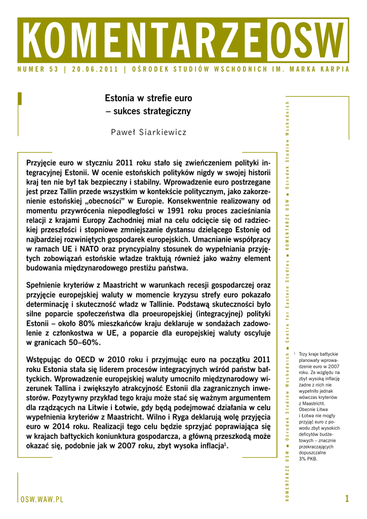 Komentarze osw O S W. W A W. P L S t u d i ó w O ś r o d e k OSW K OMENTARZE S t u d i e s E a s t e r n f o r K OMENTARZE OSW Wstępując do OECD w 2010 roku i przyjmując euro na początku 2011 roku Estonia stała się liderem procesów integracyjnych wśród państw bałtyckich. Wprowadzenie europejskiej waluty umocniło międzynarodowy wizerunek Tallina i zwiększyło atrakcyjność Estonii dla zagranicznych inwestorów. Pozytywny przykład tego kraju może stać się ważnym argumentem dla rządzących na Litwie i Łotwie, gdy będą podejmować działania w celu wypełnienia kryteriów z Maastricht. Wilno i Ryga deklarują wolę przyjęcia euro w 2014 roku. Realizacji tego celu będzie sprzyjać poprawiająca się w krajach bałtyckich koniunktura gospodarcza, a główną przeszkodą może okazać się, podobnie jak w 2007 roku, zbyt wysoka inflacja1. C e n t r e Spełnienie kryteriów z Maastricht w warunkach recesji gospodarczej oraz przyjęcie europejskiej waluty w momencie kryzysu strefy euro pokazało determinację i skuteczność władz w Tallinie. Podstawą skuteczności było silne poparcie społeczeństwa dla proeuropejskiej (integracyjnej) polityki Estonii – około 80% mieszkańców kraju deklaruje w sondażach zadowolenie z członkostwa w UE, a poparcie dla europejskiej waluty oscyluje w granicach 50–60%. Ws c h o d n i c h Przyjęcie euro w styczniu 2011 roku stało się zwieńczeniem polityki integracyjnej Estonii. W ocenie estońskich polityków nigdy w swojej historii kraj ten nie był tak bezpieczny i stabilny. Wprowadzenie euro postrzegane jest przez Tallin przede wszystkim w kontekście politycznym, jako zakorzenienie estońskiej „obecności” w Europie. Konsekwentnie realizowany od momentu przywrócenia niepodległości w 1991 roku proces zacieśniania relacji z krajami Europy Zachodniej miał na celu odcięcie się od radzieckiej przeszłości i stopniowe zmniejszanie dystansu dzielącego Estonię od najbardziej rozwiniętych gospodarek europejskich. Umacnianie współpracy w ramach UE i NATO oraz pryncypialny stosunek do wypełniania przyjętych zobowiązań estońskie władze traktują również jako ważny element budowania międzynarodowego prestiżu państwa. S t u d i ó w Paweł Siarkiewicz O ś r o d e k Estonia w strefie euro – sukces strategiczny Ws c h o d n i c h numer 53 | 20.06.2011 | ośrodek studiów wschodnich im. marka karpia 1 Trzy kraje bałtyckie planowały wprowadzenie euro w 2007 roku. Ze względu na zbyt wysoką inflację żadne z nich nie wypełniło jednak wówczas kryteriów z Maastricht. Obecnie Litwa i Łotwa nie mogły przyjąć euro z powodu zbyt wysokich deficytów budżetowych – znacznie przekraczających dopuszczalne 3% PKB. 1 Komentarze osw n u m e r 5 3 | 2 0 . 0 6 . 2 0 1 1 | o ś r o d e k s t u d i ó w w s c h o d n i c h i m . m a r ka ka r p i a Przyjęcie euro jako realizacja strategicznego wyboru Estonia została 17. członkiem strefy euro, jako trzecia spośród nowych państw członkowskich, po Słowenii i Słowacji, i pierwsza z obszaru b. ZSRR. Od stycznia 2011 roku jako jedyne państwo w regionie nordycko-bałtyckim jest członkiem UE, ma europejską walutę oraz należy do NATO. Tallin konsekwentnie dążył do członkostwa w strukturach zachodnich, uznając, że dla małego kraju o otwartej, uzależnionej od eksportu gospodarce (udział eksportu w PKB wynosi ok. 70%) i niewielkim potencjale militarnym (4 tys. żołnierzy, z czego blisko połowa z poboru) jest to najbardziej efektywny sposób zabezpieczenia interesów. Wiązał się z tym jednoznaczny wybór geopolityczny. Estonia najsilniej spośród krajów bałtyckich akcentowała swoją kulturową, ekonomiczną i polityczną przynależność do Europy Zachodniej i najskuteczniej integrowała się z jej strukturami. Jako pierwsza rozpoczęła negocjacje akcesyjne z UE i jako pierwsza zastąpiła walutę naTallin konsekwentnie dążył do członrodową wspólną walutą europejską. Integracyjne aspiracje Estonii determinokostwa w zachodnich strukturach, wały jej politykę gospodarczą. Od momenuznając, że dla małego kraju o otwartu przywrócenia niepodległości i rozpotej, uzależnionej od eksportu gospoczęcia reform ustrojowych w dużej mierze darce i niewielkim potencjale milipolityka ta była odzwierciedleniem zaleceń tarnym jest to najbardziej efektywny i oczekiwań międzynarodowych instytucji sposób zabezpieczenia interesów. finansowych i zagranicznych inwestorów. Miało to z jednej strony budować zaufanie do estońskiej gospodarki i przyciągać inwestycje, z drugiej wiązało się z koniecznością wypełnienia określonych standardów i wymagań. Kierując się opiniami m.in. Międzynarodowego Funduszu Walutowego i Banku Światowego, kolejne estońskie rządy kładły szczególny nacisk na zachowanie stabilności finansów publicznych2. Dbałość o finanse państwa umożliwiła Tallinowi wypełnienie kryteriów z Maastricht i przyjęcie euro w styczniu 2011 roku. 2 Według danych Eurostatu, w 2010 roku Estonia jako jedyna w UE miała nadwyżkę budżetową (0,1% PKB), a jej dług publiczny wynosił niespełna 7% PKB. 3 Od 6 lat pełniący funkcję premiera Andrus Ansip cieszył się największym poparciem społecznym po zrealizowaniu w 2007 roku obietnicy wyborczej o przeniesieniu z centrum Tallina na cmentarz pomnika upamiętniającego żołnierzy radzieckich. Ostro sprzeciwiała się temu Moskwa i estońscy Rosjanie. Decyzja, która skonsolidowała wokół centroprawicowego rządu Ansipa etnicznych Estończyków, wyraźnie pogłębiła podział etniczny w Estonii i umocniła niechęć miejscowych Rosjan do instytucji państwa. Mieszkańcy Estonii wobec wprowadzenia euro Estończycy w większości poparli wprowadzenie euro, pomimo przywiązania do estońskiej korony, która w świadomości społecznej funkcjonowała jako wyrazisty atrybut odbudowanej niepodległości. Poparcie dla przyjęcia wspólnej waluty w pierwszych tygo