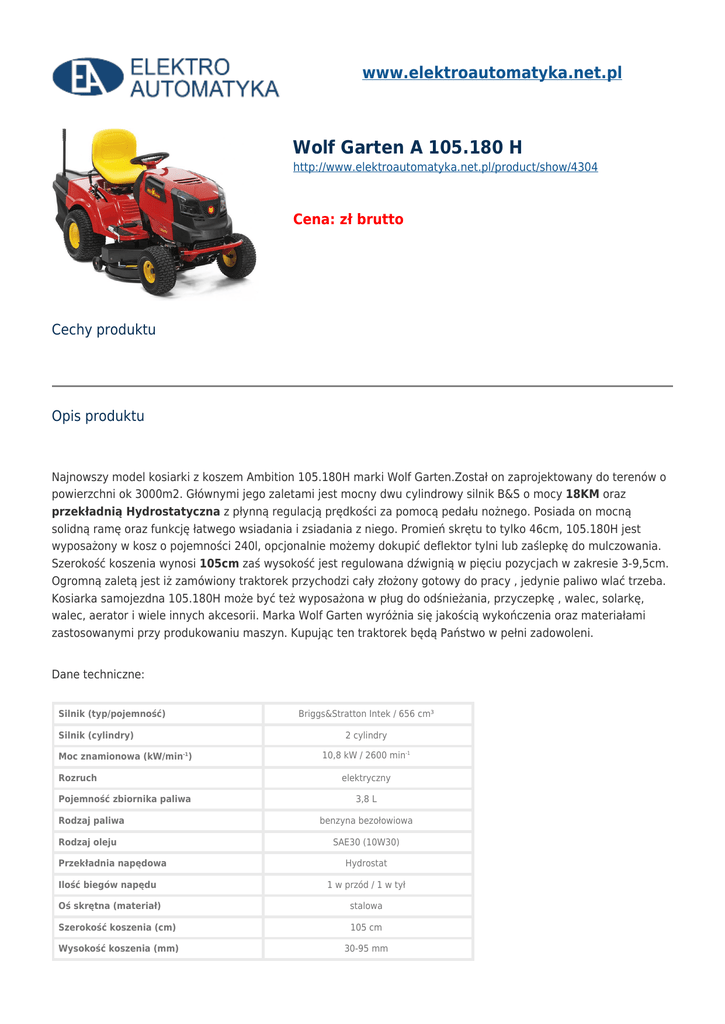 www.elektroautomatyka.net.pl Wolf Garten A 105.180 H http://www.elektroautomatyka.net.pl/product/show/4304 Cena: zł brutto Cechy produktu Opis produktu Najnowszy model kosiarki z koszem Ambition 105.180H marki Wolf Garten.Został on zaprojektowany do terenów o powierzchni ok 3000m2. Głównymi jego zaletami jest mocny dwu cylindrowy silnik B&S o mocy 18KM oraz przekładnią Hydrostatyczna z płynną regulacją prędkości za pomocą pedału nożnego. Posiada on mocną solidną ramę oraz funkcję łatwego wsiadania i zsiadania z niego. Promień skrętu to tylko 46cm, 105.180H jest wyposażony w kosz o pojemności 240l, opcjonalnie możemy dokupić deflektor tylni lub zaślepkę do mulczowania. Szerokość koszenia wynosi 105cm zaś wysokość jest regulowana dźwignią w pięciu pozycjach w zakresie 3-9,5cm. Ogromną zaletą jest iż zamówiony traktorek przychodzi cały złożony gotowy do pracy , jedynie paliwo wlać trzeba. Kosiarka samojezdna 105.180H może być też wyposażona w pług do odśnieżania, przyczepkę , walec, solarkę, walec, aerator i wiele innych akcesorii. Marka Wolf Garten wyróżnia się jakością wykończenia oraz materiałami zastosowanymi przy produkowaniu maszyn. Kupując ten traktorek będą Państwo w pełni zadowoleni. Dane techniczne: Silnik (typ/pojemność) Silnik (cylindry) Moc znamionowa (kW/min-1) Rozruch Pojemność zbiornika paliwa Rodzaj paliwa Rodzaj oleju Przekładnia napędowa Briggs&Stratton Intek / 656 cm³ 2 cylindry 10,8 kW / 2600 min-1 elektryczny 3,8 L benzyna bezołowiowa SAE30 (10W30) Hydrostat Ilość biegów napędu 1 w przód / 1 w tył Oś skrętna (materiał) stalowa Szerokość koszenia (cm) 105 cm Wysokość koszenia (mm) 30-95 mm Regulacja wysokości cięcia 5 pozycji, manualna Dysza do mycia agregatu Tak Cięcie na wstecznym biegu Nie Deflektor opcja (196-750A678) Kosz / pojemność kosza standard / 240 litrów Zaślepka mieląca opcja (196-749A678) Koła (przód/tył) 15" x 6" / 18" x 9,5" Łożyskowanie kół Promień skrętu Reflektory przednie 46 cm standardowe Zaczep tylny Tak Waga (około) 198 kg Dodatkowe informacje - ELEKTRO-AUTOMATYKA Sprzedaż elektronarzędzi, urządzeń spawalniczych, maszyn budowlanych, pneumatyki, narzędzi warsztatowych, firmowych ubrań roboczych oraz maszyn ogrodowo leśnych. Sklep Bochnia ul. Brzeska 50 32-700 Bochnia Sklep Brzesko ul. Szarych Szeregów 23 32-800 Brzesko Serwis, Magazyn ul. Św. Brata Alberta 4 32-800 Brzesko tel. 691 572 333 e-mail: [email protected] tel. 609 523 230 e-mail: [email protected] tel. 609 523 645 e-mail: [email protected]