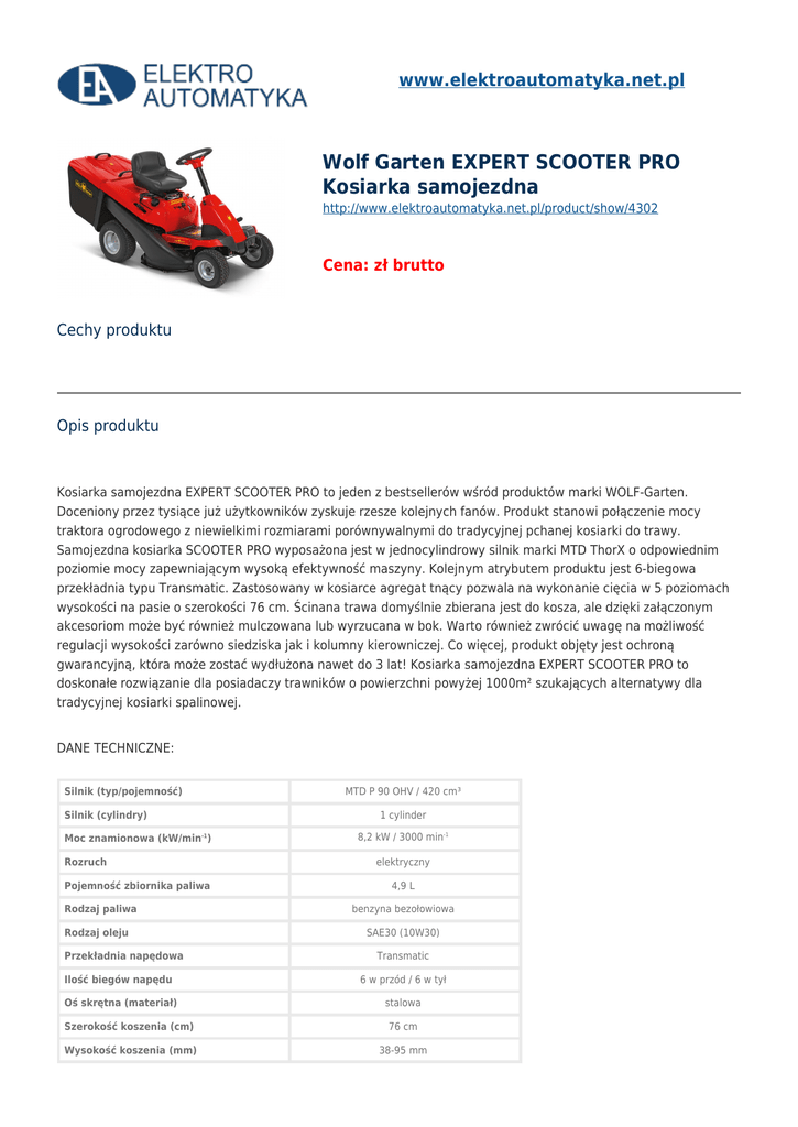 www.elektroautomatyka.net.pl Wolf Garten EXPERT SCOOTER PRO Kosiarka samojezdna http://www.elektroautomatyka.net.pl/product/show/4302 Cena: zł brutto Cechy produktu Opis produktu Kosiarka samojezdna EXPERT SCOOTER PRO to jeden z bestsellerów wśród produktów marki WOLF-Garten. Doceniony przez tysiące już użytkowników zyskuje rzesze kolejnych fanów. Produkt stanowi połączenie mocy traktora ogrodowego z niewielkimi rozmiarami porównywalnymi do tradycyjnej pchanej kosiarki do trawy. Samojezdna kosiarka SCOOTER PRO wyposażona jest w jednocylindrowy silnik marki MTD ThorX o odpowiednim poziomie mocy zapewniającym wysoką efektywność maszyny. Kolejnym atrybutem produktu jest 6-biegowa przekładnia typu Transmatic. Zastosowany w kosiarce agregat tnący pozwala na wykonanie cięcia w 5 poziomach wysokości na pasie o szerokości 76 cm. Ścinana trawa domyślnie zbierana jest do kosza, ale dzięki załączonym akcesoriom może być również mulczowana lub wyrzucana w bok. Warto również zwrócić uwagę na możliwość regulacji wysokości zarówno siedziska jak i kolumny kierowniczej. Co więcej, produkt objęty jest ochroną gwarancyjną, która może zostać wydłużona nawet do 3 lat! Kosiarka samojezdna EXPERT SCOOTER PRO to doskonałe rozwiązanie dla posiadaczy trawników o powierzchni powyżej 1000m² szukających alternatywy dla tradycyjnej kosiarki spalinowej. DANE TECHNICZNE: Silnik (typ/pojemność) Silnik (cylindry) Moc znamionowa (kW/min-1) Rozruch Pojemność zbiornika paliwa Rodzaj paliwa Rodzaj oleju Przekładnia napędowa MTD P 90 OHV / 420 cm³ 1 cylinder 8,2 kW / 3000 min-1 elektryczny 4,9 L benzyna bezołowiowa SAE30 (10W30) Transmatic Ilość biegów napędu 6 w przód / 6 w tył Oś skrętna (materiał) stalowa Szerokość koszenia (cm) 76 cm Wysokość koszenia (mm) 38-95 mm Regulacja wysokości cięcia 5 pozycji, manualna Dysza do mycia agregatu Tak Cięcie na wstecznym biegu Nie Deflektor Kosz / pojemność kosza Zaślepka mieląca Koła (przód/tył) Łożyskowanie kół Promień skrętu Reflektory przednie standard Tak / 200 L standard 13" x 5" / 16" x 6,5" 46 cm Nie Zaczep tylny Tak, stały Waga (około) 145 kg Dodatkowe informacje - ELEKTRO-AUTOMATYKA Sprzedaż elektronarzędzi, urządzeń spawalniczych, maszyn budowlanych, pneumatyki, narzędzi warsztatowych, firmowych ubrań roboczych oraz maszyn ogrodowo leśnych. Sklep Bochnia ul. Brzeska 50 32-700 Bochnia Sklep Brzesko ul. Szarych Szeregów 23 32-800 Brzesko Serwis, Magazyn ul. Św. Brata Alberta 4 32-800 Brzesko tel. 691 572 333 e-mail: [email protected] tel. 609 523 230 e-mail: [email protected] tel. 609 523 645 e-mail: [email protected]