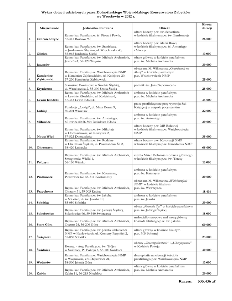 Wykaz dotacji udzielonych przez Dolnośląskiego Wojewódzkiego Konserwatora Zabytków we Wrocławiu w 2012 r. Miejscowość 1. 2. 3. Czerwieńczyce Glinica 4. 5. Kryniczno 7. 8. 9. 10. 11. 12. 13. 14. 15. 16. 17. 18. 19. 20. Rzym.-kat. Parafia p.w. śś. Piotra i Pawła, 57-441 Bożków 92 Rzym.-kat. Parafia p.w. św. Stanisława w Jordanowie Śląskim, ul. Wrocławska 45, 55-065 Jordanów Śląski Rzym.-kat. Parafia p.w. św. Michała Archanioła, Jaworów1, 57-120 Wiązów Obiekt ołtarz boczny p.w. św. Sebastiana w kościele filialnym p.w. św. Bartłomieja Lewin Kłodzki Lubiąż Miłowice 26.000 10.000 ołtarz główny w kościele parafialnym p.w. św. Michała Archanioła 30.000 Rzym.-kat. Parafia p.w. Wniebowzięcia NMP w Kamieńcu Ząbkowickim, ul. Kolejowa 20, 57-230 Kamieniec Ząbkowicki Starostwo Powiatowe w Środzie Śląskiej, ul. Wrocławska 2, 55-300 Środa Śląska Rzym.-kat. Parafia p.w. św. Michała Archanioła w Lewinie Kłodzkim, ul. Kościelna 6, 57-343 Lewin Kłodzki Fundacja „Lubiąż”, pl. Maxa Borna 9, 50-204 Wrocław Rzym.-kat. Parafia p.w. św. Antoniego, Miłowice 80,56-504 Dziadowa Kłoda Okrzeszyn Rzym.-kat. Parafia p.w. św. Mikołaja w Domaszkowie, ul. Kolejowa 2, 57-522 Domaszków Rzym.-kat. Parafia p.w. św. Rodziny w Chełmsku Śląskim, ul. Powstańców Śl. 2, 58-420 Lubawka Pełczyn Rzym.-kat. Parafia p.w. św. Michała Archanioła, Smogorzów Wielki 1, 56-160 Wińsko Piotrowice Rzym.-kat. Parafia p.w. św. Katarzyny, Piotrowice 62, 55-311 Kostomłoty Nowa Wieś Przychowa Sobótka Sokołowiec Rzym.-kat. Parafia p.w. św. Michała Archanioła, Olszany 31, 59-305 Rudna Rzym.-kat. Parafia p.w. św. Jakuba w Sobótce, ul. św. Jakuba 10, 55-050 Sobótka Rzym.-kat. Parafia p.w. św. Jadwigi Śląskiej, Sokołowiec 96, 59-540 Świerzawa Stara Góra Rzym.-kat. Parafia p.w. św. Michała Archanioła, Osetno 24, 56-200 Góra Świątniki Rzym.-kat. Parafia p.w. św. Józefa Oblubieńca NMP w Nasławicach, ul. Komuny Paryskiej 2, 55-050 Sobótka Świdnica Ewang. - Aug. Parafia p.w. św. Trójcy w Świdnicy, Pl. Pokoju 6, 58-100 Świdnica Wojanów Rzym.-kat. Parafia p.w. Wniebowzięcia NMP w Wojanowie, z/s Dąbrowica 21, 58-500 Jelenia Góra Żabin Kwota dotacji ołtarz boczny p.w. Matki Bożej w kościele filialnym p.w. śś. Antoniego i Macieja Jaworów Kamieniec Ząbkowcki 6. Jednostka dotowana Rzym.-kat. Parafia p.w. św. Michała Archanioła, Żabin 11, 56-215 Niechlów obraz aut. M. Willmanna „Oczekiwanie na Marię” w kościele parafialnym p.w. Wniebowzięcia NMP 25.000 pomnik św. Jana Nepomucena 28.000 ambona w kościele parafialnym p.w. św. Michała Archanioła 35.000 prace profilaktyczne przy wystroju Sali Książęcej w zespole pocysterskim 22.000 ambona w kościele parafialnym p.w. św. Antoniego 20.000 ołtarz boczny p.w. MB Bolesnej w kościele filialnym p.w. Wniebowzięcia NMP 35.000 ołtarz boczny p.w. Koronacji NMP w kościele filialnym p.w. Narodzenia NMP 68.000 rzeźba Mater Dolorosa z ołtarza głównego w kościele filialnym p.w. św. Teresy 10.000 ambona w kościele parafialnym p.w. św. Katarzyny 20.000 obraz aut. M. Willmanna „Wniebowzięcie NMP” w kościele filialnym p.w. św. Wawrzyńca 15.436 ambona w kościele parafialnym p.w. św. Jakuba 30.000 obraz „Komunia Św.” w kościele parafialnym p.w. św. Jadwigi Śląskiej 18.000 malowidło stropowe nad nawą główną kościoła filialnego p.w. św. Jakuba 60.000 ołtarz główny w kościele filialnym p.w. MB Bolesnej 23.000 obrazy „Zmartwychwstanie” i „Ukrzyżowanie” w Kościele Pokoju 30.000 dwa epitafia na elewacji kościoła parafialnego p.w. Wniebowzięcia NMP 10.000 ołtarz główny w kościele parafialnym p.w. św. Michała Archanioła 20.000 Razem: 535.436 zł.