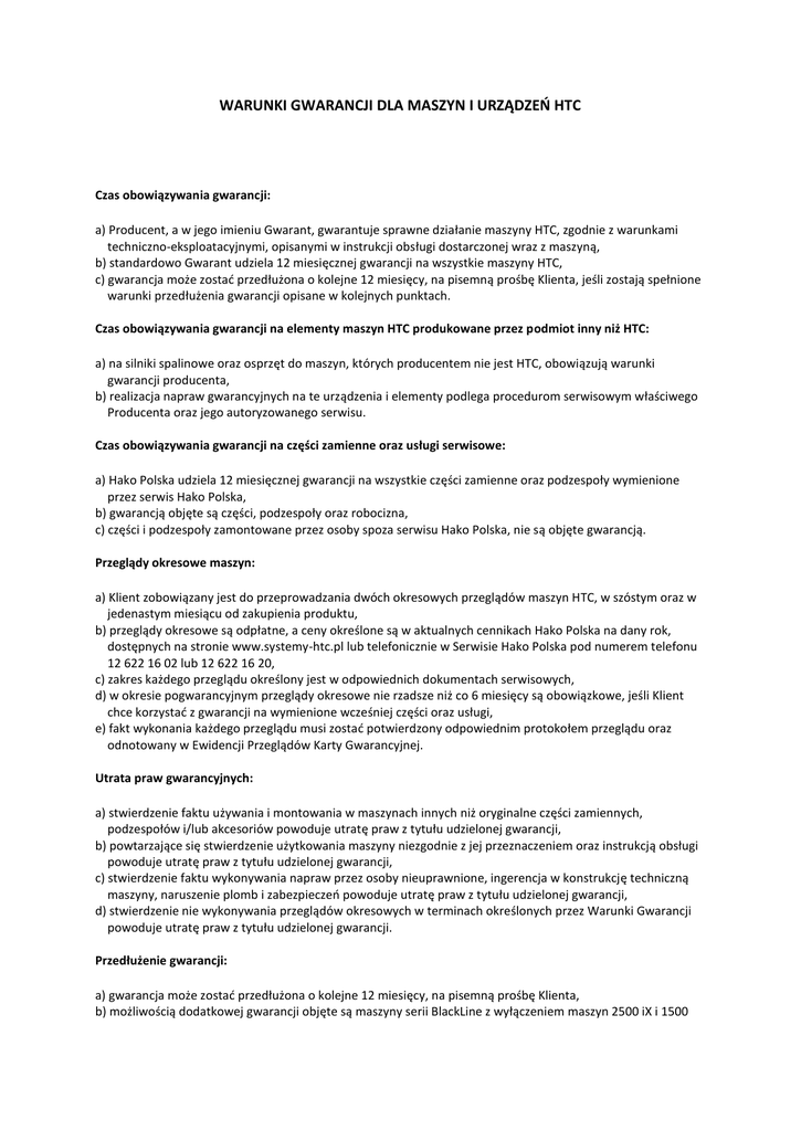 WARUNKI GWARANCJI DLA MASZYN I URZĄDZEŃ HTC Czas obowiązywania gwarancji: a) Producent, a w jego imieniu Gwarant, gwarantuje sprawne działanie maszyny HTC, zgodnie z warunkami techniczno-eksploatacyjnymi, opisanymi w instrukcji obsługi dostarczonej wraz z maszyną, b) standardowo Gwarant udziela 12 miesięcznej gwarancji na wszystkie maszyny HTC, c) gwarancja może zostać przedłużona o kolejne 12 miesięcy, na pisemną prośbę Klienta, jeśli zostają spełnione warunki przedłużenia gwarancji opisane w kolejnych punktach. Czas obowiązywania gwarancji na elementy maszyn HTC produkowane przez podmiot inny niż HTC: a) na silniki spalinowe oraz osprzęt do maszyn, których producentem nie jest HTC, obowiązują warunki gwarancji producenta, b) realizacja napraw gwarancyjnych na te urządzenia i elementy podlega procedurom serwisowym właściwego Producenta oraz jego autoryzowanego serwisu. Czas obowiązywania gwarancji na części zamienne oraz usługi serwisowe: a) Hako Polska udziela 12 miesięcznej gwarancji na wszystkie części zamienne oraz podzespoły wymienione przez serwis Hako Polska, b) gwarancją objęte są części, podzespoły oraz robocizna, c) części i podzespoły zamontowane przez osoby spoza serwisu Hako Polska, nie są objęte gwarancją. Przeglądy okresowe maszyn: a) Klient zobowiązany jest do przeprowadzania dwóch okresowych przeglądów maszyn HTC, w szóstym oraz w jedenastym miesiącu od zakupienia produktu, b) przeglądy okresowe są odpłatne, a ceny określone są w aktualnych cennikach Hako Polska na dany rok, dostępnych na stronie www.systemy-htc.pl lub telefonicznie w Serwisie Hako Polska pod numerem telefonu 12 622 16 02 lub 12 622 16 20, c) zakres każdego przeglądu określony jest w odpowiednich dokumentach serwisowych, d) w okresie pogwarancyjnym przeglądy okresowe nie rzadsze niż co 6 miesięcy są obowiązkowe, jeśli Klient chce korzystać z gwarancji na wymienione wcześniej części oraz usługi, e) fakt wykonania każdego przeglądu musi zostać potwierdzony odpowiednim protokołem przeglądu oraz odnotowany w Ewidencji Przeglądów Karty Gwarancyjnej. Utrata praw gwarancyjnych: a) stwierdzenie faktu używania i montowania w maszynach innych niż oryginalne części zamiennych, podzespołów i/lub akcesoriów powoduje utratę praw z tytułu udzielonej gwarancji, b) powtarzające się stwierdzenie użytkowania maszyny niezgodnie z jej przeznaczeniem oraz instrukcją obsługi powoduje utratę praw z tytułu udzielonej gwarancji, c) stwierdzenie faktu wykonywania napraw przez osoby nieuprawnione, ingerencja w konstrukcję techniczną maszyny, naruszenie plomb i zabezpieczeń powoduje utratę praw z tytułu udzielonej gwarancji, d) stwierdzenie nie wykonywania przeglądów okresowych w terminach określonych przez Warunki Gwarancji powoduje utratę praw z tytułu udzielonej gwarancji. Przedłużenie gwarancji: a) gwarancja może zostać przedłużona o kolejne 12 miesięcy, na pisemną prośbę Klienta, b) możliwością dodatkowej gwarancji objęte są maszyny serii BlackLine z wyłączeniem maszyn 2500 iX i 1500 iXT oraz z wyłączeniem całej serii GreyLine, c) warunkiem wyrażenia zgody przez Gwaranta na przedłużenie gwarancji jest dokonanie dwóch okresowych przeglądów, w 6 i 11 miesiącu od zakupu maszyny HTC, d) warunkiem utrzymania dodatkowej 12 miesięcznej gwarancji jest dokonywanie kolejnych regularnych okresowych przeglądów, nie rzadziej, niż co pół roku. Nie dokonanie kolejnego przeglądu powoduje natychmiastową utratę praw z tytułu dodatkowej gwarancji. Gwarancją nie są objęte: a) wadliwe działanie lub uszkodzenia spowodowane użytkowaniem niezgodnym z przeznaczeniem albo przepisami bezpieczeństwa, b) wadliwe działanie lub uszkodzenia wynikłe z powodu niewłaściwego przechowywania lub transportowania, c) awarie i uszkodzenia spowodowane mechanicznymi uszkodzeniami maszyny, wywołane nimi wady i/lub jej dewastacja*, d) awarie i uszkodzenia spowodowane przez pożar, powódź, uderzenia pioruna i inne klęski żywiołowe, jak i wojny i niepokoje społeczne oraz przepięcia w sieci elektrycznej, podłączenie do nieuziemionego gniazda sieciowego lub innych nieprzewidzianych wypadków niezależnych od producenta, e) awarie i uszkodzenia maszyn, których numery fabryczne, seryjne, tabliczki znamionowe uległy uszkodzeniu, zagubieniu lub dla których zagubiona została Karta Gwarancyjna, f) awarie i uszkodzenia maszyn spowodowane ingerencją osób trzecich, nieuprawnionych do napraw i przeróbek maszyn, g) części i materiały zużywające się, takie jak materiały eksploatacyjne: narzędzia ścierne, uchwyty narzędziowe, pasy silnika, uszczelki, płyny eksploatacyjne, osłony gumowe, węże itp. (*) za dewastację uznaje się wszystkie uszkodzenia powstałe w wyniku umyślnego lub nieumyślnego działania, wynikające z użytkowania maszyny niezgodnie z instrukcją obsługi. Decyzja co do zasadności napraw gwarancyjnych lub ich odrzucenia: a) decyzja Gwaranta, czyli Hako Polska Sp. z o.o., odnośnie odrzucenia roszczenia, jako gwarancyjnego, jest ostateczna, b) decyzję ostateczną podejmuje kierownik serwisu Hako Polska Sp. z o.o., c) w sprawach spornych decyzja zostanie podjęta przez Producenta, po przesłaniu mu wymienionych części i ich ekspertyzie. Zgłaszanie awarii: a) wszystkie awarie zgłaszane muszą być pisemnie (fax: 12 622 16 19, e-mail: [email protected] ) do centralnego serwisu Hako Polska, b) lub za pomocą dedykowanej Platformy Serwisowej, c) dopuszcza sie zgłaszanie awarii telefonicznie. Zgłoszenie takie traktowane jest jako awizacja zgłoszenia i wymaga pisemnego potwierdzenia. Zgłoszenia telefoniczne powinny być kierowane na nr tel.: 12 622 16 02 lub 12 622 16 20, d) awarie zgłaszane powinny być na formularzach zgłoszenia awarii, dostępnych na www.systemy-htc.pl. Realizacja napraw gwarancyjnych: a) czas reakcji serwisu w przypadku naprawy gwarancyjnej jest nie dłuższy 