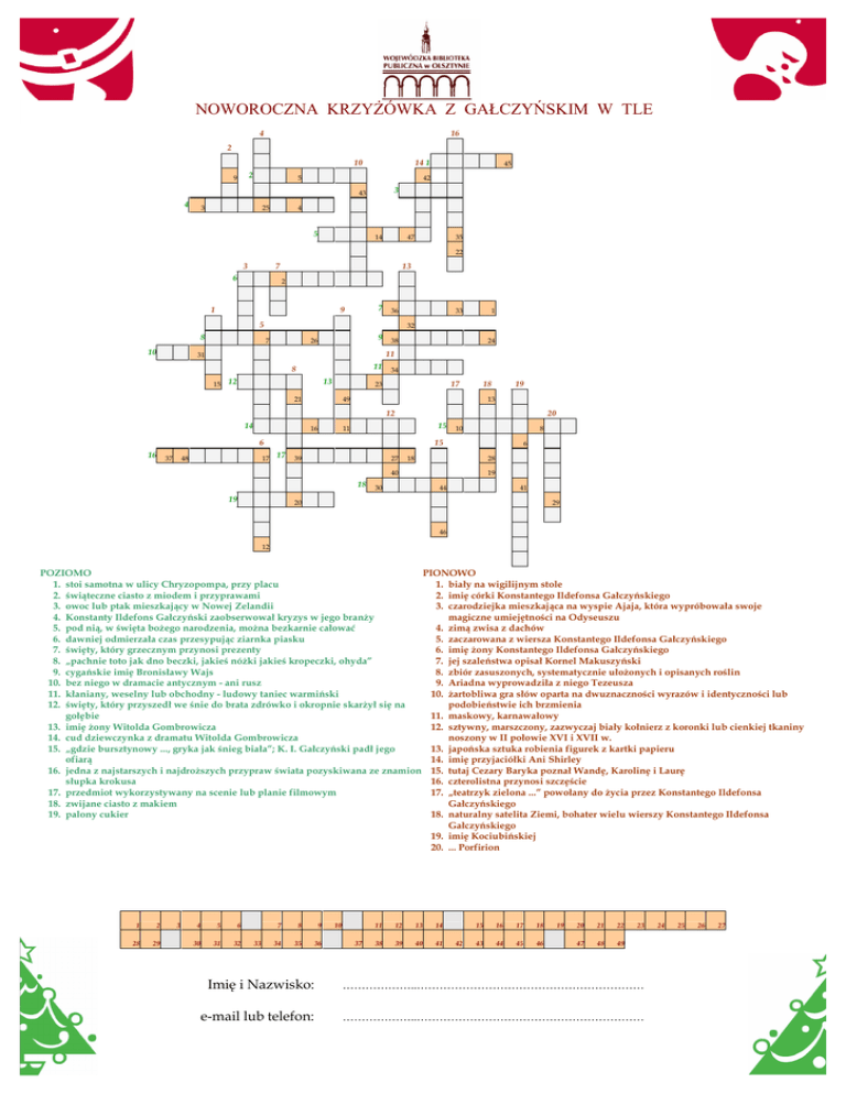 NOWOROCZNA KRZYśÓWKA Z GAŁCZYŃSKIM W TLE 4 16 2 10 2 9 14 1 5 3 43 4 3 25 45 42 4 5 14 47 35 22 3 7 6 13 2 1 7 9 36 5 8 10 33 1 32 7 9 26 38 24 11 31 11 8 15 12 13 34 17 23 21 18 49 19 13 12 14 16 20 15 11 6 16 37 48 17 10 8 15 17 39 27 6 18 28 40 18 19 19 30 44 41 20 29 46 12 POZIOMO PIONOWO 1. stoi samotna w ulicy Chryzopompa, przy placu 1. biały na wigilijnym stole 2. świąteczne ciasto z miodem i przyprawami 2. imię córki Konstantego Ildefonsa Gałczyńskiego 3. owoc lub ptak mieszkający w Nowej Zelandii 3. czarodziejka mieszkająca na wyspie Ajaja, która wypróbowała swoje 4. Konstanty Ildefons Gałczyński zaobserwował kryzys w jego branŜy magiczne umiejętności na Odyseuszu 5. pod nią, w święta boŜego narodzenia, moŜna bezkarnie całować 4. zimą zwisa z dachów 6. dawniej odmierzała czas przesypując ziarnka piasku 5. zaczarowana z wiersza Konstantego Ildefonsa Gałczyńskiego 7. święty, który grzecznym przynosi prezenty 6. imię Ŝony Konstantego Ildefonsa Gałczyńskiego 8. „pachnie toto jak dno beczki, jakieś nóŜki jakieś kropeczki, ohyda” 7. jej szaleństwa opisał Kornel Makuszyński 9. cygańskie imię Bronisławy Wajs 8. zbiór zasuszonych, systematycznie ułoŜonych i opisanych roślin 10. bez niego w dramacie antycznym - ani rusz 9. Ariadna wyprowadziła z niego Tezeusza 11. kłaniany, weselny lub obchodny - ludowy taniec warmiński 10. Ŝartobliwa gra słów oparta na dwuznaczności wyrazów i identyczności lub 12. święty, który przyszedł we śnie do brata zdrówko i okropnie skarŜył się na podobieństwie ich brzmienia gołębie 11. maskowy, karnawałowy 13. imię Ŝony Witolda Gombrowicza 12. sztywny, marszczony, zazwyczaj biały kołnierz z koronki lub cienkiej tkaniny noszony w II połowie XVI i XVII w. 14. cud dziewczynka z dramatu Witolda Gombrowicza 13. japońska sztuka robienia figurek z kartki papieru 15. „gdzie bursztynowy ..., gryka jak śnieg biała”; K. I. Gałczyński padł jego 14. imię przyjaciółki Ani Shirley ofiarą 16. jedna z najstarszych i najdroŜszych przypraw świata pozyskiwana ze znamion 15. tutaj Cezary Baryka poznał Wandę, Karolinę i Laurę słupka krokusa 16. czterolistna przynosi szczęście 17. przedmiot wykorzystywany na scenie lub planie filmowym 17. „teatrzyk zielona ...” powołany do Ŝycia przez Konstantego Ildefonsa 18. zwijane ciasto z makiem Gałczyńskiego 19. palony cukier 18. naturalny satelita Ziemi, bohater wielu wierszy Konstantego Ildefonsa Gałczyńskiego 19. imię Kociubińskiej 20. ... Porfirion 1 2 28 29 3 4 5 6 30 31 32 33 7 8 9 34 35 36 10 37 11 12 13 14 38 39 40 41 42 15 16 17 18 43 44 45 46 19 20 21 22 47 48 49 23 Imię i Nazwisko: ………………..…………………………………………………… e-mail lub telefon: ………………..…………………………………………………… 24 25 26 27 KrzyŜówka dostępna jest w dwóch formach: - elektronicznej na stronie internetowej www.wbp.olsztyn.pl, - papierowej dostępnej w Wojewódzkiej Bibliotece Publicznej w Olsztynie (ul. Stare Miasto 33) Litery z pól od 1 do 49 oznaczonych kolorem utworzą hasło, które naleŜy wpisać w formularzu umieszczonym pod krzyŜówką, która jest dostępna na stronie www.wbp.olsztyn lub wrzucić wypełniony kupon z rozwiązaniem do „krzyŜówkowych” pudełek w Czytelni KsiąŜek, Czasopism oraz WypoŜyczalni. Konkurs „Świąteczna KrzyŜówka z Gałczyńskim w tle” trwa od 6 grudnia 2013 do 15 stycznia 2014 r. Wśród Czytelników, którzy prawidłowo rozwiąŜą krzyŜówkę zostaną wyłonieni zwycięzcy. Dnia 20 stycznia 2014 r. wylosujemy trzy szczęśliwe kupony. O wygranej poinformujemy mailem lub telefonicznie. Nagrody wręczone zostaną 28 stycznia 2014 o godz. 17:00 w Pokoju z widokiem” (II piętro sala nr 211) Starego Ratusza w trakcie trwania spotkania z Rafałem Tomańskim – autorem ksiąŜki pt. „Made In Japan”. Serdecznie zapraszamy i Ŝyczymy powodzenia!