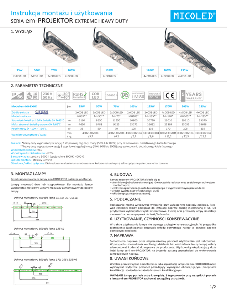 Instrukcja montażu i użytkowania SERIA em-PROJEKTOR EXTREME HEAVY DUTY 1. WYGLĄD 35W 50W 70W 105W 135W 170W 205W 235W 2x COB LED 2xCOB LED 2x COB LED 2x COB LED 2x COB LED 4x COB LED 4x COB LED 4x COB LED 2. PARAMETRY TECHNICZNE 10 IP 66 % 90 -30° RoHS +40° Compiliant 230 V 50 Hz Model em-NH-EXHD Źródło światła Model zasilacza Strumień świetlny źródła światła 5K Tc65°C Maks. strumień świetlny oprawy 5K Tc65°C Pobór mocy (+ - 10%) Tj 90°C 100 000 h Pb APROVED LED PRODUKT LM 80 POLSKI j.m. 35W 50W 70W 105W 135W 170W 205W 235W lm lm W 2x COB LED MH35** 6 160 4 620 35 2xCOB LED MH50** 8 650 6 488 50 2x COB LED MH70* 11 550 9 125 70 2x COB LED MH105* 16 800 13 272 105 2x COB LED MH135** 20 790 16 632 135 4x COB LED MH170* 26 010 22 369 170 4x COB LED MH205** 29 110 25 035 205 4x COB LED MH235** 33 370 28 698 235 mm / kg Wymiary zewnętrzne / waga COB LED 430 x130 x104 / 5,7 430 x130 x104 430 x130 x104 630 x130 x104 830 x130 x104 830 x130 x104 830 x130 x104 / 6,2 / 6,7 / 8,6 / 11,2 / 12,3 / 12,5 Zasilacz: *heavy duty wyposażony w opcję 2 stopniowej regulacji mocy (50% lub 100%) przy zastosowaniu dodatkowego kabla fazowego **heavy duty wyposażony w opcję 3 stopniowej regulacji mocy (40%, 60% lub 100%) przy zastosowaniu dodatkowego kabla fazowego Współczynnik mocy: > 0,9 Współczynnik zniekształceń: < 20% Barwa światła: standard 5000 K (opcjonalnie 3000 K, 4000 K) Sposób montażu: stalowy uchwyt Obudowa / układ optyczny: Ekstrudowane aluminium anodowane w kolorze naturalnym / szkło optyczne polerowane hartowane Deze tekening blijft eigendom van UPBW en mag zonder haar schriftelijke toestemming niet gecopieerd worden of aan derden ter inzage worden gegeven. Alle overige rechten voorbehouden. Copyright and ownership of this drawing is vested in UPBW, whose prior written consent is required for its use, reproduction or for publication to any third party. All other rights reserved. Ten rysunek jest wlasnoscia UPBW i bez pisemnej zgody nie moze byc uzytkowany, powielany lub ujawniany osobom trzecim. Wszelkie prawa zastrzezone. Wijzigingen voorbehouden. Changings reserved. Zmiany zastrzezone. 1 3 2 4 4. BUDOWA R4 125 30° 3. MONTAŻ LAMPY Przed zamontowaniem lampy em-PROJEKTOR należy ją podłączyć. Lampa typu em-PROJEKTOR składa się z: • aluminiowej obudowy stanowiącej równocześnie radiator wraz ze stalowym uchwytem montażowym; • elektromagnetycznego układu zasilającego z wyprowadzonym przewodem; • źródeł światła LED w technologii COB; • układu optycznego (soczewek). A A 121 R4 Lampę4 mocować dwu lub trzypunktowo. Do montażu lampy wykorzystać metalowy uchwyt mocujący zamontowany6,1 do boków lampy. Copyright and ownership of this drawing is vested in UPBW, whose prior written consent is required for its use, reproduction or for publication to any third party. All other rights reserved. Ten rysunek jest wlasnoscia UPBW i bez pisemnej zgody nie moze byc uzytkowany, powielany lub ujawniany osobom trzecim. Wszelkie prawa zastrzezone. Wijzigingen voorbehouden. Changings reserved. Zmiany zastrzezone. 1 Deze tekening blijft eigendom van UPBW en mag zonder haar schriftelijke toestemming niet gecopieerd worden of aan derden ter inzage worden gegeven. Alle overige rechten voorbehouden. 30° 8 Deze tekening blijft eigendom van UPBW en mag zonder haar schriftelijke toestemming niet gecopieerd worden of aan derden ter inzage worden gegeven. Alle overige rechten voorbehouden. 3 reproduction or for publication to any third party. All other rights reserved. 4 Ten rysunek jest wlasnoscia UPBW i bez pisemnej zgody nie moze byc uzytkowany, powielany lub ujawniany osobom trzecim. Wszelkie prawa zastrzezone. Changings reserved. Zmiany zastrzezone. 2 25 Copyright and ownership of this drawing is vested in UPBW, 436 whose prior written consent is required for its use, 444 35 B 8 R4 150 444 2 2 R5 644 4 13 125 SCALE 0,200 13 150 60.00 125 Deze tekening blijft eigendom van UPBW en mag zonder haar schriftelijke toestemming niet gecopieerd worden of aan derden ter inzage worden gegeven. Alle overige rechten voorbehouden. 121 D C 60.00 30.00 1 SCALE 13 0,150 B 35 R5 844 13 A 25 Zmiany zastrzezone. 3 25 C 836 SCALE 0,200 C 7. NAPRAWA 108,14 6,1 Ten rysunek jest wlasnoscia UPBW i bez pisemnej D zgody nie moze byc uzytkowany, powielany lub ujawniany osobom trzecim. C Wszelkie prawa zastrzezone. Copyright and ownership of this drawing is vested in UPBW, whose prior written consent is required for its use, reproduction or for publication to any third party. All other rights reserved. 636 135,52 Changings reserved. 661,52 6442 30.00 250 Wijzigingen voorbehouden. B A 8 A W trakcie użytkowania lampa nie wymaga zabiegów konserwacyjnych. W przypadku zabrudzenia (zachlapania) soczewek układu optycznego należy je oczyścić ogólnie dostępnymi środkami. 4 13 75 R5 R4 121 125 35 25 A B 3 Uchwyt montażowy 600 (do30.00 lamp 135W) 150° B 6. UŻYTKOWANIE, CZYNNOŚCI KONSERWACYJNE C 108,14 60.00 6.1 8 35 25 Zmiany zastrzezone. 3 R4 1 13 30.00 Changings reserved. 636 135,52 R4 B zgody nie moze byc uzytkowany, powielany lub ujawniany osobom trzecim. Wszelkie prawa zastrzezone. Zmiany zastrzezone. Changings reserved. Wijzigingen voorbehouden. R4 Wijzigingen voorbehouden. 1 A 6,1 25 Ten jest wlasnoscia UPBW pisemnej Copyright andCopyright ownership of thisownership drawing is vested in UPBW, 436 Teni bez rysunek jest wlasnoscia UPBW i bez pisemnej and of this drawing is vestedzgody in rysunek UPBW, nie moze byc uzytkowany, powielany lub whose prior written consent is required for its use, 8 121 6,1 Deze tekeningblijft blijft eigendom vanvan UPBW Deze tekening eigendom UPBW en mag zonder haar schriftelijke toestemming niet gecopieerd en mag zonder toestemming prior written consent ujawniany osobom trzecim. worden of aan haar derdenschriftelijke ter inzage worden gegeven. niet gecopieerd reproduction whose or for publication to any third party.is required for its use, worden of