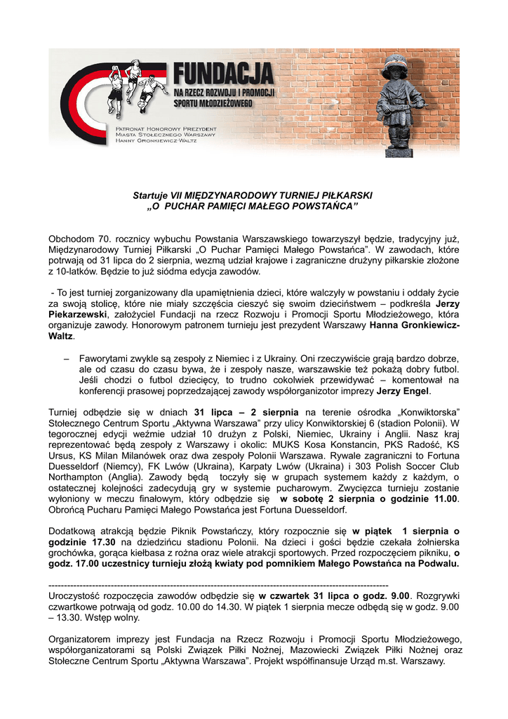 Startuje VII MIĘDZYNARODOWY TURNIEJ PIŁKARSKI „O PUCHAR PAMIĘCI MAŁEGO POWSTAŃCA” Obchodom 70. rocznicy wybuchu Powstania Warszawskiego towarzyszył będzie, tradycyjny już, Międzynarodowy Turniej Piłkarski „O Puchar Pamięci Małego Powstańca”. W zawodach, które potrwają od 31 lipca do 2 sierpnia, wezmą udział krajowe i zagraniczne drużyny piłkarskie złożone z 10-latków. Będzie to już siódma edycja zawodów. - To jest turniej zorganizowany dla upamiętnienia dzieci, które walczyły w powstaniu i oddały życie za swoją stolicę, które nie miały szczęścia cieszyć się swoim dzieciństwem – podkreśla Jerzy Piekarzewski, założyciel Fundacji na rzecz Rozwoju i Promocji Sportu Młodzieżowego, która organizuje zawody. Honorowym patronem turnieju jest prezydent Warszawy Hanna GronkiewiczWaltz. – Faworytami zwykle są zespoły z Niemiec i z Ukrainy. Oni rzeczywiście grają bardzo dobrze, ale od czasu do czasu bywa, że i zespoły nasze, warszawskie też pokażą dobry futbol. Jeśli chodzi o futbol dziecięcy, to trudno cokolwiek przewidywać – komentował na konferencji prasowej poprzedzającej zawody współorganizotor imprezy Jerzy Engel. Turniej odbędzie się w dniach 31 lipca – 2 sierpnia na terenie ośrodka „Konwiktorska” Stołecznego Centrum Sportu „Aktywna Warszawa” przy ulicy Konwiktorskiej 6 (stadion Polonii). W tegorocznej edycji weźmie udział 10 drużyn z Polski, Niemiec, Ukrainy i Anglii. Nasz kraj reprezentować będą zespoły z Warszawy i okolic: MUKS Kosa Konstancin, PKS Radość, KS Ursus, KS Milan Milanówek oraz dwa zespoły Polonii Warszawa. Rywale zagraniczni to Fortuna Duesseldorf (Niemcy), FK Lwów (Ukraina), Karpaty Lwów (Ukraina) i 303 Polish Soccer Club Northampton (Anglia). Zawody będą toczyły się w grupach systemem każdy z każdym, o ostatecznej kolejności zadecydują gry w systemie pucharowym. Zwycięzca turnieju zostanie wyłoniony w meczu finałowym, który odbędzie się w sobotę 2 sierpnia o godzinie 11.00. Obrońcą Pucharu Pamięci Małego Powstańca jest Fortuna Duesseldorf. Dodatkową atrakcją będzie Piknik Powstańczy, który rozpocznie się w piątek 1 sierpnia o godzinie 17.30 na dziedzińcu stadionu Polonii. Na dzieci i gości będzie czekała żołnierska grochówka, gorąca kiełbasa z rożna oraz wiele atrakcji sportowych. Przed rozpoczęciem pikniku, o godz. 17.00 uczestnicy turnieju złożą kwiaty pod pomnikiem Małego Powstańca na Podwalu. ------------------------------------------------------------------------------------------------------------Uroczystość rozpoczęcia zawodów odbędzie się w czwartek 31 lipca o godz. 9.00. Rozgrywki czwartkowe potrwają od godz. 10.00 do 14.30. W piątek 1 sierpnia mecze odbędą się w godz. 9.00 – 13.30. Wstęp wolny. Organizatorem imprezy jest Fundacja na Rzecz Rozwoju i Promocji Sportu Młodzieżowego, współorganizatorami są Polski Związek Piłki Nożnej, Mazowiecki Związek Piłki Nożnej oraz Stołeczne Centrum Sportu „Aktywna Warszawa”. Projekt współfinansuje Urząd m.st. Warszawy. Plakat turnieju: http://www.mlodysportowiec.org/wp-content/uploads/2014/07/plakatVII.pdf Więcej informacji: http://www.mlodysportowiec.org/wp-content/uploads/2014/07/FOLDERVII.pdf