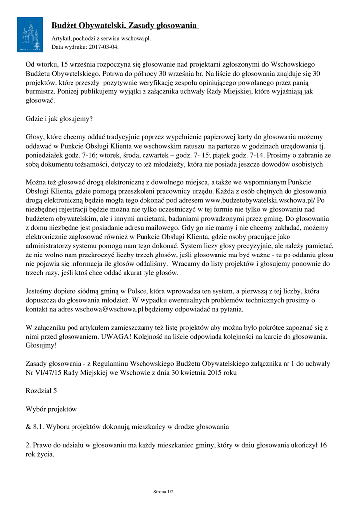 Budżet Obywatelski. Zasady głosowania Artykuł‚ pochodzi z serwisu wschowa.pl. Data wydruku: 2017-03-04. Od wtorku, 15 września rozpoczyna się głosowanie nad projektami zgłoszonymi do Wschowskiego Budżetu Obywatelskiego. Potrwa do północy 30 września br. Na liście do głosowania znajduje się 30 projektów, które przeszły pozytywnie weryfikację zespołu opiniującego powołanego przez panią burmistrz. Poniżej publikujemy wyjątki z załącznika uchwały Rady Miejskiej, które wyjaśniają jak głosować. Gdzie i jak głosujemy? Głosy, które chcemy oddać tradycyjnie poprzez wypełnienie papierowej karty do głosowania możemy oddawać w Punkcie Obsługi Klienta we wschowskim ratuszu na parterze w godzinach urzędowania tj. poniedziałek godz. 7-16; wtorek, środa, czwartek – godz. 7- 15; piątek godz. 7-14. Prosimy o zabranie ze sobą dokumentu tożsamości, dotyczy to też młodzieży, która nie posiada jeszcze dowodów osobistych Można też głosować drogą elektroniczną z dowolnego miejsca, a także we wspomnianym Punkcie Obsługi Klienta, gdzie pomogą przeszkoleni pracownicy urzędu. Każda z osób chętnych do głosowania drogą elektroniczną będzie mogła tego dokonać pod adresem www.budzetobywatelski.wschowa.pl/ Po niezbędnej rejestracji będzie można nie tylko uczestniczyć w tej formie nie tylko w głosowaniu nad budżetem obywatelskim, ale i innymi ankietami, badaniami prowadzonymi przez gminę. Do głosowania z domu niezbędne jest posiadanie adresu mailowego. Gdy go nie mamy i nie chcemy zakładać, możemy elektronicznie zagłosować również w Punkcie Obsługi Klienta, gdzie osoby pracujące jako administratorzy systemu pomogą nam tego dokonać. System liczy głosy precyzyjnie, ale należy pamiętać, że nie wolno nam przekroczyć liczby trzech głosów, jeśli głosowanie ma być ważne - tu po oddaniu głosu nie pojawia się informacja ile głosów oddaliśmy. Wracamy do listy projektów i głosujemy ponownie do trzech razy, jeśli ktoś chce oddać akurat tyle głosów. Jesteśmy dopiero siódmą gminą w Polsce, która wprowadza ten system, a pierwszą z tej liczby, która dopuszcza do głosowania młodzież. W wypadku ewentualnych problemów technicznych prosimy o kontakt na adres [email protected] będziemy odpowiadać na pytania. W załączniku pod artykułem zamieszczamy też listę projektów aby można było pokrótce zapoznać się z nimi przed głosowaniem. UWAGA! Kolejność na liście odpowiada kolejności na karcie do głosowania. Głosujmy! Zasady głosowania - z Regulaminu Wschowskiego Budżetu Obywatelskiego załącznika nr 1 do uchwały Nr VI/47/15 Rady Miejskiej we Wschowie z dnia 30 kwietnia 2015 roku Rozdział 5 Wybór projektów & 8.1. Wyboru projektów dokonują mieszkańcy w drodze głosowania 2. Prawo do udziału w głosowaniu ma każdy mieszkaniec gminy, który w dniu głosowania ukończył 16 rok życia. Strona 1/2 Budżet Obywatelski. Zasady głosowania Artykuł‚ pochodzi z serwisu wschowa.pl. Data wydruku: 2017-03-04. & 9. 3. Oddanie głosu przez mieszkańca następuje poprzez wrzucenie karty do urny oraz w trybie elektronicznym. & 10.1. Karta do głosowania jest osobnym załącznikiem określonym w uchwale. Na karcie do głosowania umieszcza się tytuły projektów zaopiniowanych pozytywnie wraz z krótkim opisem każdego projektu, z określeniem szacunkowego kosztu ich realizacji oraz informacja jak prawidłowo oddać głos. (…) 4. Głosowanie odbywa się poprzez postawienie znaku „X” przy wybranym projekcie na karcie do głosowania. 5. Jeżeli głosujący nie zaznaczy żadnego projektu lub zaznaczy więcej niż 3, jego głos zostanie potraktowany jako nieważny. & 11.1 Obliczenie wyników głosowania polega na zsumowaniu ważnych głosów oddanych przez mieszkańców na każdy z projektów 2. Za przeznaczone do realizacji w ramach Wschowskiego Budżetu Obywatelskiego uznaje się te projekty, które uzyskały najwięcej głosów, a koszt ich realizacji nie przekracza wysokości środków finansowych przeznaczonych w Budżecie Obywatelskim w danym roku kalendarzowym. (600 tys zł. dopisek redakcja) 3. W przypadku uzyskania przez co najmniej dwa projekty, jednakowej, największej liczby głosów, przeprowadza się losowanie. (…) 6. Wyniki głosowania podaje się do publicznej wiadomości poprzez wywieszenie informacji na tablicach ogłoszeń oraz umieszczeniu na stronie internetowej Urzędu Miasta. Strona 2/2 Powered by TCPDF (www.tcpdf.org)