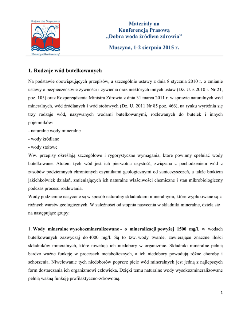 Materiały na Konferencją Prasową „Dobra woda źródłem zdrowia” Muszyna, 1-2 sierpnia 2015 r. 1. Rodzaje wód butelkowanych Na podstawie obowiązujących przepisów, a szczególnie ustawy z dnia 8 stycznia 2010 r. o zmianie ustawy o bezpieczeństwie żywności i żywienia oraz niektórych innych ustaw (Dz. U. z 2010 r. Nr 21, poz. 105) oraz Rozporządzenia Ministra Zdrowia z dnia 31 marca 2011 r. w sprawie naturalnych wód mineralnych, wód źródlanych i wód stołowych (Dz. U. 2011 Nr 85 poz. 466), na rynku wyróżnia się trzy rodzaje wód, nazywanych wodami butelkowanymi, rozlewanych do butelek i innych pojemników: - naturalne wody mineralne - wody źródlane - wody stołowe Ww. przepisy określają szczegółowe i rygorystyczne wymagania, które powinny spełniać wody butelkowane. Atutem tych wód jest ich pierwotna czystość, związana z pochodzeniem wód z zasobów podziemnych chronionych czynnikami geologicznymi od zanieczyszczeń, a także brakiem jakichkolwiek działań, zmieniających ich naturalne właściwości chemiczne i stan mikrobiologiczny podczas procesu rozlewania. Wody podziemne nasycone są w sposób naturalny składnikami mineralnymi, które wypłukiwane są z różnych warstw geologicznych. W zależności od stopnia nasycenia w składniki mineralne, dzielą się na następujące grupy: 1. Wody mineralne wysokozmineralizowane - o mineralizacji powyżej 1500 mg/l. w wodach butelkowanych zazwyczaj do 4000 mg/l. Są to tzw. wody twarde, zawierające znaczne ilości składników mineralnych, które niwelują ich niedobory w organizmie. Składniki mineralne pełnią bardzo ważne funkcję w procesach metabolicznych, a ich niedobory powodują różne choroby i schorzenia. Niwelowanie tych niedoborów poprzez picie wód mineralnych jest jedną z najlepszych form dostarczania ich organizmowi człowieka. Dzięki temu naturalne wody wysokozmineralizowane pełnią ważną funkcję profilaktyczno-zdrowotną. 1 2. Wody mineralne średnio zmineralizowane - o mineralizacji od 500 do 1500 mg/l. Są to wody o umiarkowanej ilości i składników mineralnych, ich pozytywną cechą jest to, że nie naruszają równowagi elektrolitycznej w organizmie, dlatego można je pić w dowolnej ilości w celu gaszenia pragnienia. Posiadając jednak niewielką ilość soli mineralnych są smaczniejsze od wód o niskiej mineralizacji i wód źródlanych. 3. Wody mineralne niskozmineralizowane o mineralizacji poniżej 500 mg na litr. Mogą one być kwalifikowane jako „naturalne wody mineralne – niskozmineralizowane” lub jak dotychczas „wody źródlane”. Posiadają one niewielkie (śladowe) ilości składników mineralnych, które nie mają znaczenia dla organizmu człowieka. Takie wody są alternatywą dla nie zawsze dobrych wód wodociągowych i powinno się ich używać przede wszystkim do użytku domowego - gotowania potraw, parzenia kawy, herbaty i ziół, rozcieńczania koncentratów soków i syropów. Mają tę pozytywną właściwość, że bardzo dobrze rozpuszczają produkty, z których przygotowuje się posiłki, wydobywając z nich potrzebne do celów odżywczych składniki pokarmowe. Takie wody można też pić w niewielkich ilościach w celu ugaszenia pragnienia, ale picie ich w większej ilości nie jest korzystne dla zdrowia, bo rozrzedzają elektrolity znajdujące się w organizmie i mogą naruszyć jego równowagę wodno elektrolitową. Wody takie, jako wody miękkie nadają się za to doskonale do celów higienicznych oraz prania. 4. Wody stołowe (mineralizowane) - które uzyskuje się, poprzez wzbogacanie wód źródlanych w składniki mineralne. Służą one również celom profilaktyczno-zdrowotnym podobnie jak naturalne wody mineralne wysokozmineralizowane celom profilaktyczn-zdrowotnym. W procesie wzbogacania można dodawać do nich składniki mineralne, które są korzystne dla każdego człowieka i dlatego można je pić bez żadnych ograniczeń. Standardem jest to że posiadają one magnez i wapń, a nie posiadają większej ilości wodorowęglanów. 5. Wody lecznicze – jest to specjalna kategoria wód posiadająca właściwości farmakodynamiczne. Spowodowane jest to przeważnie dużą zwartością niektórych składników mineralnych lub zwartością tzw. składników swoistych albo też odpowiednią ich proporcją. Wody lecznicze zawierają w większości ponad 4000 mg/l składników mineralnych, a nawet do 24000 w wodach typu Zuber. Ich działanie lecznicze potwierdzone jest długotrwałymi obserwacjami i badaniami klinicznymi. Mogą być one stosowane tylko według wskazań lekarskich. 2 2. Znaczenie składników mineralnych dla organizmu Wody butelkowane mogą zawierać nawet do 70 różnego rodzaju składników, jednak praktyczne znaczenie ma właściwie tylko dziesięć, które należy uwzględnić przy doborze wody dla potrzeb własnego organizmu. Są to: magnez, wapń, wodorowęglany, chlorki, sód, siarczany, fluorki, jodki, żelazo i dwutlenek węgla. Składniki mineralne znajdujące się w wodzie mogą mieć znaczenie zdrowotne dla organizmu, jeżeli znajdują się w dawce, w ilości nie mniejszej aniżeli 15 % zalecanego dziennego zapotrzebowania. Magnez bierze udział w ponad 300 procesach biochemicznych i dlatego decyduje o prawidłowej czynności układu immunologicznego i nerwowo-mięśniowego. Zapobiega chorobom nowotworowym, miażdżycy naczyń krwionośnych, zawałom i kamicy nerkowej. Zapobiega zaburzeniom ciąży i opóźnieniom rozwoju płodu. Przeciwdziała stresom, zmniejsza napięcie nerwowe, likwiduje zaburzenia pracy serca i szkodliwe skutki działania alkoholu. Chroni przed zatruciami związkami fluoru, rtęci, ołowiu i innych metali ciężkich oraz zmniejsza skutki wpływu zanieczyszczeń przemysłowych na organizm. Wapń jest podstawowym składnikiem kości i zębów. Wpływa korzystnie na przemianę materii i jest niezbędny do utrzymywania normalnej czynności serca i prawidłowej aktywności układu mięśniowoner