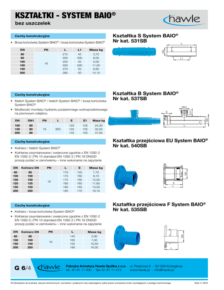 KSZTAŁTKI - SYSTEM BAIO® bez uszczelek DN 80 80 100 100 150 200 PN L L1 Masa kg 16 215 500 255 500 270 280 45 330 45 290 50 50 3,70 8,00 5,00 11,00 8,60 14,10 Cechy konstrukcyjne • Kielich System BAIO® / kielich System BAIO® / bosa końcówka System BAIO® L1 Kształtka B System BAIO® Nr kat. 537SB DN1 • Możliwość montażu hydrantu podziemnego wolnoprzelotowego na pionowym odejściu DN1 80 80 80 PN 16 L E E1 Masa kg 850 120 125 145 105 105 105 24,30 35,00 47,00 E DN DN 100 150 200 L E1 • Bosa końcówka System BAIO® / bosa końcówka System BAIO® Kształtka S System BAIO® Nr kat. 531SB DN Cechy konstrukcyjne L Kształtka przejściowa EU System BAIO® Nr kat. 540SB Cechy konstrukcyjne • Kołnierz / kielich System BAIO® DN Kołnierz DN 80 100 100 125 150 200 80 100 150 125 150 200 PN L E Masa kg 16 170 175 175 180 180 185 155 160 160 165 165 170 7,70 9,10 12,00 11,60 13,20 19,10 DN • Kołnierze zwymiarowane i owiercone zgodnie z EN 1092-2 EN 1092-2 | PN 10 standard EN 1092-2 | PN 16 DN200 proszę podać w zamówieniu – inne wykonania na zapytanie E L Kształtka przejściowa F System BAIO® Nr kat. 535SB Cechy konstrukcyjne • Kołnierz / bosa końcówka System BAIO® DN Kołnierz DN 80 100 150 200 80 100 150 200 G 6/4 PN L Masa kg 16 145 165 155 190 5,90 7,00 10,50 16,00 Fabryka Armatury Hawle Spółka z o.o. tel.: 61 81 11 400 - fax: 61 81 11 413 DN • Kołnierze zwymiarowane i owiercone zgodnie z EN 1092-2 EN 1092-2 | PN 10 standard EN 1092-2 | PN 16 DN200 proszę podać w zamówieniu – inne wykonania na zapytanie L ul. Piaskowa 9 - 62-028 Koziegłowy www.hawle.pl - [email protected] W odniesieniu do ilustracji, danych technicznych, wymiarów i podanych mas zastrzegamy sobie prawo wnoszenia zmian wynikających z postępu technicznego. Wyd. 4. 2015 SYSTEM BAIO® łatwe i szybkie rozwiązanie do połączeń rurociągów i kształtek DN 80-300 Cechy konstrukcyjne • Prosty montaż, łatwe zabezpieczenie przed przesunięciem przy ryglowaniu, oszczędności na materiale i czasie montażu • Praktycznie możliwe każde rozwiązanie w połączeniach rurociągów • Bezkołnierzowe i bezśrubowe połączenie z możliwością odchylenia osiowego (max. 3°), połączenie kielichowe z żeliwa sferoidalnego • Zabezpieczenie przed przesunięciem za pomocą bezpośredniego ryglowania armatury System BAIO® z podwójnym kielichem oraz System BAIO® z końcówką bosą z kielichowym systemem uszczelnienia w zależności od rodzaju rury • Uniwersalne zastosowanie do rur żeliwnych, stalowych, PE i PVC • Zmniejszona waga i niskie koszty magazynowania • Zabezpieczenie przed przesunięciem za pomocą pierścieni zabezpieczających Hawle-Stop do rur żeliwnych PE i PVC • Ochrona antykorozyjna osiągnięta metodą fluidyzacyjnego spiekania powłoki, wg wytycznych Stowarzyszenia Ochrony Antykorozyjnej (GSK) • Wszystkie kielichy kształtek i zasuw dostarczane są bez uszczelek Należy wybrać odpowiednie uszczelnienie w zależności od rodzaju zastosowanej rury Przed montażem należy uszczelnienie pokryć środkiem smarnym ułatwiającym połączenie • Program produkcji: zasuwy odcinające armatura Combi kształtki 1 kielich do 3 rodzajów rur Pierścień zaciskowy HAWLE-STOP Pierścień zaciskowy HAWLE-STOP DN 80-200 Uszczelka GKS Uszczelka wargowa BLD® E Rura P a eliwn Rura ż lub Uszczelka GKS Uszczelka TYTON® a eliwn Rura ż ra V PC Fabryka Armatury Hawle Spółka z o.o. tel.: 61 81 11 400 - fax: 61 81 11 413 Ru Pierścień zaciskowy Express Kielichy wtykowe nadają się do wszystkich popularnych typów rur • żeliwnych • PE • PVC • stalowych w połączeniu z rurą stalową końcówka do spawania (na zapytanie) Dla rur PE należy stosować tuleje wzmacniające nr kat. 6035/6036 HAWLE-STOP Pierścień zaciskowy KORUND BAIO® – SIT pierścień ryglujący DN 250-300 Wyd. 4. 2015 BAIO-SIT DN 250-300 ul. Piaskowa 9 - 62-028 Koziegłowy www.hawle.pl - [email protected] G 2/1 W odniesieniu do ilustracji, danych technicznych, wymiarów i podanych mas zastrzegamy sobie prawo wnoszenia zmian wynikających z postępu technicznego.