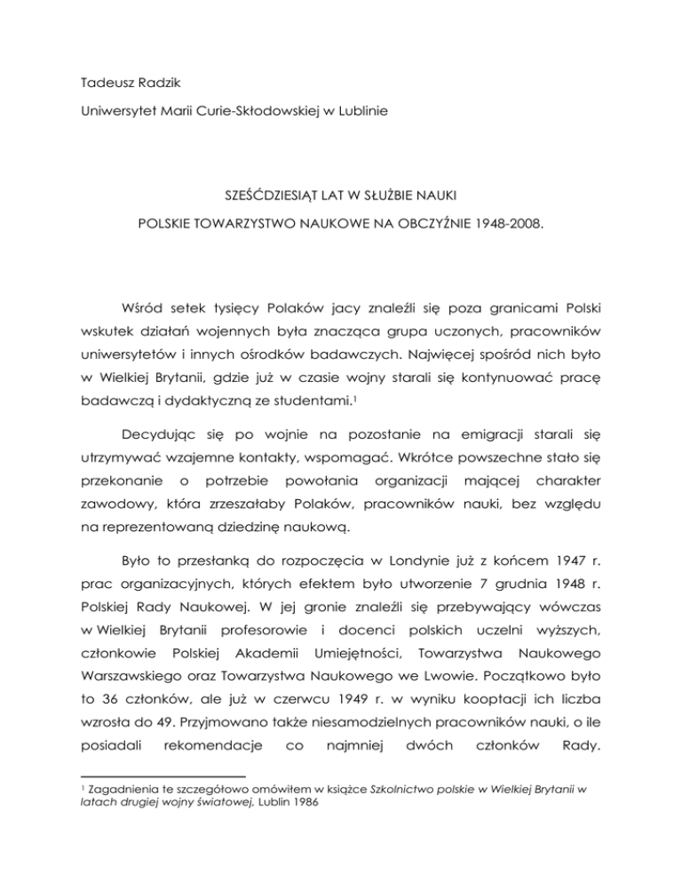Tadeusz Radzik Uniwersytet Marii Curie-Skłodowskiej w Lublinie SZEŚĆDZIESIĄT LAT W SŁUŻBIE NAUKI POLSKIE TOWARZYSTWO NAUKOWE NA OBCZYŹNIE 1948-2008. Wśród setek tysięcy Polaków jacy znaleźli się poza granicami Polski wskutek działań wojennych była znacząca grupa uczonych, pracowników uniwersytetów i innych ośrodków badawczych. Najwięcej spośród nich było w Wielkiej Brytanii, gdzie już w czasie wojny starali się kontynuować pracę badawczą i dydaktyczną ze studentami.1 Decydując się po wojnie na pozostanie na emigracji starali się utrzymywać wzajemne kontakty, wspomagać. Wkrótce powszechne stało się przekonanie o potrzebie powołania organizacji mającej charakter zawodowy, która zrzeszałaby Polaków, pracowników nauki, bez względu na reprezentowaną dziedzinę naukową. Było to przesłanką do rozpoczęcia w Londynie już z końcem 1947 r. prac organizacyjnych, których efektem było utworzenie 7 grudnia 1948 r. Polskiej Rady Naukowej. W jej gronie znaleźli się przebywający wówczas w Wielkiej członkowie Brytanii Polskiej profesorowie Akademii i docenci Umiejętności, polskich uczelni Towarzystwa wyższych, Naukowego Warszawskiego oraz Towarzystwa Naukowego we Lwowie. Początkowo było to 36 członków, ale już w czerwcu 1949 r. w wyniku kooptacji ich liczba wzrosła do 49. Przyjmowano także niesamodzielnych pracowników nauki, o ile posiadali rekomendacje co najmniej dwóch członków Rady. Zagadnienia te szczegółowo omówiłem w książce Szkolnictwo polskie w Wielkiej Brytanii w latach drugiej wojny światowej, Lublin 1986 1 Przewodniczącym Rady wybrano prof. Tadeusz Brzeskiego, ekonomistę i prawnika, b. rektora Uniwersytetu Warszawskiego. Jego zastępcami zostali: Władysław Folkierski oraz Marian Kukiel. Nie tworząc wydziałów powołano dwie komisje: nauk humanistyczno-społecznych oraz nauk przyrodniczych. Organizując Radę zakładano, iż stanie się ona zaczynem tworzącym podwaliny pod Polską Akademię Umiejętności na emigracji (w ramach tworzenia namiastki państwa na emigracji z jego władzami i instytucjami). Dopóki PAU mogła jeszcze funkcjonować w kraju we w miarę normalnych warunkach uznawano za stosowne powstrzymywać się od dalszych działań idących w tym kierunku. Jednak postępujący proces zniewolenia nauki polskiej, szczególnie widoczny od 1949 r., zapowiedź likwidacji Polskiej Akademii Umiejętności i powołania w jej miejsce Polskiej Akademii Nauk ( co ostatecznie nastąpiło w 1951 r.) spowodowało podjęcie prac reorganizacyjnych mających nadać Radzie charakter zbliżony do PAU. 27 stycznia 1950 r. zgromadzenia członkowie Rady zdecydowali o przekształceniu jej w Polskie Towarzystwo Naukowe na Obczyźnie. Statut przewidywał (a wskazywała na to i nazwa), iż swej działalności Towarzystwo nie będzie ograniczało do terenu Wielkiej Brytanii, ale obejmie swym zasięgiem uczonych polskich poza Polską bez względu na kraj zamieszkania.2 Przyjęto zasadę, iż członkowie Rady niejako automatycznie stawali się członkami PTNO, pozostałych przyjmowano na mocy decyzji Zgromadzenia Ogólnego. Elitarny charakter Towarzystwa miało zapewnić wprowadzenie klauzuli o ograniczonej liczbie jego członków - do 90. Utworzono dwa wydziały: humanistyczny i przyrodniczy oraz komisje specjalistyczne, do których należeć mogły osoby nie będące członkami (nie spełniające wymogów wybrano członkostwa). prof. Przewodniczącym Stanisława Strońskiego, a wydziału wydziału humanistycznego przyrodniczego – prof. Zygmunta Klemensiewicza. Nie dokonano zmian w prezydium, uzupełniając je tylko o Kazimierza Rouperta jako sekretarza generalnego, Sprawozdanie ogólne Prezesa Towarzystwa, „Rocznik Polskiego Towarzystwa Naukowego na Obczyźnie” [dalej: „Rocznik PTNO”]. Rok 1950/1951, Londyn 1951, s. 14-16 2 Zbigniewa Leliwę i Adama Żółtowskiego jako członków oraz przewodniczących wydziałów. Na pierwszym dorocznym zebraniu w dniu 30 września 1950 r. obecny był Prezydent RP oraz członkowie rządu.3 Zdecydowano, iż od członków Towarzystwa nie będzie się pobierać składek ze względu na ogólne ciężkie ich położenia materialne. Środki finansowe na działalność pochodziły z nielicznych subwencji, np. Polskiego Komitetu Obywatelskiego Pomocy Uchodźcom Polskim w Londynie. Polish Research Centre udostępniała z kolei nieodpłatnie swoje pomieszczenia na zebrania. Statutowymi celami PTNO było: - reprezentowanie, popieranie i obrona niezależnej nauki polskiej na obczyźnie; - czuwanie nad potrzebami i rozwojem nauki polskiej; - koordynowanie polskiej działalności naukowej i rozwijanie inicjatyw w tym zakresie; - prowadzenie wykazu polskich stowarzyszeń naukowych i polskich stowarzyszeń naukowych na obczyźnie oraz ich dorobku naukowego4 Wśród członków Towarzystwa znalazła się elita intelektualna i naukowa przedwojennej Polski. W wydziale humanistycznym byli to m.in. profesorowie Uniwersytetu Warszawskiego: Tadeusz Brzeski, Tadeusz Grodyński, Eugeniusz Jarra, Cezaria Baudouin de Courtenay Jędrzejewiczowa, Oskar Halecki, Jan Łukasiewicz, Zygmunta Zaleski. Z Uniwersytetu Jagiellońskiego członkami PTNO zostali: Władysław Folkierski, Bronisław Hełczyński, Stanisław Stroński, Tadeusz Sulimirski, Stanisław Zaremba, Wacław Lednicki, a z Uniwersytetu Stefana Batorego: Wacław Komarnicki, Stanisław Kościałkowski, Stanisław Swianiewicz, Stefan Glaser. Z Uniwersytetu Poznańskiego wywodzili się: Adam Żółtowski i Florian Znaniecki. Paweł Skwarczyński był profesorem 3 4 Tamże; „Szkolnictwa wyższe i nauka polska na obczyźnie”, nr. 1, Londyn 1951, s. 12-14 Statut Polskiego Towarzystwa Naukowego na Obczyźnie, Londyn 1950 Katolickiego Uniwersytetu Lubelskiego, a Henryk Paszkiewicz i Adam Pragier wywodzili się z Wolnej Wszechnicy Polskiej. Kilku wybitnym już uczonym wybuch wojny uniemożliwił uzyskanie tytułu naukowego profesora. Należy tu wymieni