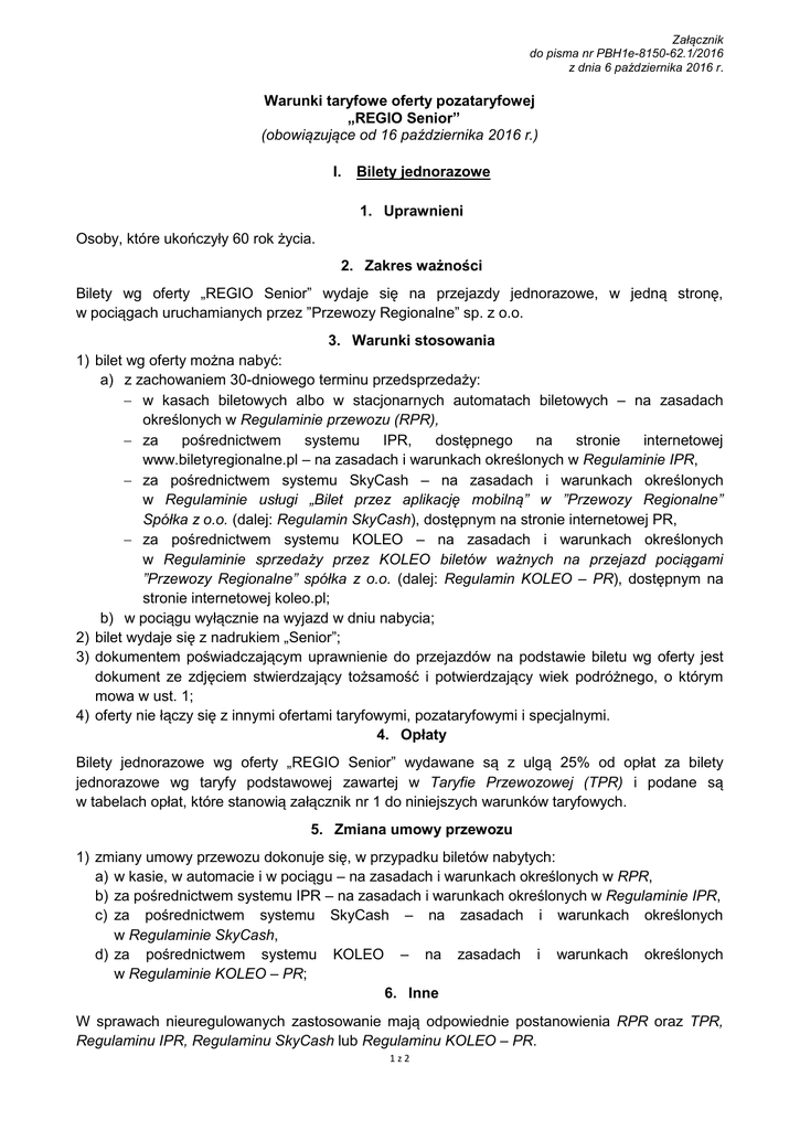Załącznik do pisma nr PBH1e-8150-62.1/2016 z dnia 6 października 2016 r. Warunki taryfowe oferty pozataryfowej „REGIO Senior” (obowiązujące od 16 października 2016 r.) I. Bilety jednorazowe 1. Uprawnieni Osoby, które ukończyły 60 rok życia. 2. Zakres ważności Bilety wg oferty „REGIO Senior” wydaje się na przejazdy jednorazowe, w jedną stronę, w pociągach uruchamianych przez ”Przewozy Regionalne” sp. z o.o. 3. Warunki stosowania 1) bilet wg oferty można nabyć: a) z zachowaniem 30-dniowego terminu przedsprzedaży: w kasach biletowych albo w stacjonarnych automatach biletowych – na zasadach określonych w Regulaminie przewozu (RPR), za pośrednictwem systemu IPR, dostępnego na stronie internetowej www.biletyregionalne.pl – na zasadach i warunkach określonych w Regulaminie IPR, za pośrednictwem systemu SkyCash – na zasadach i warunkach określonych w Regulaminie usługi „Bilet przez aplikację mobilną” w ”Przewozy Regionalne” Spółka z o.o. (dalej: Regulamin SkyCash), dostępnym na stronie internetowej PR, za pośrednictwem systemu KOLEO – na zasadach i warunkach określonych w Regulaminie sprzedaży przez KOLEO biletów ważnych na przejazd pociągami ”Przewozy Regionalne” spółka z o.o. (dalej: Regulamin KOLEO – PR), dostępnym na stronie internetowej koleo.pl; b) w pociągu wyłącznie na wyjazd w dniu nabycia; 2) bilet wydaje się z nadrukiem „Senior”; 3) dokumentem poświadczającym uprawnienie do przejazdów na podstawie biletu wg oferty jest dokument ze zdjęciem stwierdzający tożsamość i potwierdzający wiek podróżnego, o którym mowa w ust. 1; 4) oferty nie łączy się z innymi ofertami taryfowymi, pozataryfowymi i specjalnymi. 4. Opłaty Bilety jednorazowe wg oferty „REGIO Senior” wydawane są z ulgą 25% od opłat za bilety jednorazowe wg taryfy podstawowej zawartej w Taryfie Przewozowej (TPR) i podane są w tabelach opłat, które stanowią załącznik nr 1 do niniejszych warunków taryfowych. 5. Zmiana umowy przewozu 1) zmiany umowy przewozu dokonuje się, w przypadku biletów nabytych: a) w kasie, w automacie i w pociągu – na zasadach i warunkach określonych w RPR, b) za pośrednictwem systemu IPR – na zasadach i warunkach określonych w Regulaminie IPR, c) za pośrednictwem systemu SkyCash – na zasadach i warunkach określonych w Regulaminie SkyCash, d) za pośrednictwem systemu KOLEO – na zasadach i warunkach określonych w Regulaminie KOLEO – PR; 6. Inne W sprawach nieuregulowanych zastosowanie mają odpowiednie postanowienia RPR oraz TPR, Regulaminu IPR, Regulaminu SkyCash lub Regulaminu KOLEO – PR. 1z2 Załącznik do pisma nr PBH1e-8150-62.1/2016 z dnia 6 października 2016 r. II. Bilety okresowe imienne: odcinkowe i sieciowe 1. Uprawnieni Osoby, które ukończyły 60 rok życia. 2. Zakres ważności 1) wydaje się następujące rodzaje biletów okresowych: a) odcinkowe na przejazdy pociągami REGIO: tygodniowe, miesięczne kwartalne, b) odcinkowe na przejazdy pociągami interREGIO – miesięczne, c) sieciowe na przejazdy w pociągach uruchamianych przez ”Przewozy Regionalne” sp. z o.o. – miesięczne; 2) bilety odcinkowe wydaje się na przejazdy w jedną stronę albo „tam i z powrotem”; 3) bilet, o którym mowa w pkt 2, uprawnia do wielokrotnych przejazdów, drogą najkrótszą lub wskazaną na bilecie, między wszystkimi stacjami odcinka, na który został wydany. 3. Warunki stosowania 1) bilety wg oferty można nabyć: a) z zachowaniem 30-dniowego terminu przedsprzedaży: w kasach biletowych albo w automatach biletowych – na zasadach określonych w Regulaminie przewozu (RPR), za pośrednictwem systemu IPR, dostępnego na stronie internetowej www.biletyregionalne.pl – na zasadach i warunkach określonych w Regulaminie IPR, b) w pociągu wyłącznie z terminem ważności rozpoczynającym się w dniu nabycia; 2) bilety wydawane są wyłącznie elektronicznie; 3) bilet wydaje się z nadrukiem „Senior”; 4) dokumentem poświadczającym uprawnienie do przejazdów na podstawie biletu wg oferty jest dokument ze zdjęciem stwierdzający tożsamość i potwierdzający wiek podróżnego, o którym mowa w ust. 1; 4. Opłaty Bilety okresowe wg oferty „REGIO Senior” wydawane są z ulgą 10% od opłat za bilety okresowe wg taryfy podstawowej zawartej w Taryfie Przewozowej (TPR) i podane są w tabelach opłat, które stanowią załącznik nr 2 do niniejszych warunków taryfowych. 5. Zmiana umowy przewozu Zmiany umowy przewozu dokonuje się w przypadku biletów nabytych: a) w kasie, w automacie i w pociągu - na zasadach określonych w RPR, b) za pośrednictwem systemu IPR – zgodnie z Regulaminem IPR; 6. Inne W sprawach nieuregulowanych zastosowanie mają postanowienia RPR oraz TPR lub Regulaminu IPR. 2z2