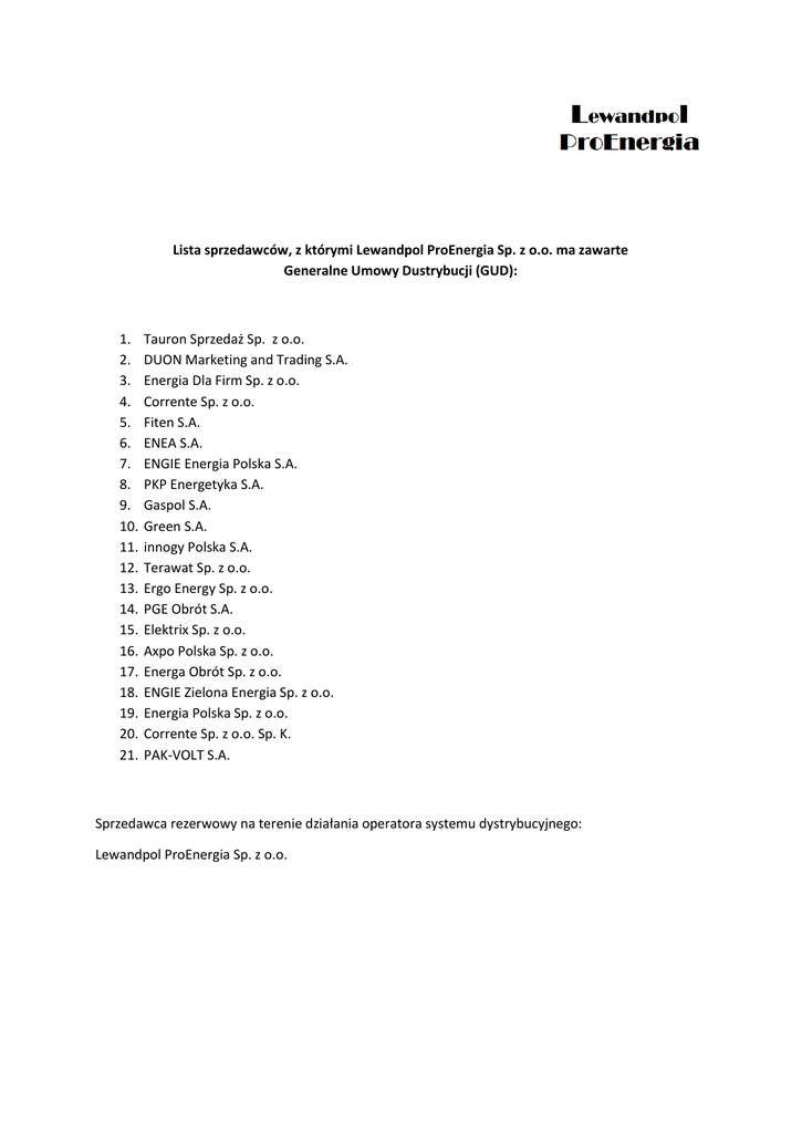 Lista sprzedawców, z którymi Lewandpol ProEnergia Sp. z o.o. ma zawarte Generalne Umowy Dustrybucji (GUD): 1. 2. 3. 4. 5. 6. 7. 8. 9. 10. 11. 12. 13. 14. 15. 16. 17. 18. 19. 20. 21. Tauron Sprzedaż Sp. z o.o. DUON Marketing and Trading S.A. Energia Dla Firm Sp. z o.o. Corrente Sp. z o.o. Fiten S.A. ENEA S.A. ENGIE Energia Polska S.A. PKP Energetyka S.A. Gaspol S.A. Green S.A. innogy Polska S.A. Terawat Sp. z o.o. Ergo Energy Sp. z o.o. PGE Obrót S.A. Elektrix Sp. z o.o. Axpo Polska Sp. z o.o. Energa Obrót Sp. z o.o. ENGIE Zielona Energia Sp. z o.o. Energia Polska Sp. z o.o. Corrente Sp. z o.o. Sp. K. PAK-VOLT S.A. Sprzedawca rezerwowy na terenie działania operatora systemu dystrybucyjnego: Lewandpol ProEnergia Sp. z o.o.