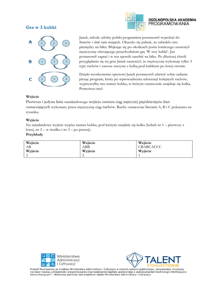 Gra w 3 kubki Janek, młody zdolny polski programista postanowił wyjechać do Stanów i zbić tam majątek. Okazało się jednak, że zabrakło mu pieniędzy na bilet. Błąkając się po okolicach portu lotniczego zauważył mężczyznę oferującego przechodniom grę ‘W trzy kubki’. Jan postanowił zagrać i w ten sposób zarobić na bilet. Po dłuższej chwili przyglądania się tej grze Janek zauważył, że mężczyzna wykonuje tylko 3 typy ruchów i zawsze zaczyna z kulką pod kubkiem po lewej stronie. Dzięki wrodzonemu sprytowi Janek postanowił ułatwić sobie zadanie pisząc program, który po wprowadzeniu sekwencji kolejnych ruchów, wypisywałby mu numer kubka, w którym ostatecznie znajduje się kulka. Pomożesz mu? Wejście Pierwsza i jedyna linia standardowego wejścia zawiera ciąg najwyżej pięćdziesięciu liter oznaczających wykonany przez mężczyznę ciąg ruchów. Ruchy oznaczone literami A, B i C pokazano na rysunku. Wyjście Na standardowe wyjście wypisz numer kubka, pod którym znajdzie się kulka (kubek nr 1 – pierwszy z lewej, nr 2 – w środku i nr 3 – po prawej). Przykłady Wejście AB Wyjście 3 Wejście ABB Wyjście 2 Wejście CBABCACCC Wyjście 1