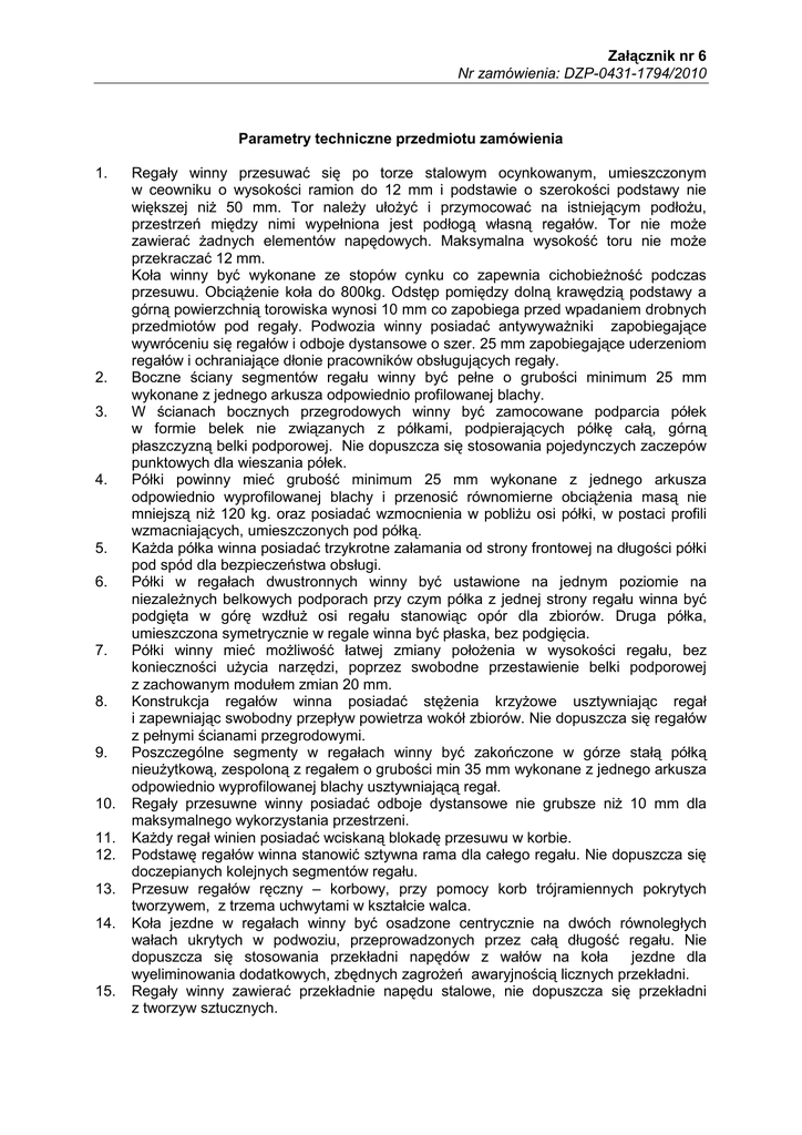 Załącznik nr 6 Nr zamówienia: DZP-0431-1794/2010 Parametry techniczne przedmiotu zamówienia 1. 2. 3. 4. 5. 6. 7. 8. 9. 10. 11. 12. 13. 14. 15. Regały winny przesuwać się po torze stalowym ocynkowanym, umieszczonym w ceowniku o wysokości ramion do 12 mm i podstawie o szerokości podstawy nie większej niŜ 50 mm. Tor naleŜy ułoŜyć i przymocować na istniejącym podłoŜu, przestrzeń między nimi wypełniona jest podłogą własną regałów. Tor nie moŜe zawierać Ŝadnych elementów napędowych. Maksymalna wysokość toru nie moŜe przekraczać 12 mm. Koła winny być wykonane ze stopów cynku co zapewnia cichobieŜność podczas przesuwu. ObciąŜenie koła do 800kg. Odstęp pomiędzy dolną krawędzią podstawy a górną powierzchnią torowiska wynosi 10 mm co zapobiega przed wpadaniem drobnych przedmiotów pod regały. Podwozia winny posiadać antywywaŜniki zapobiegające wywróceniu się regałów i odboje dystansowe o szer. 25 mm zapobiegające uderzeniom regałów i ochraniające dłonie pracowników obsługujących regały. Boczne ściany segmentów regału winny być pełne o grubości minimum 25 mm wykonane z jednego arkusza odpowiednio profilowanej blachy. W ścianach bocznych przegrodowych winny być zamocowane podparcia półek w formie belek nie związanych z półkami, podpierających półkę całą, górną płaszczyzną belki podporowej. Nie dopuszcza się stosowania pojedynczych zaczepów punktowych dla wieszania półek. Półki powinny mieć grubość minimum 25 mm wykonane z jednego arkusza odpowiednio wyprofilowanej blachy i przenosić równomierne obciąŜenia masą nie mniejszą niŜ 120 kg. oraz posiadać wzmocnienia w pobliŜu osi półki, w postaci profili wzmacniających, umieszczonych pod półką. KaŜda półka winna posiadać trzykrotne załamania od strony frontowej na długości półki pod spód dla bezpieczeństwa obsługi. Półki w regałach dwustronnych winny być ustawione na jednym poziomie na niezaleŜnych belkowych podporach przy czym półka z jednej strony regału winna być podgięta w górę wzdłuŜ osi regału stanowiąc opór dla zbiorów. Druga półka, umieszczona symetrycznie w regale winna być płaska, bez podgięcia. Półki winny mieć moŜliwość łatwej zmiany połoŜenia w wysokości regału, bez konieczności uŜycia narzędzi, poprzez swobodne przestawienie belki podporowej z zachowanym modułem zmian 20 mm. Konstrukcja regałów winna posiadać stęŜenia krzyŜowe usztywniając regał i zapewniając swobodny przepływ powietrza wokół zbiorów. Nie dopuszcza się regałów z pełnymi ścianami przegrodowymi. Poszczególne segmenty w regałach winny być zakończone w górze stałą półką nieuŜytkową, zespoloną z regałem o grubości min 35 mm wykonane z jednego arkusza odpowiednio wyprofilowanej blachy usztywniającą regał. Regały przesuwne winny posiadać odboje dystansowe nie grubsze niŜ 10 mm dla maksymalnego wykorzystania przestrzeni. KaŜdy regał winien posiadać wciskaną blokadę przesuwu w korbie. Podstawę regałów winna stanowić sztywna rama dla całego regału. Nie dopuszcza się doczepianych kolejnych segmentów regału. Przesuw regałów ręczny – korbowy, przy pomocy korb trójramiennych pokrytych tworzywem, z trzema uchwytami w kształcie walca. Koła jezdne w regałach winny być osadzone centrycznie na dwóch równoległych wałach ukrytych w podwoziu, przeprowadzonych przez całą długość regału. Nie dopuszcza się stosowania przekładni napędów z wałów na koła jezdne dla wyeliminowania dodatkowych, zbędnych zagroŜeń awaryjnością licznych przekładni. Regały winny zawierać przekładnie napędu stalowe, nie dopuszcza się przekładni z tworzyw sztucznych. Załącznik nr 6 Nr zamówienia: DZP-0431-1794/2010 16. 17. 18. 19. 20. 21. 22. 23. 24. 25. Regały dwustronne winny być wyposaŜone w trzy metalowe tabliczki opisowe dla kaŜdego regału a regały jednostronne w dwie tabliczki opisowe. Co najmniej dwie tabliczki w regale dwustronnym a jedna w regale jednostronnym, winna być przystosowana do włoŜenia opisu w formacie A 5 zawartości regału. Ustala się oczekiwany kolor dla regałów jako RAL 7035 a dla elementów dodatkowych – wg. standardów dostawcy, farba proszkowa poliestrowo-epoksydowa. Wymiary regałów winny mieścić się w wymiarach wskazanych na planach rozmieszczenia regałów, przy czym długości regałów nie obejmują korb do napędu. Na planach rozmieszczenia regałów wskazano takŜe długości segmentów regałów, które naleŜy zachować, mierzone w osiach bocznych ścian przegrodowych. Głębokość półek winna wynosić 300 mm. Maksymalna dopuszczalna wysokość regałów z szynami nie powinna przekraczać 272 cm. Wymagana ilość poziomów półek uŜytkowych wynosi: 7 uŜytkowych plus 1 kryjąca, przy zachowaniu rozstawu pomiędzy półkami („światło”) 375 mm dla kaŜdej wysokości regału. Ilość oczekiwanych półek uŜytkowych wynosi 630 mb. Półki uŜytkowe dla potrzeb niniejszej realizacji zostały przeliczone w osiach bocznych ścian podporowych, toteŜ przy zachowaniu osi segmentów i zmiennej grubości ścian regałów róŜnych wykonawców, wielkości te ulegną zmianie i nie będą stanowić przedmiotu dodatkowych analiz zamawiającego. Wymagany okres gwarancji na uŜytkowanie regałów wynosi co najmniej 36 miesięcy od daty podpisania protokołu odbioru końcowego. W okresie gwarancji wykonawca zobowiązany będzie do usuwania wszelkich usterek i awarii. Wymagany termin usunięcia usterki lub awarii – do 14 dni od daty przyjęcia zgłoszenia. Proponowane regały winny posiadać atest higieniczny PZH, atesty ogniowe na niepalność materiałów, świadectwo bezpieczeństwa pracy. Wymagany termin wykonania zamówienia (dostawy torów i regałów wraz z ich montaŜem) - 2 tygodnie od daty zawarcia umowy.