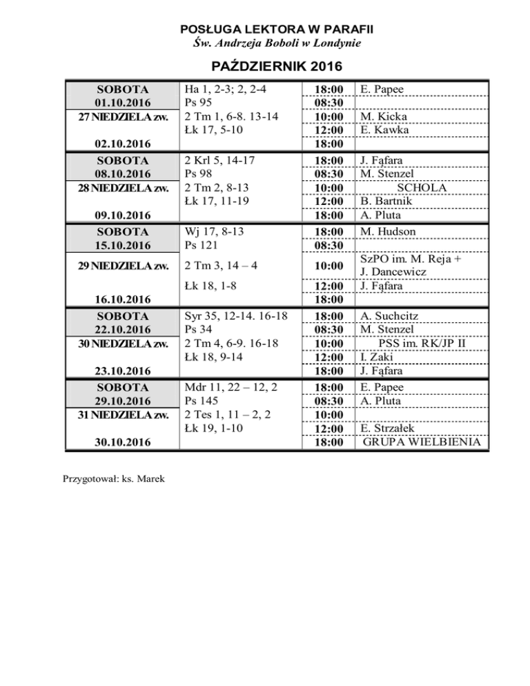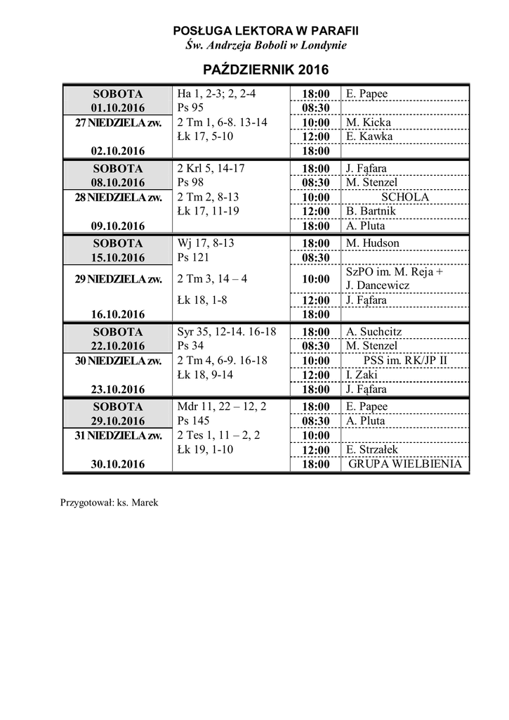 POSŁUGA LEKTORA W PARAFII Św. Andrzeja Boboli w Londynie PAŹDZIERNIK 2016 SOBOTA 01.10.2016 27 NIEDZIELA zw. 02.10.2016 SOBOTA 08.10.2016 28 NIEDZIELA zw. 09.10.2016 SOBOTA 15.10.2016 29 NIEDZIELA zw. 16.10.2016 SOBOTA 22.10.2016 30 NIEDZIELA zw. 23.10.2016 SOBOTA 29.10.2016 31 NIEDZIELA zw. 30.10.2016 Przygotował: ks. Marek Ha 1, 2-3; 2, 2-4 Ps 95 2 Tm 1, 6-8. 13-14 Łk 17, 5-10 Wj 17, 8-13 Ps 121 18:00 08:30 10:00 12:00 18:00 18:00 08:30 10:00 12:00 18:00 18:00 08:30 2 Tm 3, 14 – 4 10:00 Łk 18, 1-8 12:00 18:00 18:00 08:30 10:00 12:00 18:00 18:00 08:30 10:00 12:00 18:00 2 Krl 5, 14-17 Ps 98 2 Tm 2, 8-13 Łk 17, 11-19 Syr 35, 12-14. 16-18 Ps 34 2 Tm 4, 6-9. 16-18 Łk 18, 9-14 Mdr 11, 22 – 12, 2 Ps 145 2 Tes 1, 11 – 2, 2 Łk 19, 1-10 E. Papee M. Kicka E. Kawka J. Fąfara M. Stenzel SCHOLA B. Bartnik A. Pluta M. Hudson SzPO im. M. Reja + J. Dancewicz J. Fąfara A. Suchcitz M. Stenzel PSS im. RK/JP II I. Zaki J. Fąfara E. Papee A. Pluta E. Strzałek GRUPA WIELBIENIA 2 października 2016 r. XXVII Niedziela zwykła PIERWSZE CZYTANIE Ha 1, 2-3; 2, 2-4 Sprawiedliwy żyć będzie dzięki swej wierności Czytanie z Księgi proroka Habakuka Dokądże, Panie, wzywać Cię będę, a Ty nie wysłuchujesz? Wołać będę ku Tobie: «Krzywda mi się dzieje», a Ty nie pomagasz? Czemu każesz mi patrzeć na nieprawość i na zło spoglądasz bezczynnie? Oto ucisk i przemoc przede mną, powstają spory, wybuchają waśnie. I odpowiedział Pan tymi słowami: «Zapisz widzenie, na tablicach wyryj, by można było łatwo je odczytać. Jest to widzenie na czas oznaczony, lecz wypełnienie jego niechybnie nastąpi; a jeśli się opóźnia, ty go oczekuj, bo w krótkim czasie przyjdzie niezawodnie. Oto zginie ten, co jest ducha nieprawego, a sprawiedliwy żyć będzie dzięki swej wierności». Oto Słowo Boże. PSALM RESPONSORYJNY: Ps 95 (94), 1-2. 6-7ab. 7c-9 (R.: por. 8a) Słysząc głos Pana, serc nie zatwardzajcie. Przyjdźcie, radośnie śpiewajmy Panu,* wznośmy okrzyki ku chwale Opoki naszego zbawienia. Stańmy przed obliczem Jego z uwielbieniem,* radośnie śpiewajmy Mu pieśni. Słysząc głos Pana, serc nie zatwardzajcie. Przyjdźcie, uwielbiajmy Go padając na twarze,* zegnijmy kolana przed Panem, który nas stworzył. Albowiem On jest naszym Bogiem, * a my ludem Jego pastwiska i owcami w Jego ręku. Słysząc głos Pana, serc nie zatwardzajcie. Obyście dzisiaj usłyszeli głos Jego: † «Niech nie twardnieją wasze serca jak w Meriba,* jak na pustyni w dniu Massa, gdzie Mnie kusili wasi ojcowie,* doświadczali Mnie, choć widzieli moje dzieła». Słysząc głos Pana, serc nie zatwardzajcie. DRUGIE CZYTANIE 2 Tm 1, 6-8. 13-14 Nie dał nam Bóg ducha bojaźni Czytanie z Drugiego listu świętego Pawła Apostoła do Tymoteusza Najdroższy: Przypominam ci, abyś rozpalił na nowo charyzmat Boży, który jest w Tobie przez włożenie moich rąk. Albowiem nie dał nam Bóg ducha bojaźni, ale mocy i miłości, i trzeźwego myślenia. Nie wstydź się zatem świadectwa Pana naszego ani mnie, Jego więźnia, lecz weź udział w trudach i przeciwnościach znoszonych dla Ewangelii według danej mocy Boga. Zdrowe zasady, któreś posłyszał ode mnie, miej za wzorzec w wierze i miłości w Chrystusie Jezusie. Dobrego depozytu strzeż z pomocą Ducha Świętego, który w nas mieszka. Oto Słowo Boże. ŚPIEW PRZED EWANGELIĄ: 1 P 1, 25 Alleluja, Alleluja, Alleluja Słowo Pana trwa na wieki, to słowo ogłoszono wam jako Dobrą Nowinę. Alleluja, Alleluja, Alleluja EWANGELIA Łk 17, 5-10 Służyć z pokorą Słowa Ewangelii według świętego Łukasza Apostołowie prosili Pana: «Przymnóż nam wiary». Pan rzekł: «Gdybyście mieli wiarę jak ziarnko gorczycy, powiedzielibyście tej morwie: „Wyrwij się z korzeniem i przesadź się w morze”, a byłaby wam posłuszna. Kto z was, mając sługę, który orze lub pasie, powie mu, gdy on wróci z pola: Pójdź i siądź do stołu? Czy nie powie mu raczej: Przygotuj mi wieczerzę, przepasz się i usługuj mi, aż zjem i napiję się, a potem ty będziesz jadł i pił? Czy dziękuje słudze za to, że wykonał to, co mu polecono? Tak mówcie i wy, gdy uczynicie wszystko, co wam polecono: Słudzy nieużyteczni jesteśmy; wykonaliśmy to, co powinniśmy wykonać». Oto słowo Pańskie 9 października 2016 r. XXVIII Niedziela zwykła PIERWSZE CZYTANIE 2 Krl 5, 14-17 Uzdrowienie Naamana Czytanie z Drugiej Księgi Królewskiej Wódz Syryjski Naaman, który był trędowaty, zanurzył się siedem razy w Jordanie, według słowa proroka elizeusza, a ciało jego na powrót stało się jak ciało małego dziecka i został oczyszczony. Wtedy wrócił do męża Bożego z całym orszakiem, wszedł i stanął przed nim, mówiąc: «Oto przekonałem się, że na całej ziemi nie ma Boga poza Izraelem. A teraz zechciej przyjąć dar wdzięczności od twego sługi». On zaś odpowiedział: «Na życie Pana, przed którego obliczem stoję, nie wezmę!» Tamten nalegał na niego, aby przyjął, lecz on odmówił. Wtedy Naaman rzekł: «Jeśli już nie chcesz, to niechże dadzą twemu słudze tyle ziemi, ile para mułów unieść może, ponieważ odtąd twój sługa nie będzie składał ofiary całopalnej ani ofiary krwawej innym bogom, jak tylko Panu». Oto Słowo Boże. PSALM RESPONSORYJNY: Ps 98 (97), 1. 2-3ab. 3cd-4 (R.: por. 2) Pan Bóg okazał ludom swe zbawienie. Śpiewajcie Panu pieśń nową,* albowiem uczynił cuda. Zwycięstwo Mu zgotowała Jego prawica* i święte ramię Jego. Pan Bóg okazał ludom swe zbawienie. Pan okazał swoje zbawienie,* na oczach pogan objawił swoją sprawiedliwość. Wspomniał na dobroć i na wierność swoją * dla domu Izraela. Pan Bóg okazał ludom swe zbawienie. Ujrzały wszystkie krańce ziemi * zbawienie Boga naszego. Wołaj z radości na cześć Pana, cała ziemio,* cieszcie się i weselcie, i grajcie. Pan Bóg okazał ludom swe zbawienie. DRUGIE CZYTANIE 2 Tm 2, 8-13 Jeśli trwamy w cierpliwości, będziemy królowali