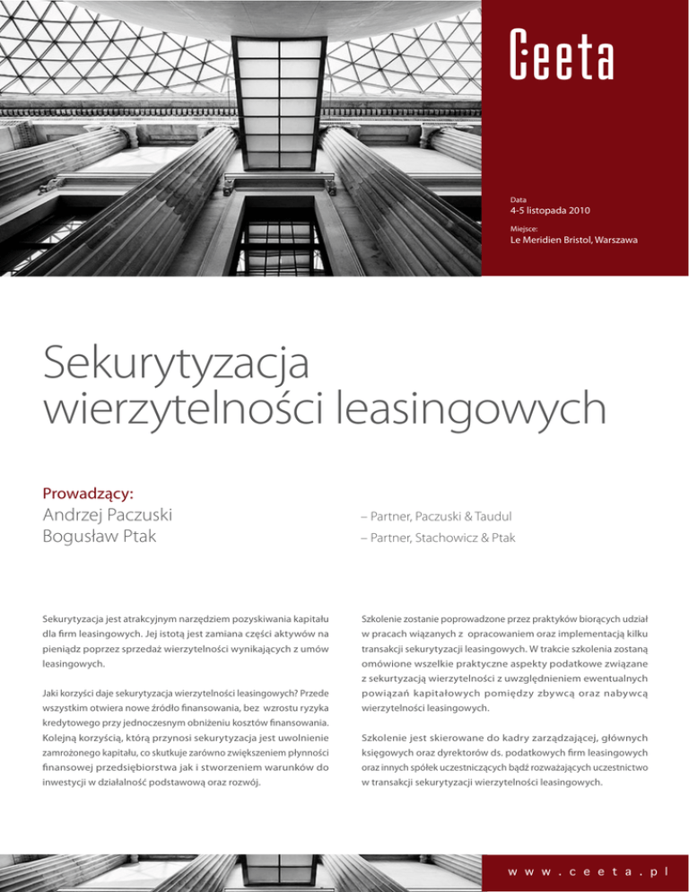 Ceeta Data 4-5 listopada 2010 Miejsce: Le Meridien Bristol, Warszawa Sekurytyzacja wierzytelności leasingowych Prowadzący: Andrzej Paczuski Bogusław Ptak – Partner, Paczuski & Taudul Sekurytyzacja jest atrakcyjnym narzędziem pozyskiwania kapitału Szkolenie zostanie poprowadzone przez praktyków biorących udział dla firm leasingowych. Jej istotą jest zamiana części aktywów na w pracach wiązanych z opracowaniem oraz implementacją kilku pieniądz poprzez sprzedaż wierzytelności wynikających z umów transakcji sekurytyzacji leasingowych. W trakcie szkolenia zostaną leasingowych. omówione wszelkie praktyczne aspekty podatkowe związane – Partner, Stachowicz & Ptak z sekurtyzacją wierzytelności z uwzględnieniem ewentualnych Jaki korzyści daje sekurytyzacja wierzytelności leasingowych? Przede powiązań kapitałowych pomiędzy zbywcą oraz nabywcą wszystkim otwiera nowe źródło finansowania, bez wzrostu ryzyka wierzytelności leasingowych. kredytowego przy jednoczesnym obniżeniu kosztów finansowania. Kolejną korzyścią, którą przynosi sekurytyzacja jest uwolnienie Szkolenie jest skierowane do kadry zarządzającej, głównych zamrożonego kapitału, co skutkuje zarówno zwiększeniem płynności księgowych oraz dyrektorów ds. podatkowych firm leasingowych finansowej przedsiębiorstwa jak i stworzeniem warunków do oraz innych spółek uczestniczących bądź rozważających uczestnictwo inwestycji w działalność podstawową oraz rozwój. w transakcji sekurytyzacji wierzytelności leasingowych. w w w . c e e t a . p l Ceeta Bogusław Central & Eastern Europe Training Advisory Ptak radca prawny od 1998 roku, posiada 16-letnie doświadczenie zawodowe, w tym m.in. w toku 6-letniej pracy w departamencie prawnym centrali Banku Przemysłowo-Handlowego S.A. (w latach 1993-1999) oraz podczas blisko 7-letniej pracy (w latach 1999-2006) w międzynarodowej kancelarii prawnej Wierzbowski Eversheds (wcześniej Landwell, firmie stowarzyszonej z PricewaterhouseCoopers), w tym przez ponad 4 lata na stanowisku szefa zespołu bankowo-finansowego tej kancelarii. W ostatnich trzech latach prowadził niezależną praktykę prawniczą w ramach spółki partnerskiej. Członek rad nadzorczych spółek o zasięgu ogólnopolskim oraz autor publikacji prasowych i książkowych, m.in. na tematy spółek kapitałowych i obligacji. C ee ta CEETA jest firmą specjalizującą się w organizacji najwyższej klasy otwartych warsztatów szkoleniowych, seminariów, wykładów i konferencji z zakresu rynków finansowych w krajach Europy Środkowej i Wschodniej. Naszą ofertę kierujemy do wszystkich tych, którzy podzielą opinię, że żadna, licząca się na dzisiejszym, konkurencyjnym rynku firma nie może pozwolić sobie na wstrzymanie procesu inwestowania w swoją kadrę. Dlatego wybór dostawcy szkoleń jest dzisiaj wyborem niezmiernie ważnym. CEETA jest firmą, która wyjdzie naprzeciw oczekiwaniom Państwa firmy stawiając reputację i doskonałość za priorytet. Bogusław jest współautorem pierwszego w Polsce komentarza do Ustawy o obligacjach. Andrzej Paczuski jest partnerem w Kancelarii Podatkowej Paczuski & Taudul. Ukończył Wydział Prawa i Administracji Uniwersytetu Warszawskiego oraz Wydział Zarządzania Uniwersytetu Warszawskiego. W 2003 roku Andrzej uzyskał tytuł Executive MBA na Uniwersytecie Illinois. Ukończył kurs dla doradców inwestycyjnych. Andrzej jest uznanym ekspertem z zakresu doradztwa podatkowego na rzecz podmiotów z sektora finansowego oraz sektora nieruchomości. Andrzej jest autorem monografii pt. „Opodatkowanie dochodów kapitałowych osób prawnych”, wydanej przez Wydawnictwo C.H. Beck oraz wielu artykułów dotyczących opodatkowania instytucji finansowych, publikowanych w prasie polskiej, jak i zagranicznej. W Rankingu Firm Doradztwa Podatkowego organizowanym przez „Rzeczpospolitą”, głosami innych doradców podatkowych Andrzej został wybrany w 2008 i 2009 roku najlepszym doradcą podatkowym w Polsce świadczącym usługi na rzecz sektora finansowego. W 2007 roku, w tym samym rankingu został uznany za jednego z trzech najlepszych doradców w kategorii optymalizacji podatkowej. Zaufali AIG BANK ALLIANZ AVIVA BRE BANK BAKER&McKENZIE BANK MILLENNIUM BNP PARIBAS BANK BPH BZ WBK DEUTSCHE BANK DZ BANK ERNST & YOUNG GPW HSBC IKEA ING BANK KDPW KGHM POLSKA MIEDŹ nam m.in.: KOMISJA NADZORU FINANSOWEGO KOMPANIA PIWOWARSKA LEGG MASON LOTOS NBP NORDEA BANK PEKAO PIONEER TFI PKO BP PKN ORLEN PGNiG PLL LOT PZU RBS TOYOTA BANK WHITE&CASE w w w . c e e t a . p l Ceeta Central & Eastern Europe Training Advisory pprogram r o g r a m sszkolenia zkolenia ASPEKTY PRAWNE SEKURYTYZACJI WIERZYTELNOŚCI LEASINGOWYCH 1. Sekurytyzacja – istota transakcji: transfer praw lub ryzyk 2. Główne typy sekurytyzacji 3. Sekurytyzacja w polskich przepisach cywilnych 4. Kategorie uczestników sekurytyzacji wierzytelności leasingowych 5. Kluczowe elementy prawne sekurytyzacji wierzytelności leasingowych 6. Wyodrębnienie puli sekurytyzowanych wierzytelności leasingowych (zdolność sekurytyzacyjna) 7. Mechanizm transferu wierzytelności leasingowych w ramach sekurytyzacji true-sale 8. Transfer wierzytelności leasingowych vs. sytuacja prawna leasingobiorcy 9. Transfer wierzytelności leasingowych vs. sytuacja prawna przedmiotu leasingu i ustanowionych zabezpieczeń 10. Przedmiot leasingu jako szczególne zabezpieczenie w ramach sekurytyzacji – dopuszczalność i ograniczenia 11. Mechanizm subpartycypacji wierzytelności leasingowych 12. Mechanizm obsługi sekurytyzowanych wierzytelności leasingowych (serwisowanie) 13. Sekurytyzacja wierzytelności leasingowych – podsumowanie możliwości stosowania ASPEKTY PODATKOWE 1. FUNDUSZ SEKURYTYZACYJNY, CZY SPÓŁKA CELOWA - kryterium doboru struktury organizacyjnej, - kryteria doboru spółki celowej. 2. PODATEK DOCHODOWY OD OSÓB PRAWNYCH (CIT) Implikacje po stronie spółki leasingowej 1. Moment rozpoznania przychodu p