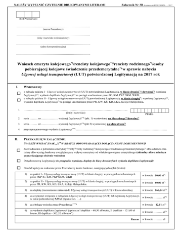 NALEŻY WYPEŁNIĆ CZYTELNIE DRUKOWANYMI LITERAMI Załącznik Nr 3B do umowy nr BSSK2-81820-…../2017 (kod Pracodawcy) ……………………………………………………………… (nazwa Pracodawcy) ……………………………………………………………… (imię i nazwisko wnioskodawcy) ………………………………………………………………. (adres korespondencyjny) ………………………………………………………………. Wniosek emeryta kolejowego*)/rencisty kolejowego*)/rencisty rodzinnego*)/osoby pobierającej kolejowe świadczenie przedemerytalne*) w sprawie nabycia Ulgowej usługi transportowej (UUT) potwierdzonej Legitymacją na 2017 rok I. WNIOSKUJĘ: o nabycie pakietu I - Ulgowej usługi transportowej (UUT) potwierdzonej Legitymacją, w klasie drugiej*) / dowolnej*), wymianę Legitymacji*), wydanie duplikatu Legitymacji*) na pociągi uruchamiane przez IC, KM, PKP SKM, WKD; o nabycie pakietu II - Ulgowej usługi transportowej (UUT) potwierdzonej Legitymacją, w klasie drugiej*), wymianę Legitymacji*), wydanie duplikatu Legitymacji*) na pociągi uruchamiane przez PR, KW, KŚ, KD, ŁKA, Koleje Małopolskie. 1. …………………………………………………………………………………………………... (imię i nazwisko) 2. seria ……… nr………………. wydanej 3. seria……… .nr………………..wydanej Legitymacji**) (pkt 2) wystawionej na klasę drugą*) 4. przyczyna ponownego wydania Legitymacji***) ……………………………………………………………………………………… II. Legitymacji**) (pkt. 1) wystawionej na klasę PESEL drugą*)/dowolną*) PRZEKAZUJĘ W ZAŁĄCZENIU: (NALEŻY WPISAĆ ZNAK „X” W KRATCE ODPOWIADAJĄCEJ DOŁĄCZANEMU DOKUMENTOWI) Zaświadczenie o pobieraniu emerytury*)/renty*)/renty rodzinnej*)/kolejowego świadczenia przedemerytalnego*) albo odcinek emerytury albo wyciąg bankowy uwzględniający wpływy emerytury od właściwego organu emerytalnego (aktualny albo z miesiąca poprzedzającego złożenie wniosku) Dotychczasową Legitymację (w przypadku wymiany, dopłaty do klasy dowolnej lub wydania duplikatu Legitymacji) Dowód wpłaty na wskazane przez Pracodawcę konto bankowe, następujących opłat (brutto): 1) za pakiet I - Ulgową usługę transportową (UUT) w klasie drugiej, w pociągach uruchamianych przez PKP IC, KM, PKP SKM, WKD w kwocie 50,00 zł*) 2) za pakiet II - Ulgową usługę transportową (UUT) w klasie drugiej, w pociągach uruchamianych przez PR, KW, KŚ, KD, ŁKA, Koleje Małopolskie. w kwocie 50,00 zł*) 3) za dopłatę (rozszerzenie zakresu) do Ulgowej usługi transportowej (UUT) w klasie dowolnej w kwocie 166,64 zł*) 4) za czynności związane z nabyciem Ulgowej usługi transportowej (UUT) lub wymianą Legitymacji, w kwocie ………. zł*) w cenie jednostkowej 5,95 zł (łącznie szt. ….) 5) za obsługę wniosku przez Pracodawcę****) w kwocie 6) za wydanie duplikatu Legitymacji (opłata za I duplikat – 60,50 zł brutto, II duplikat – 121,00 zł brutto, III duplikat – 302,52 zł brutto*)) w kwocie ………. zł*) Razem 12,51 zł*) w kwocie ………. zł OŚWIADCZENIE EMERYTA KOLEJOWEGO*)/RENCISTY KOLEJOWEGO*)/RENCISTY NEGO*)/OSOBY POBIERAJĄCEJ KOLEJOWE ŚWIADCZENIE PRZEDEMERYTALNE*): III. 1. 2. 3. 4. 5. RODZIN- Pobieram kolejową emeryturę*)/rentę*)/rentę rodzinną*)/kolejowe świadczenie przedemerytalne*) nr ................................................ Niezwłocznie poinformuję Pracodawcę za pośrednictwem którego została nabyta Ulgowa usługa transportowa (UUT) o zagubieniu lub kradzieży Legitymacji. Podane i zawarte przeze mnie w niniejszym wniosku dane są zgodne ze stanem faktycznym, co potwierdzam poniżej własnoręcznym podpisem. Zapoznałem/am się z „Zasadami odprawy osób uprawnionych do ulgowej usługi transportowej oraz do ulgi 70%”. Administratorem moich danych osobowych w rozumieniu przepisów ustawy z dnia 29 sierpnia 1997 roku o ochronie danych osobowych (Dz.U.2014.1182, 1662 z 2015 r. poz. 1309 j.t.) jest Spółka ………………………………………………… Zawarte w niniejszym wniosku dane osobowe są zbierane w celu realizacji procesu związanego z nabyciem Ulgowej usługi transportowej (UUT) na 2017 rok i w związku z tym zostaną udostępnione spółce „PKP Intercity” S.A. z siedzibą w Warszawie, 00848 Warszawa, ul. Żelazna 59a. Podanie danych osobowych jest dobrowolne, niemniej bez ich podania nie jest możliwe rozpatrzenie niniejszego wniosku. Oświadczam, iż zostałem/am poinformowany/a, iż przysługuje mi prawo dostępu do treści swoich danych osobowych oraz ich poprawiania. Wyrażam zgodę na przetwarzanie zawartych w niniejszym wniosku danych osobowych przez ………………………………………………………………………………………………………………………………. . .…..…………………………………………….………… (data, czytelny podpis wnioskodawcy) IV. POTWIERDZENIE PRZYJĘCIA WNIOSKU PRZEZ PRACODAWCĘ: 1. Wniosek sprawdzono pod względem merytorycznym i rachunkowym. 2. Potwierdza się uprawnienie emeryta kolejowego*)/rencisty kolejowego*)/rencisty rodzinnego*)/osoby pobierającej kolejowe świadczenie 3. 4. przedemerytalne*) do wnioskowanej Ulgowej usługi transportowej (UUT). Termin ważności Ulgowej usługi transportowej (UUT) zostaje ograniczony do dnia ……………………………. 2017 r. Ulgową usługę transportową (UUT) nabyto na 2017 r. – zamówienie nr ……………….. (zapis wg wzoru: 12_345_67) z dnia ………… (należy uzupełnić w przypadku wymiany, dopłaty do klasy dowolnej lub wydania duplikatu Legitymacji nabytej na 2017 r.) …………………………………………………………………… (data, podpis, pieczątka przyjmującego wniosek i pieczątka Pracodawcy) V. WYDANE LEGITYMACJE DLA EMERYTA KOLEJOWEGO*)/RENCIST