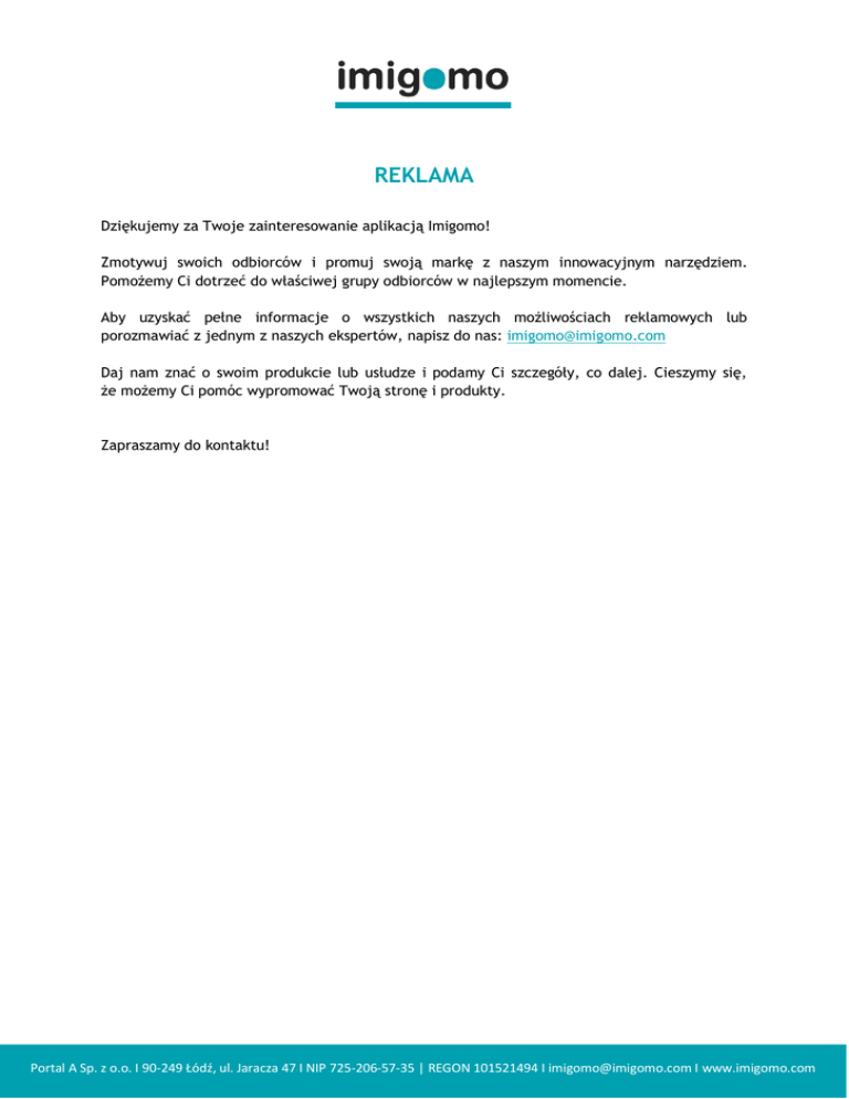 REKLAMA Dziękujemy za Twoje zainteresowanie aplikacją Imigomo! Zmotywuj swoich odbiorców i promuj swoją markę z naszym innowacyjnym narzędziem. Pomożemy Ci dotrzeć do właściwej grupy odbiorców w najlepszym momencie. Aby uzyskać pełne informacje o wszystkich naszych możliwościach reklamowych lub porozmawiać z jednym z naszych ekspertów, napisz do nas: [email protected] Daj nam znać o swoim produkcie lub usłudze i podamy Ci szczegóły, co dalej. Cieszymy się, że możemy Ci pomóc wypromować Twoją stronę i produkty. Zapraszamy do kontaktu! Portal A Sp. z o.o. I 90-249 Łódź, ul. Jaracza 47 I NIP 725-206-57-35 | REGON 101521494 I [email protected] I www.imigomo.com
