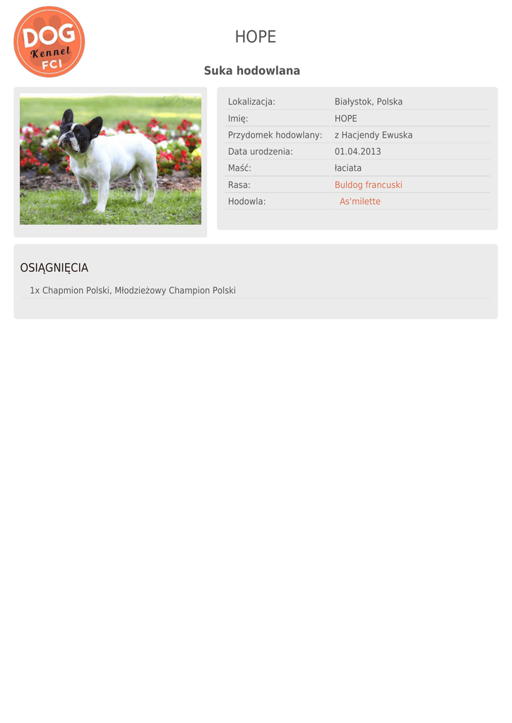 HOPE Suka hodowlana Lokalizacja: Białystok, Polska Imię: HOPE Przydomek hodowlany: z Hacjendy Ewuska Data urodzenia: 01.04.2013 Maść: łaciata Rasa: Buldog francuski Hodowla: OSIĄGNIĘCIA 1x Chapmion Polski, Młodzieżowy Champion Polski As'milette