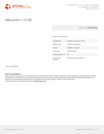 SK-FARM II Sp. z o.o. - Apteka Internetowa ul. Kleeberga 34, Białystok +48 42 279 40 05 Alka-prim x 10 tbl Cena: 7,45 PLN Opis słownikowy Dostępność Dostępny w aptece w 24h Opakowanie 10 tabl musujących Postać Tabletki musujące Producent POLPHARMA Rodzaj rejestracji Lek Substancja czynna Acidum acetylsalicylicum Opis produktu Informacje dodatkowe Przed użyciem zapoznaj się z ulotką dołączoną do opakowania, która zawiera wskazania, przeciwwskazania, dane dotyczące działań niepożądanych i dawkowanie oraz informacje dotyczące stosowania i przechowywania produktu leczniczego, bądź skonsultuj się z lekarzem lub farmaceutą, gdyż każdy lek niewłaściwie stosowany zagraża Twojemu życiu lub zdrowiu. Służymy Państwu pomocą pod adresem [email protected]. Plik wygenerowano: 04-03-2017 Powered by TCPDF (www.tcpdf.org) Oprogramowanie sklepu: AptusShop