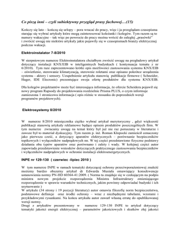 Co piszą inni – czyli subiektywny przegląd prasy fachowej…(15) Kończy się lato – kończą się urlopy – pora wracać do pracy, więc i ja przeglądam czasopisma starając się wybrać artykuły które mogą zainteresować koleżanki i kolegów. Tym razem są to numery wakacyjne – tak więc po powrocie do pracy można wrócić do zaległej „prasówki” i zwrócić uwagę nie niektóre artykuły jakie pojawiły się w czasopismach branży elektrycznej podczas wakacji. Elektroinstalator 7-8/2010 W sierpniowym numerze Elektroinstalatora chciałbym zwrócić uwagę na przgładowy artykuł dotyczący instalacji KNX/EIB w inteligentnych budynkach ( kontynuacja tematu z nr 6/2010). Tym raze zaprezentowano krótki opis możliwości zastosowania systemu KNX/EIB – oświetlenie, sterowanie klimatyzacją, sterownie roletami oraz opisano pokrótce urządzenia systemu - aktory i sensory. Uzupełnienie artykułu stanowią publikacje firmowe ( Schneider, Hager, IDE Elecronic) prezentujące swoja ofertę produktów dla systemu KNX/EIB. Dla kolegów projektantów może być interesująca informacja, że ofercie Scheidera pojawił się nowy program Rapsody do projektowania rozdzielnic Prisma PLUS, o czym informuje zamieszona 1 stronicowa informacja ( opis różnic w stosunku do poprzednich wersji programów projektowych). Elektrosystemy 8/2010 W numerze 8/2010 miesięcznika ciężko wybrać artykuł merytoryczny , gdyż większość publikacji stanowią artykuły reklamowe będące opisem produktów poszczególnych firm. W tym numerze zwracamy uwagę na temat który był już nie raz poruszany w literaturze i zawsze był to materiał dyskusyjny. Tym razem p. inż. Roman Kłopocki zamieścił oznaczony jako pierwsza cześć, a dotyczący aparatów elektrycznych – porównanie bezpieczników topikowych i wyłączników nadprądowych nn. W tej części przedstawiono fizyczne podstawy działania obu typów aparatów oraz porównano i zalety i wady. W kolejnej części autor zapowiada przedstawienie wniosków dotyczących praktycznego zastosowania bezpieczników i wyłączników nadprądowych w ochronie instalacji elektroenergetycznych. INPE nr 129-130 ( czerwiec -lipiec 2010 ) W tym numerze INPE w ramach tematyki dotyczącej ochrony przeciwporażeniowej znaleźć możemy bardzo obszerny artykuł dr Edwarda Musiała omawiający konsekwencje ustanowienia normy PN-HD 60364-41:2009. ( Norma ta znajduje się w czekającym na podpis ministra nowym projekcie rozporządzenia Ministra Infrastruktury zmieniającego rozporządzenie w sprawie warunków technicznych, jakim powinny odpowiadać budynki i ich usytuowanie ) W artykule (34 strony i 19 pozycji literatury) autor omawia filozofię norm bezpieczeństwa, podstawowe definicje oraz środki ochrony – wraz z niezbędnymi tabelami, wzorami i przykładowymi rysunkami. Na końcu artykułu autor zawarł własną erratę do opublikowanej wersji normy. Drugi z artykułów prezentowany w numerze 129-130 INPE to artykuł dotyczący tematyki jakości energii elektrycznej – parametrów jakościowych i skutków złej jakości energii. Jest to nasz krakowski akcent w biuletynie, bo autorami artykułu są członkowie krakowskiego oddziału SEP - kol. Katarzyna Strzałka i kolega Jan Strzałka. A artykule w sposób przeglądowy przedstawiono wpływ pogorszenia parametrów jakościowych energii elektrycznej na pracę urządzeń elektroenergetycznych ( silniki, kondensatory, aparatura łączeniowa, sprzęt informatyczny ) spowodowane przez różnego rodzaju zakłócenia ( zapady napięcia, asymetria napięcia, wyższe harmoniczne itd.). W drugiej części artykułu , która ukaże się w kolejnym numerze INPE przedstawione zostaną sposoby poprawy niezawodności zasilania urządzeń elektroenergetycznych. Elektro-Info nr 7-8/2010 W wakacyjnym numerze miesięcznika redakcja zamieściła przegląd dostępnych na polskim rynku transformatorów rozdzielczych SN/nn ( olejowych i żywicznych). Oprócz tego w ramach powakacyjnej „prasówki” polecam artykuł o oświetleniu obiektów sakralnych. Autor ( w.Bobrowski) prezentuje rozwiązania oświetlenia zewnętrznego i wewnętrznego rożnych świątyń ( katolickich, prawosławnych, meczetów ,synagog ) zwracając uwagę na sposób wydobycia odpowiednich efektów związanych z kulturą i tradycją. de Der Elektro- Und Gebäudetechniker 15-16 /2010 W tym numerze znajdziemy dwa ciekawe artykuły dotyczące problematyki ochrony odgromowej i przeciwprzepięciowej. Pierwszy za artykułów ( sygnowany jako część nr 1 ) omawia problem ochrony przepięciowej w instalacjach elektrycznych zgodnie z zapisami najnowszych wersji norm. Zwrócono w nim uwagę na sposób podejścia do oceny zagrożenia przepięciami w instalacjach elektrycznych zgodnie z arkuszem 443 , gdzie należy dokonać analizy ryzyka. Drugi z artykułów dotyczy problematyki ochrony odgromowej obiektów zabytkowych , czyli również sposobu pogodzenia walorów estetycznych z koniecznością zapewnienia bezpieczeństwa. Zwrócono uwagę na konieczność obliczeń bezpiecznego odstępu izolacyjnego oraz możliwość stosowania izolowanych przewodów odprowadzających. Elektropraktiker 8/2010 W tym numerze chcemy zwrócić uwagę na artykuł dotyczący bezpieczeństwa w instalacjach elektrycznych z „klasycznym zerowaniem” gdyż tego typu instalacje występują jeszcze w wielu polskich mieszkaniach. Autor przedstawia historię tego środka ochrony , który pojawił w roku 1913 z inicjatywy firmy AEG, a następnie omawia zagrożenia związane z tym systemem ochrony . Dla praktyków przedstawiono w tabeli sposób postępowania w przypadku przeróbek, modernizacji ,rozbudowy instalacji elektrycznej – rozwiązania zalecenia, akceptowalne i niedopuszczalne. Elektronik 8/2010 Czasopismo , nie do końca z naszej instalacyjnej branży ale tym razem chciaL~bym zwrócić uwagę na zamieszczony w nim przegląd polskich producentów i dystrybutorów mierników wielkoś