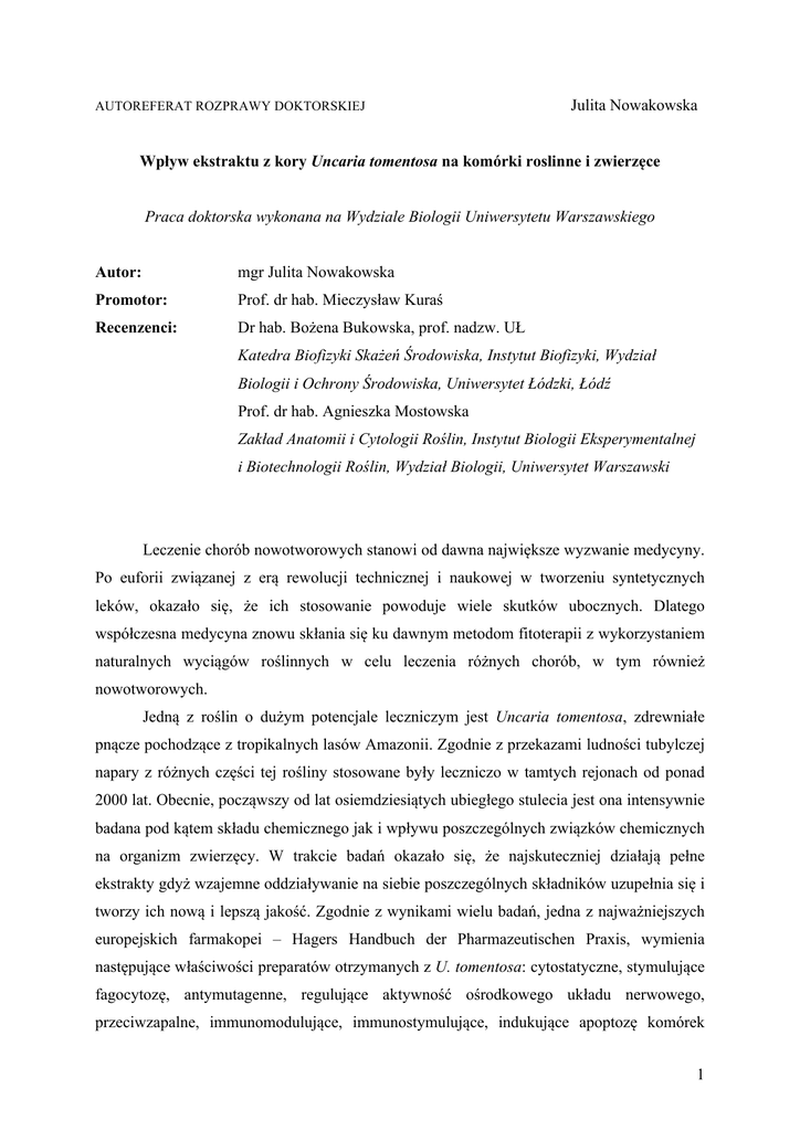 AUTOREFERAT ROZPRAWY DOKTORSKIEJ Julita Nowakowska Wpływ ekstraktu z kory Uncaria tomentosa na komórki roslinne i zwierzęce Praca doktorska wykonana na Wydziale Biologii Uniwersytetu Warszawskiego Autor: mgr Julita Nowakowska Promotor: Prof. dr hab. Mieczysław Kuraś Recenzenci: Dr hab. Bożena Bukowska, prof. nadzw. UŁ Katedra Biofizyki Skażeń Środowiska, Instytut Biofizyki, Wydział Biologii i Ochrony Środowiska, Uniwersytet Łódzki, Łódź Prof. dr hab. Agnieszka Mostowska Zakład Anatomii i Cytologii Roślin, Instytut Biologii Eksperymentalnej i Biotechnologii Roślin, Wydział Biologii, Uniwersytet Warszawski Leczenie chorób nowotworowych stanowi od dawna największe wyzwanie medycyny. Po euforii związanej z erą rewolucji technicznej i naukowej w tworzeniu syntetycznych leków, okazało się, że ich stosowanie powoduje wiele skutków ubocznych. Dlatego współczesna medycyna znowu skłania się ku dawnym metodom fitoterapii z wykorzystaniem naturalnych wyciągów roślinnych w celu leczenia różnych chorób, w tym również nowotworowych. Jedną z roślin o dużym potencjale leczniczym jest Uncaria tomentosa, zdrewniałe pnącze pochodzące z tropikalnych lasów Amazonii. Zgodnie z przekazami ludności tubylczej napary z różnych części tej rośliny stosowane były leczniczo w tamtych rejonach od ponad 2000 lat. Obecnie, począwszy od lat osiemdziesiątych ubiegłego stulecia jest ona intensywnie badana pod kątem składu chemicznego jak i wpływu poszczególnych związków chemicznych na organizm zwierzęcy. W trakcie badań okazało się, że najskuteczniej działają pełne ekstrakty gdyż wzajemne oddziaływanie na siebie poszczególnych składników uzupełnia się i tworzy ich nową i lepszą jakość. Zgodnie z wynikami wielu badań, jedna z najważniejszych europejskich farmakopei – Hagers Handbuch der Pharmazeutischen Praxis, wymienia następujące właściwości preparatów otrzymanych z U. tomentosa: cytostatyczne, stymulujące fagocytozę, antymutagenne, regulujące aktywność ośrodkowego układu nerwowego, przeciwzapalne, immunomodulujące, immunostymulujące, indukujące apoptozę komórek 1 nowotworowych, antykoncepcyjne, antyoksydacyjne, przeciwwirusowe, przeciwobrzękowe i wiele innych. Stawiając sobie za główny cel wyjaśnienie mechanizmu antynowotworowego działania, wodnego ekstraktu z kory U. tomentosa, przeprowadzono szereg eksperymentów z użyciem różnorodnego materiału badawczego. Obiektem badań były komórki roślinne (test Allium) i zwierzęce: limfocyty i granulocyty mysie, linia komórek ostrej białaczki L1210, komórki guza płuca L1-Sarcoma oraz ludzkie komórki linii białaczkowej HL60, hodowane in vitro. Dodatkowo przeprowadzono in vivo testy na zwierzętach eksperymentalnych (myszy). Postawiono sobie za cel wyjaśnienie zagadnienia dwoistości działania ekstraktu na organizm zwierzęcy w postaci stymulacji odpowiedzi immunologicznej i jednoczesnej inhibicji rozwoju nowotworu. Wykorzystano różnorodne metody badawcze chcąc wykazać szerokie spektrum działania ekstraktu oraz jego uniwersalność, niezależnie od rodzaju komórek. Na pierwszym etapie badań skupiono się na przebadaniu wpływu ekstraktu na proliferację komórek roślinnych i zwierzęcych, biorąc pod uwagę indeks mitotyczny i fazowy, morfologię chromosomów, poziom jądrowego DNA oraz zmiany cytoszkieletu tubulinowego. Dodatkowo zbadano wpływ ekstraktu na poziom oddychania komórkowego i ultrastrukturę. Wyniki otrzymane w tej części pracy wykazały, że mechanizm antymitotycznego działania wodnego ekstraktu z kory Uncaria tomentosa cechuje wielokierunkowość przejawiająca się w oddziaływaniu na różne elementy strukturalne komórki. Obserwowano m.in. zmiany struktury jądra komórkowego i chromosomów, cytoszkieletu komórki oraz zmiany struktury i fizjologii mitochondriów. W związku z licznymi doniesieniami o dwojakim działaniu ekstraktu (stymulującym i inhibującym), w drugiej części badań został on przebadany pod kątem wpływu na przeżywalność, liczebność i rodzaj wywoływanej śmierci komórek (nekroza, apoptoza) zmienionych nowotworowo (linia ostrej mysiej białaczki limfocytarnej – L1210) i komórek zdrowych (limfocyty krwi obwodowej myszy). W tym celu opracowano taki układ eksperymentalny aby jednoznacznie określić wpływ ekstraktu na zdrowe komórki i zmienione nowotworowo a także wykluczyć możliwość stymulacji rozwoju choroby nowotworowej w trakcie stosowania niskich dawek preparatu (przyjętych za stymulujące). Otrzymane wyniki badań wyraźnie pokazały, że wodny ekstrakt z kory Uncaria tomentosa wykazuje zróżnicowane działanie, w zależności od rodzaju komórek docelowych. Ekstrakt działał na komórki nowotworowe antymitotycznie i indukował ich śmierć na drodze apoptozy. Te same stężenia ekstraktu użyte w hodowli komórek zdrowych, wykazały wyraźny efekt cytoprotekcyjny, zwiększając przeżywalność komórek a tym samym wpływajac na ich 2 liczebność. Interesującym wynikiem badań było wykazanie, że niskie dawki ekstraktu nie powodują stymulacji proliferacji komórek zmienionych nowowtworowo (HL60 i L1210). Ostatnią część badań stanowiły testy na zwierzętach eksperymentalnych, które w założeniu miały ostatecznie potwierdzić skuteczność działania ekstraktu na organizm zwierzęcy. Podczas testów in vivo wykazano charakterystyczną dwoistość działania ekstraktu. Z jednej strony podawanie eksytraktu myszom powodowało silną stymulację odpowiedzi komórkowej i humoralnej układu odpornościowego a z drugiej, efektywnie hamowało wzrost i rozwój nowotworu, poprzez aktywną inhibicję angiogenezy nowotworowej oraz bezpośrednią indukcję apoptozy w komórkach nowotworowych. Prezentowane wyniki pracy dowodzą, że wodny ekstrakt z kory Uncaria tomentosa wykazuje bezpośrednie, silne działanie inhibicyjne w stosunku do zmienionych nowotworowo komórek, jednocześn
