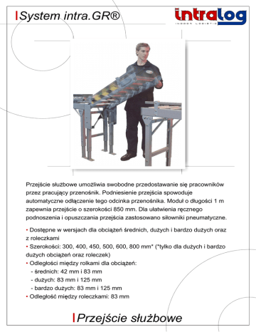 System intra.GR® Przejście służbowe umożliwia swobodne przedostawanie się pracowników przez pracujący przenośnik. Podniesienie przejścia spowoduje automatyczne odłączenie tego odcinka przenośnika. Moduł o długości 1 m zapewnia przejście o szerokości 850 mm. Dla ułatwienia ręcznego podnoszenia i opuszczania przejścia zastosowano siłowniki pneumatyczne. • Dostępne w wersjach dla obciążeń średnich, dużych i bardzo dużych oraz z roleczkami • Szerokości: 300, 400, 450, 500, 600, 800 mm* (*tylko dla dużych i bardzo dużych obciążeń oraz roleczek) • Odległości między rolkami dla obciążeń: - średnich: 42 mm i 83 mm - dużych: 83 mm i 125 mm - bardzo dużych: 83 mm i 125 mm • Odległość między roleczkami: 83 mm Przejście służbowe System intra.GR® Średnie obciążenie MD Bardzo duże obciążenie EHD Ładunki do 80 kg na metr. Rolka: średnica 35 mm, grubość ścianki 1.22 mm Profil typu C: 90 mm x 35 mm x 1.5 mm Ładunki do 110 kg na metr. Rolka: średnica 51 mm, grubość ścianki 3.2 mm Profil typu C: 90 mm x 35 mmx 2.5 mm Duże obciążenie HD Roleczki Skatewheel Ładunki do 110 kg na metr. Rolka: średnica 50 mm, grubość ścianki 1.5 mm Profil typu C: 90 mm x 35 mm x 2.5 mm Ładunki do 80 kg na metr. Profil typu C: 90 mm x 35 mm x 1.5 mm Roleczka: 48 mm (średnica) x 16 mm (szerokość) z Acetalu z kulkami węglowo-chromowymi umieszczonymi w 2 koszyczkach ok. 5 stopni 1000 Kierunek transportu Zawias trzpienia Korytka pomostowe Trzpie Podpora Podpora pneumatyczny Przejście służbowe Intralog Sp. z o.o. tel. 091 311 39 50 fax: 091 442 20 63 e-mail: [email protected] www.intralog.pl